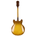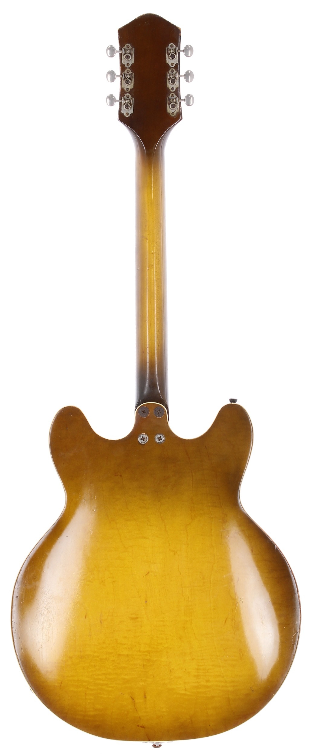 1962 Harmony H-75 hollow body thinline electric guitar, made in USA; Body: yellow burst finished maple, repaired cracks to bass and treble sides, lacquer checking and various dings throughout; Neck: maple, minor dings; Fretboard: rosewood; Frets: good, refret; Electrics: working, some jack intermittence; Hardware: generally good, minor tarnishing to metal parts, replacement strap button; Case: compressed foam case; Weight: 3.31kg; Overall condition: fair