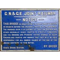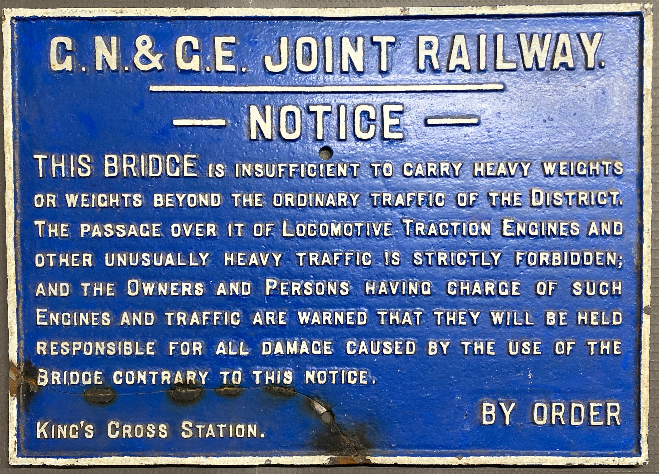A Great Northern and Great Eastern Joint Railway Bridge Notice Cast Iron Railway Sign measuring 68cm 27" long x 48cm 19" King's Cross Station, Repair made to bottom left, Notice Extract "This Bridge is insufficient to carry heavy weights or weights beyond the ordinary traffic of the district......." Face and Rear appear Original - Fair Condition 18000g Suggest collect or use 'Pack and Send Courier'