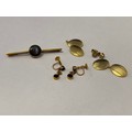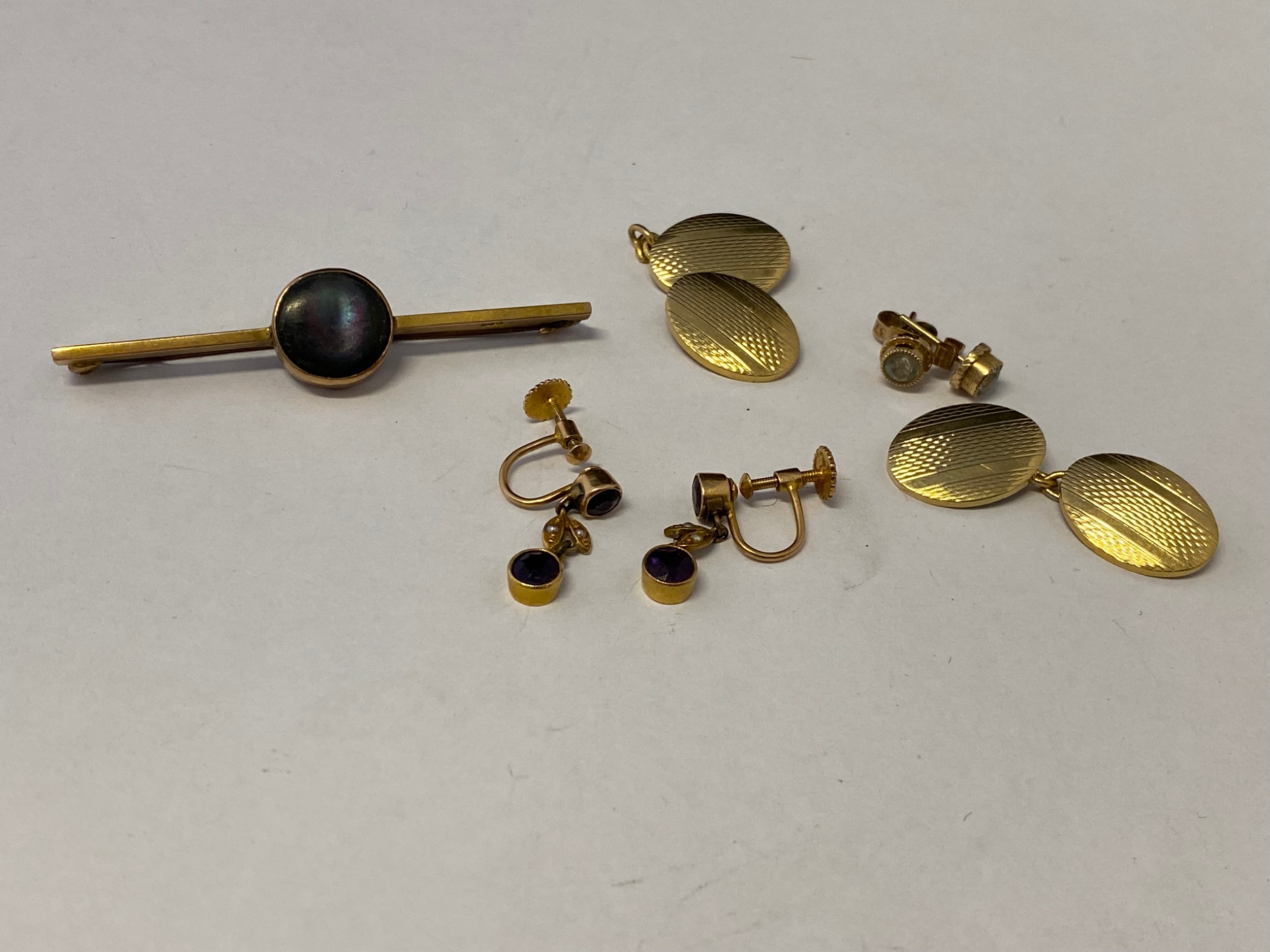 A pair of gold coloured metal cufflinks with engine turned decoration, a 9ct. gold bar brooch set mother of pearl, a pair of gold coloured metal earrings set amethyst and seed pearls and a pair of gold dress studs