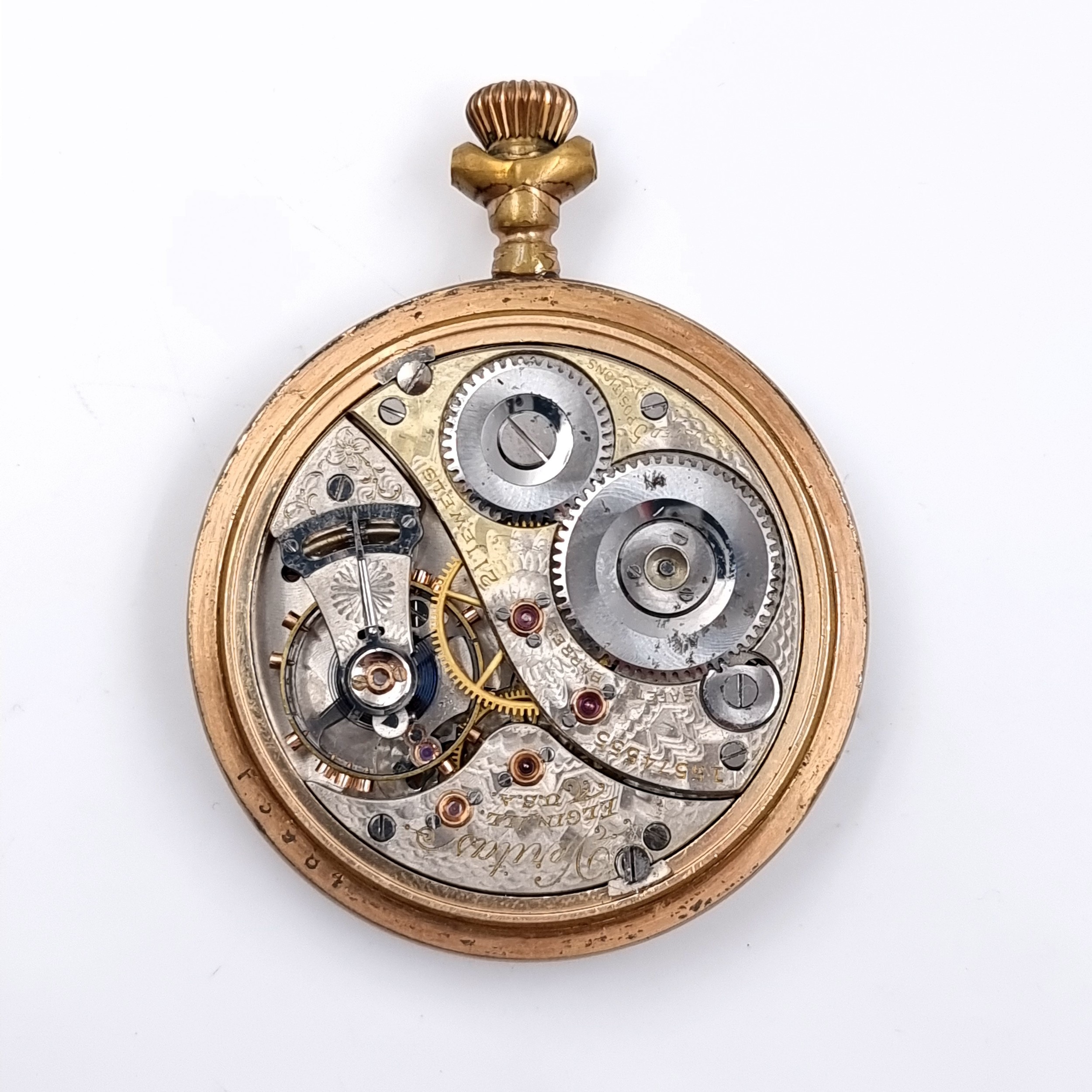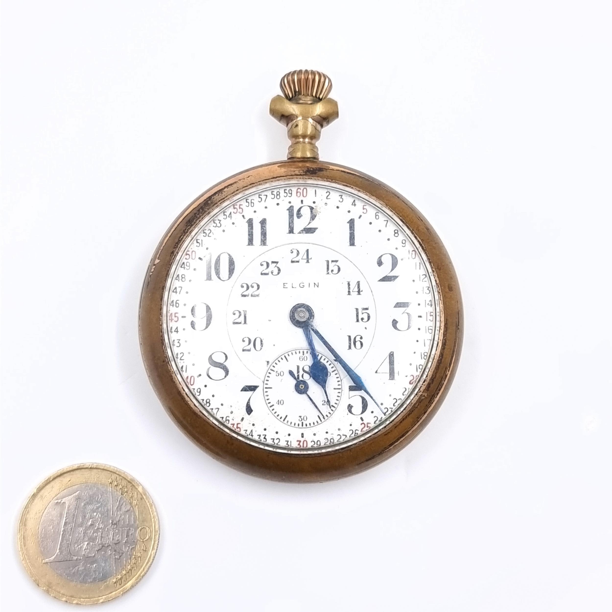 An usual Elgin pocket watch 21 jewel with rare 24 hour dial. Watch no. 699347 Veritas Elgin Ill U.S.A. MM: 5cm diameter. Weight 121 grams. Rolled Gold.
