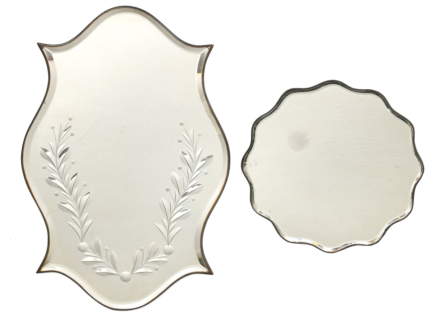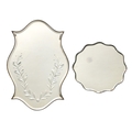 A Venetian style etched serpentine mirror-tray, early 20th c, with bevelled edge, 46 x 31cm and another similar, 26cm diam (2)
