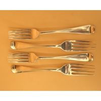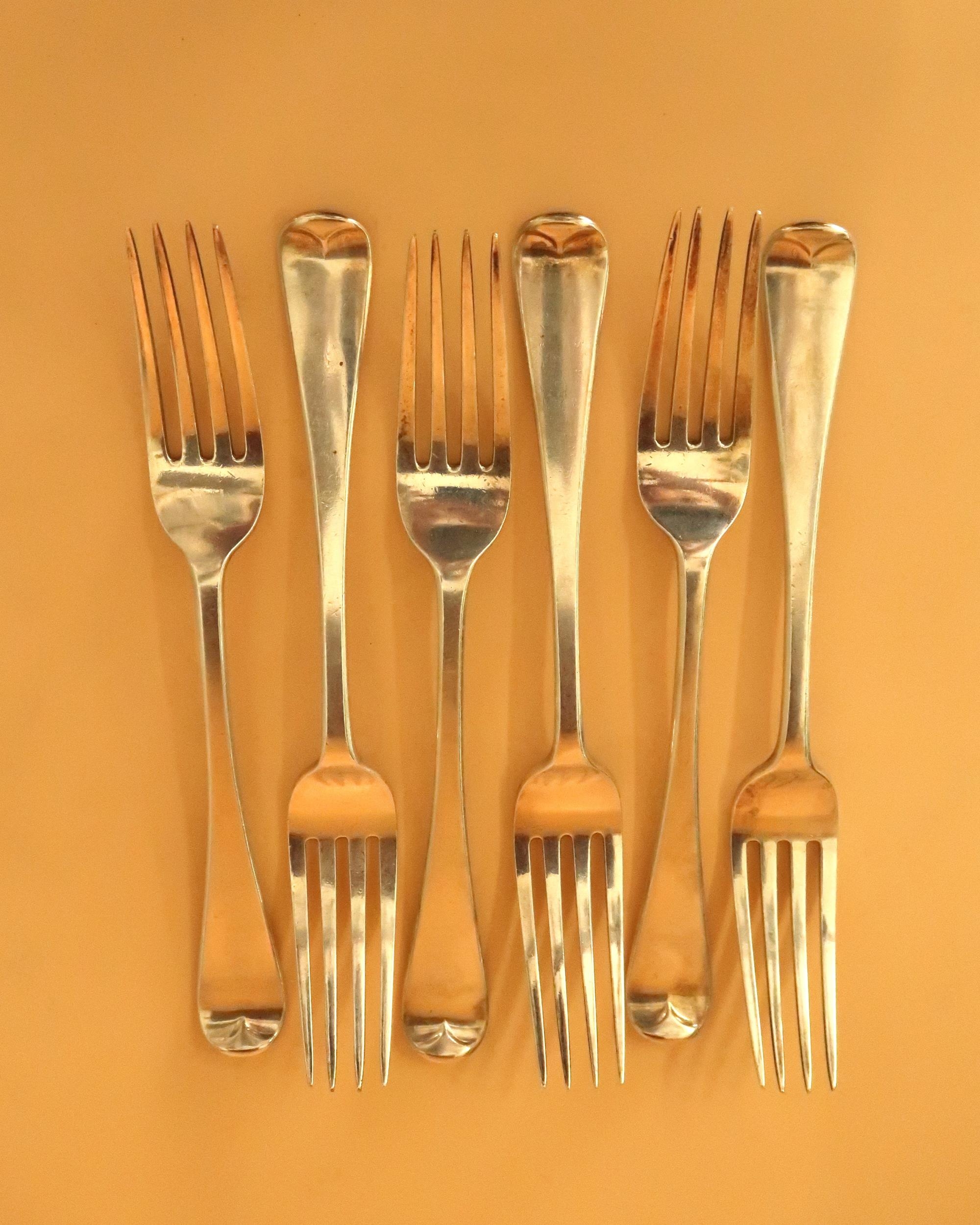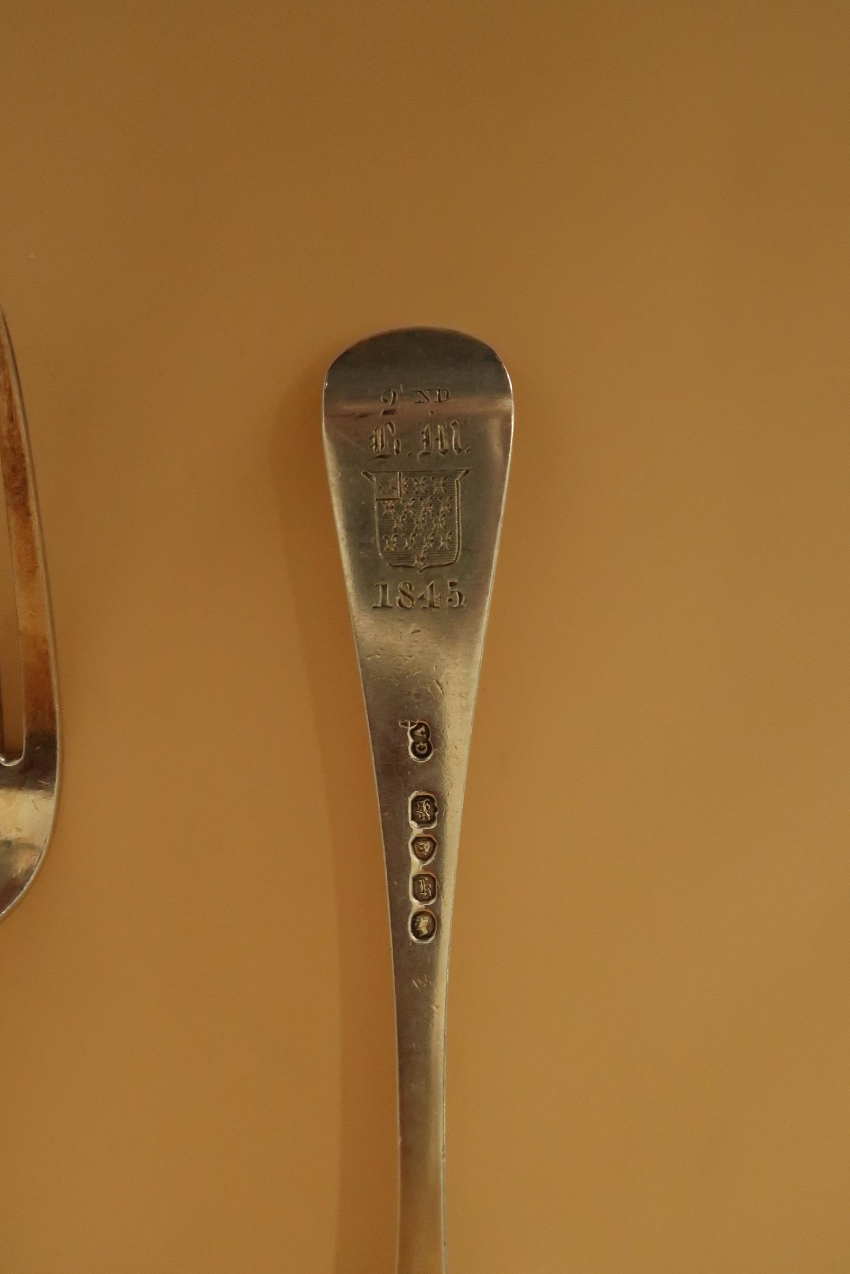 A set of six early Victorian silver large forks in the Hanovarian pattern all armorial engraved with 2nd B.M. above shield, with 1845 below, Chawner & Co (George William Adams), London 1845, each 20cm long, total weight 15.41toz.