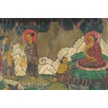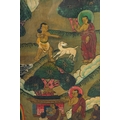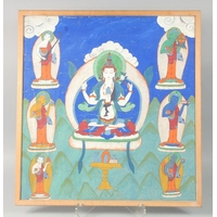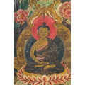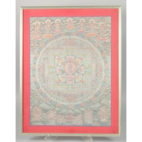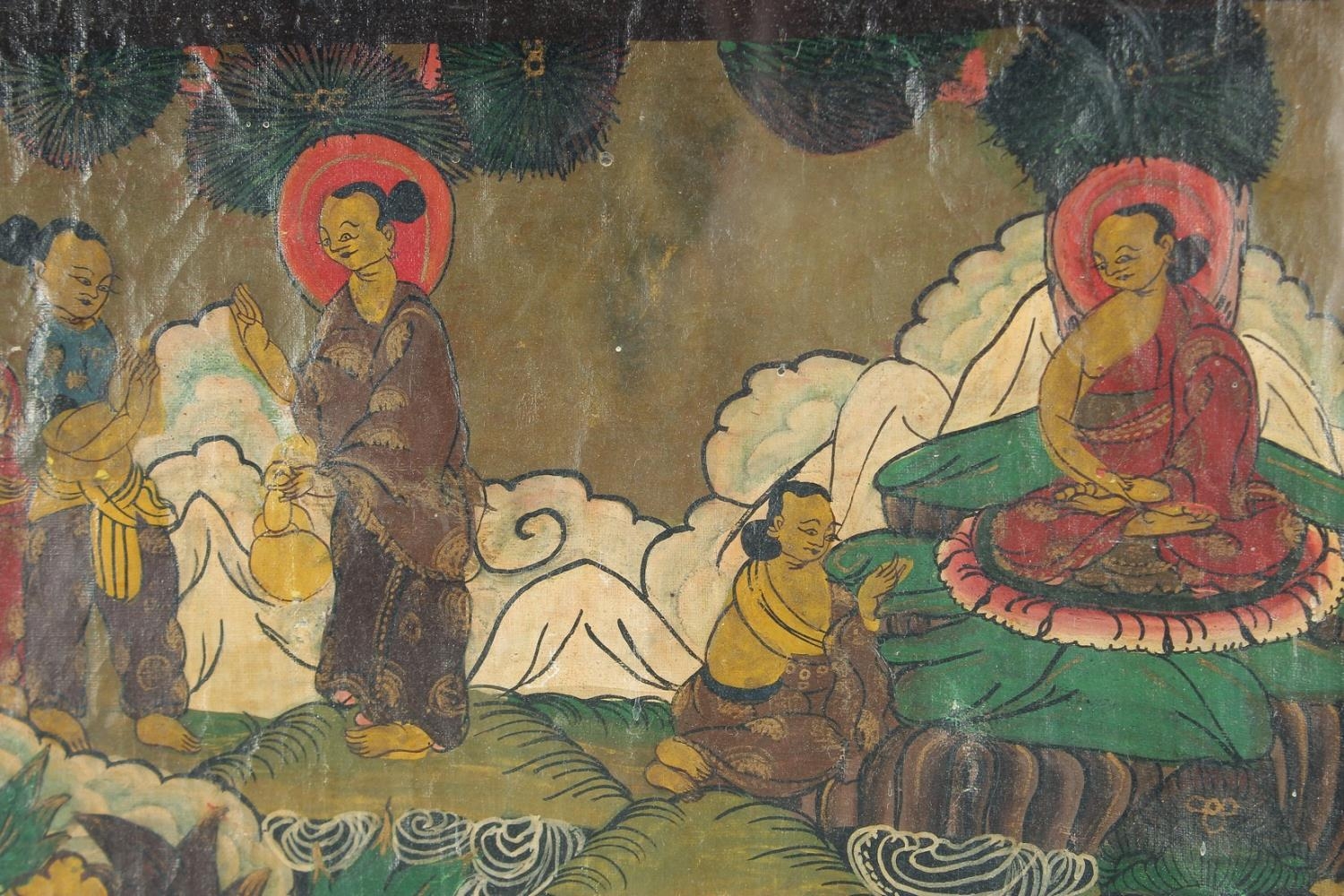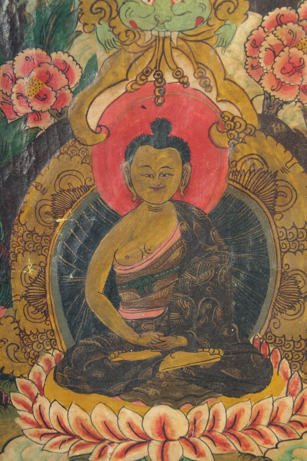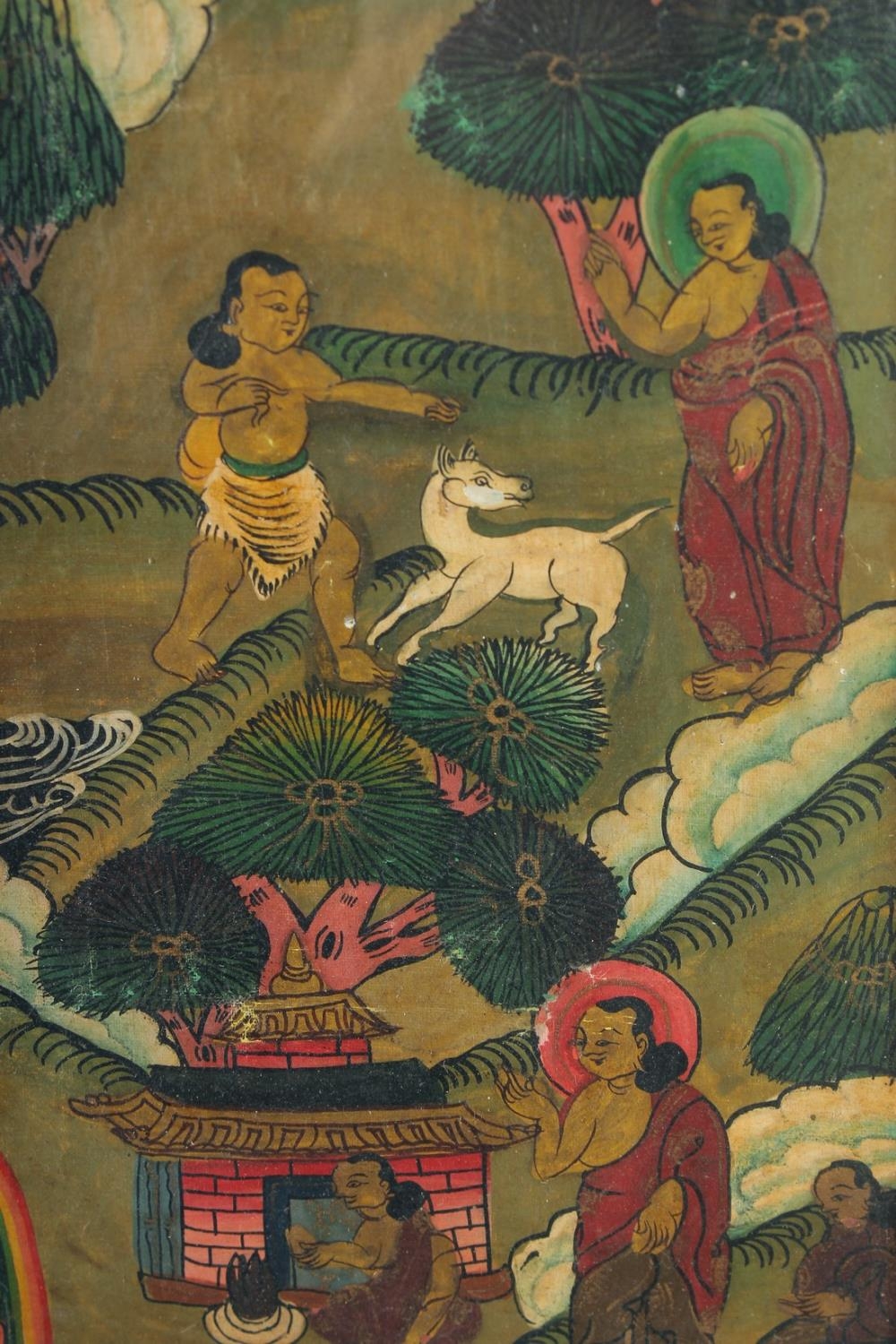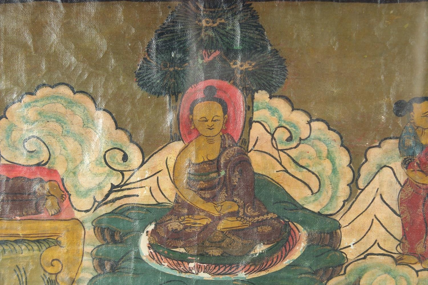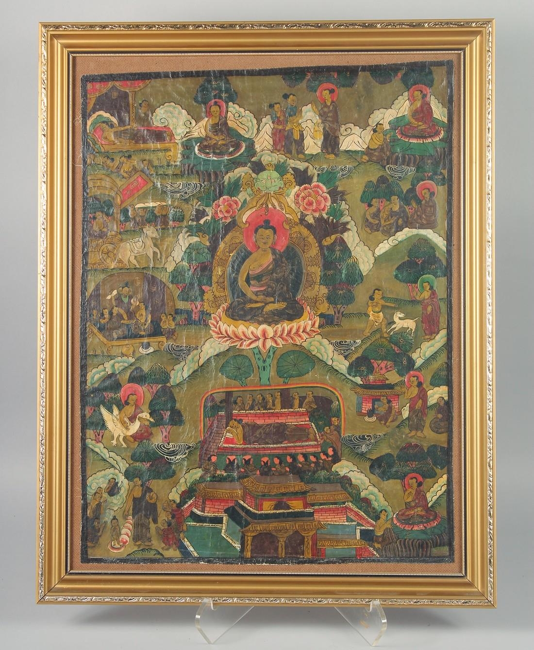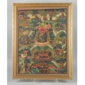 A FRAMED TIBETAN THANGKA PAINTING, with central buddha and various scenes, framed and glazed, image 55.5cm x 42cm.