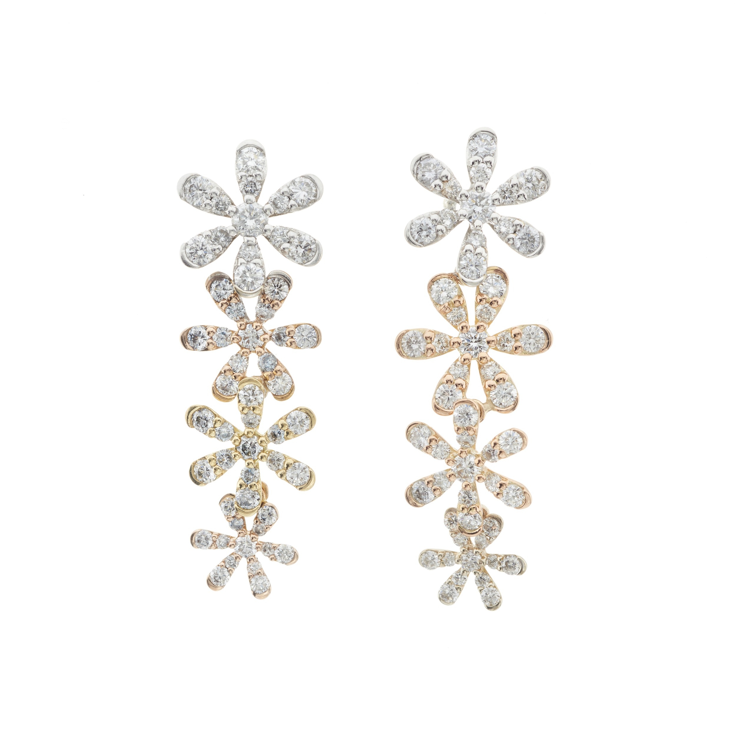 A pair of 18ct tri-colour gold brilliant-cut diamond flower cluster drop earrings, estimated total diamond weight 1.60ct, H-I colour, VS2-SI1 clarity, mount stamped 750, length 3.2cm, 5.5g