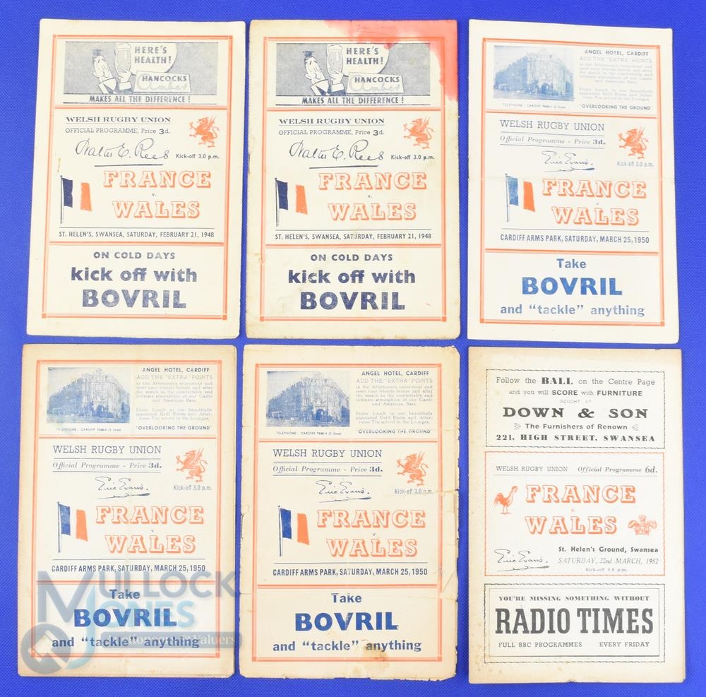 1948-52 Wales v France Rugby Programmes (6): With some duplication, issues from 1948 (2), 50 (3) and 52, the last pair both Wales Grand Slam years. Dealer's delight?