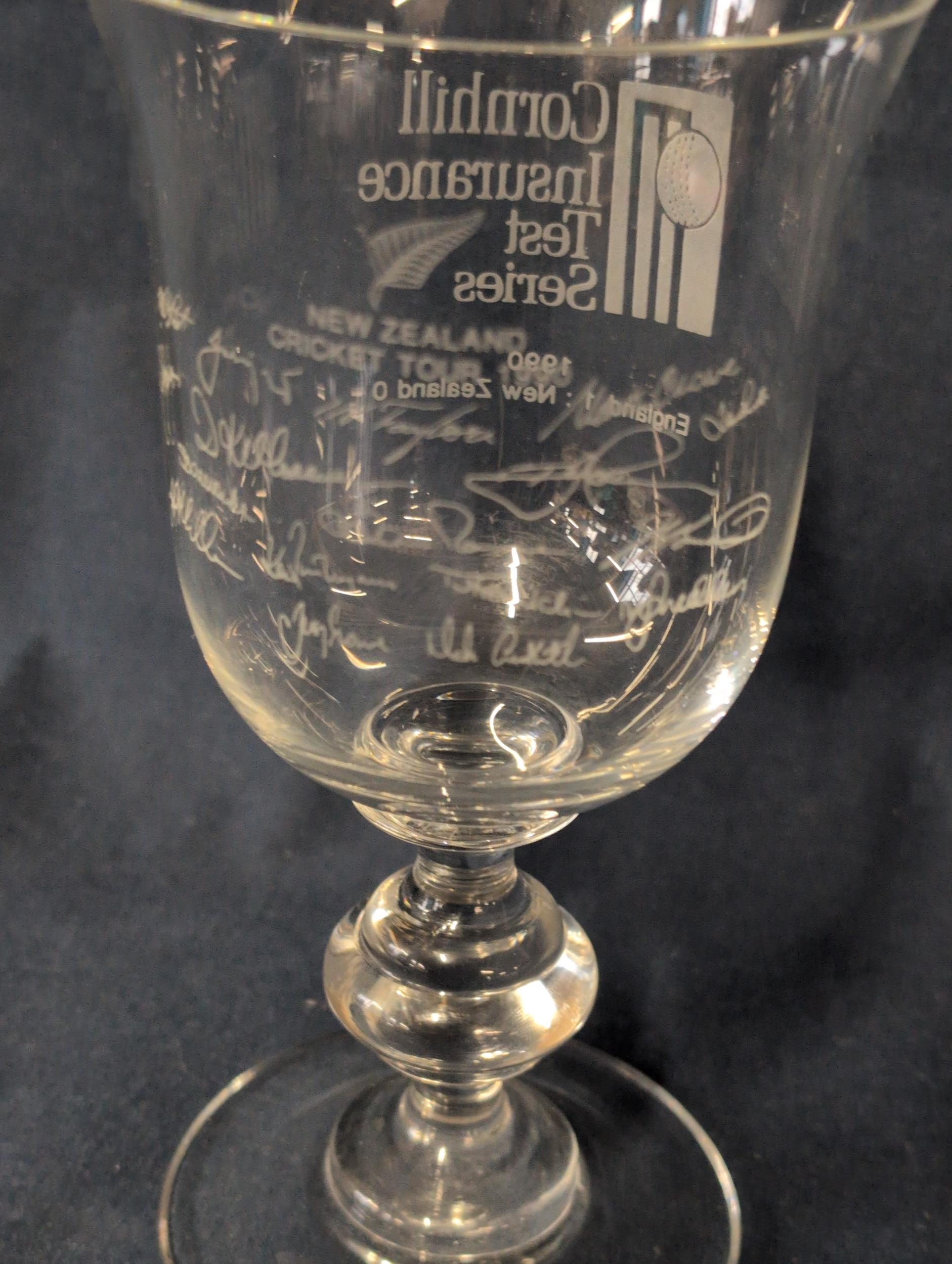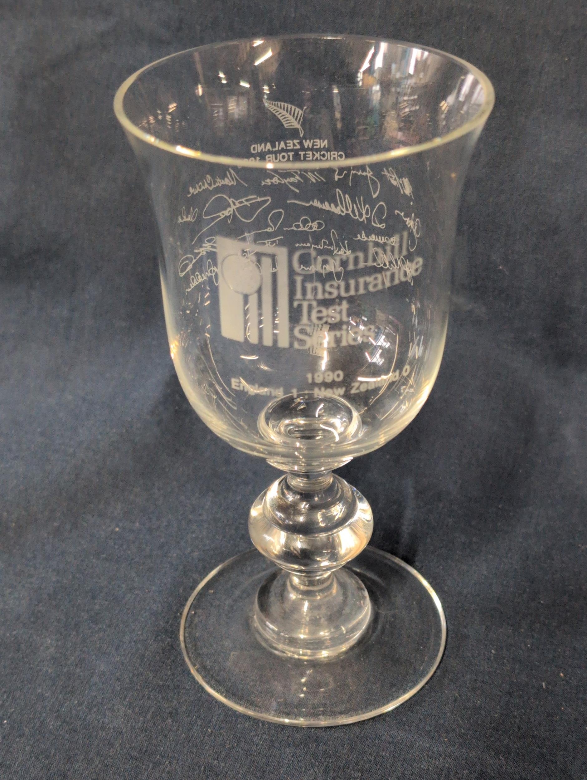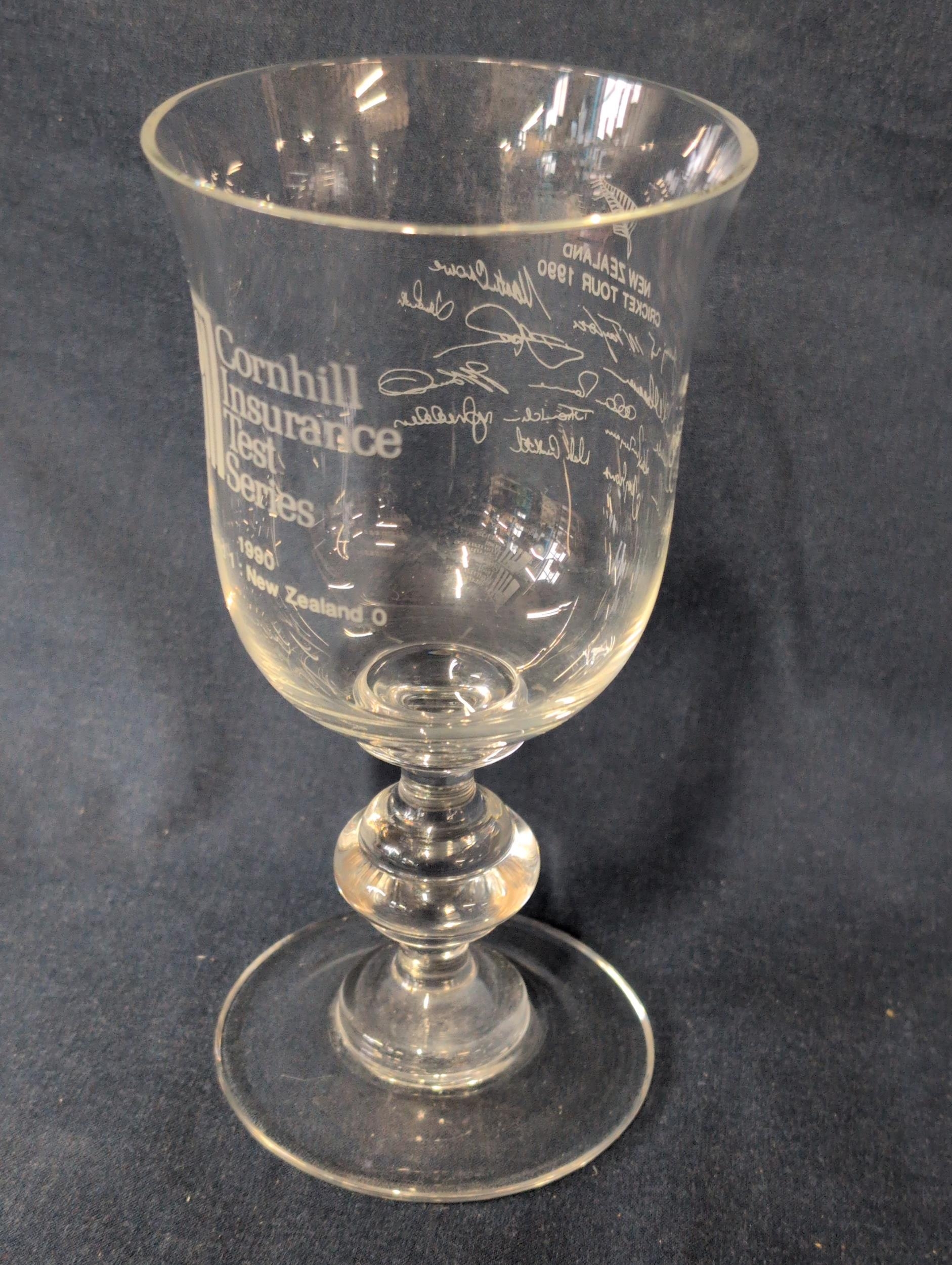 Cornhill Insurance Test Series Cricket 1980 Commemorative Glass Goblet. With etched signatures. H 17cm