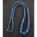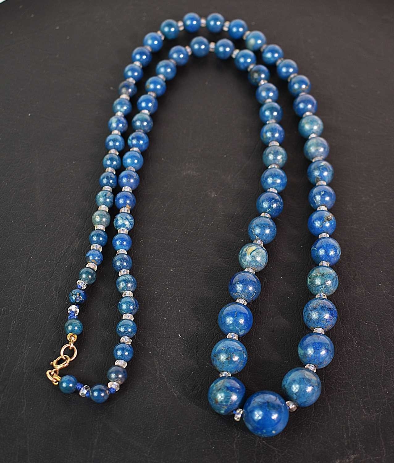 A 9ct gold, blue stone and crystal beaded necklace, the graduated blue/turquoise stone beads interspersed by smaller crystal beads, with gold hoop clasp.