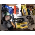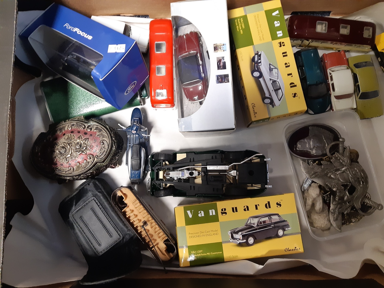 A mixed lot, to include die cast toys, belt buckles, plated box and contents, binoculars etc -