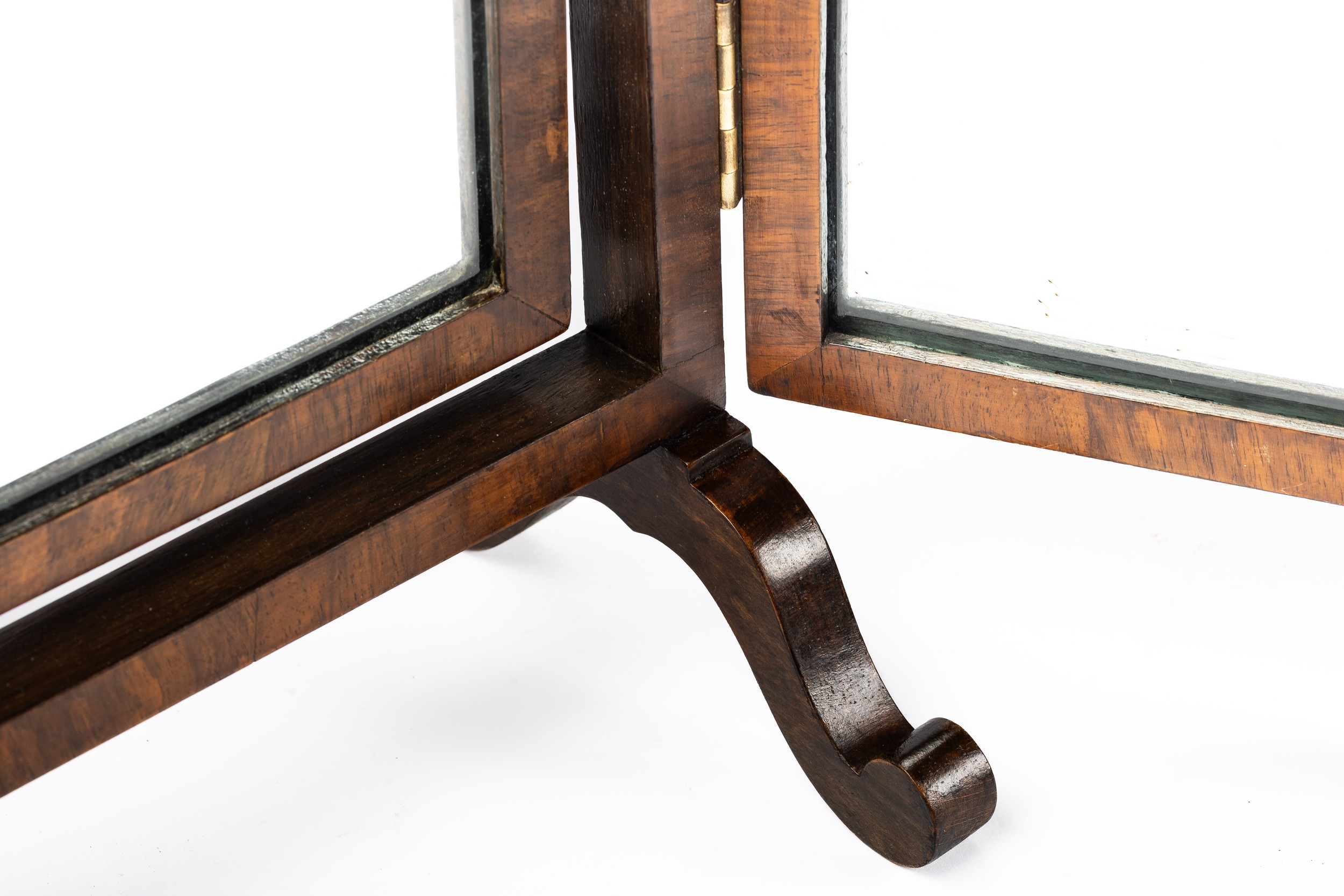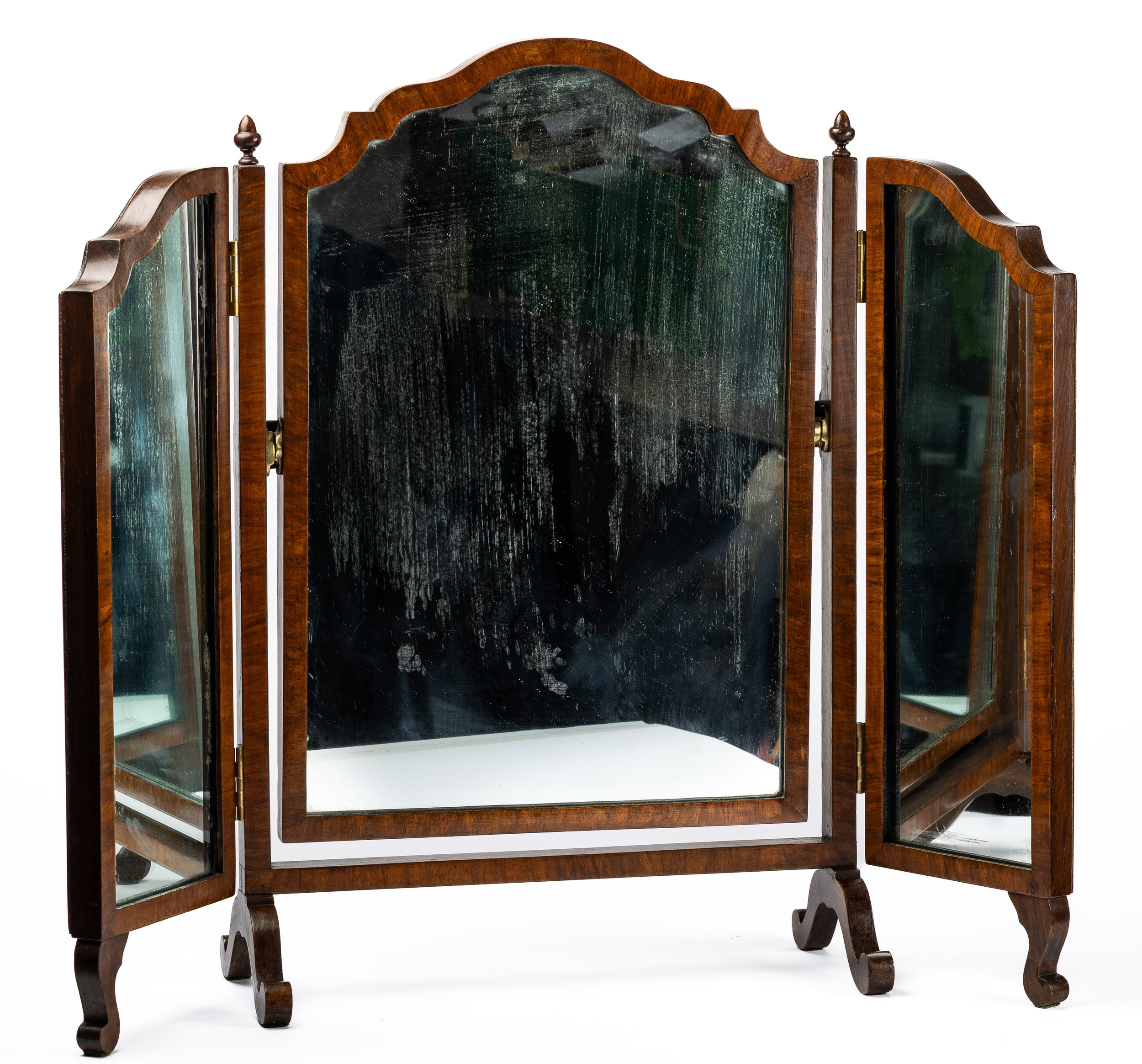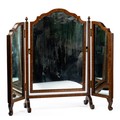 An Edwardian mahogany triple dressing table mirror, the arched top above splayed supports