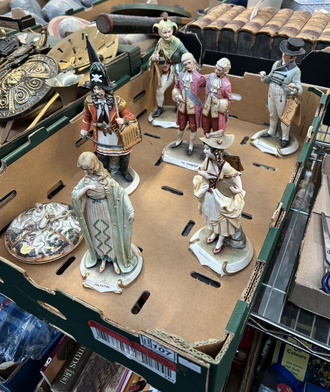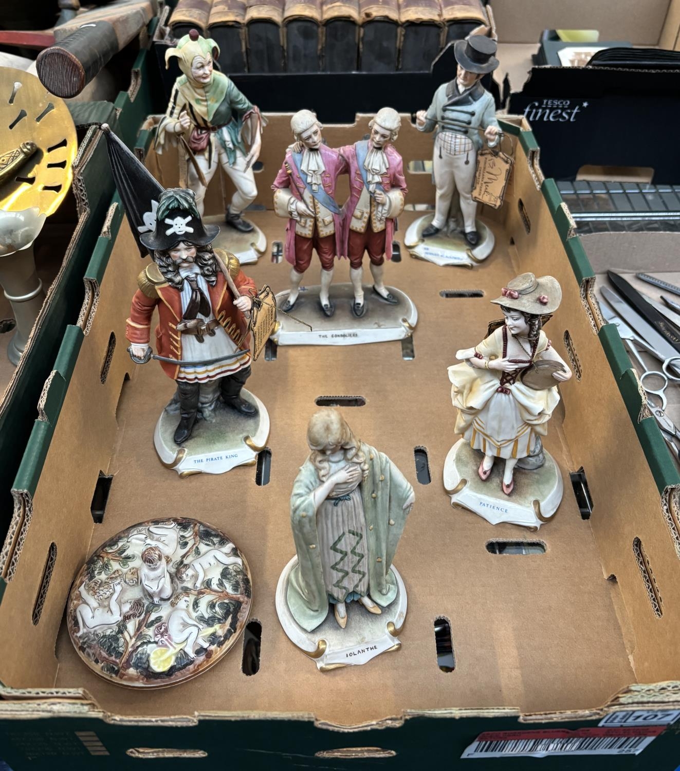 Box containing Capo Di Monte figures including Jack Point and The Pirate King by Bruno Merli