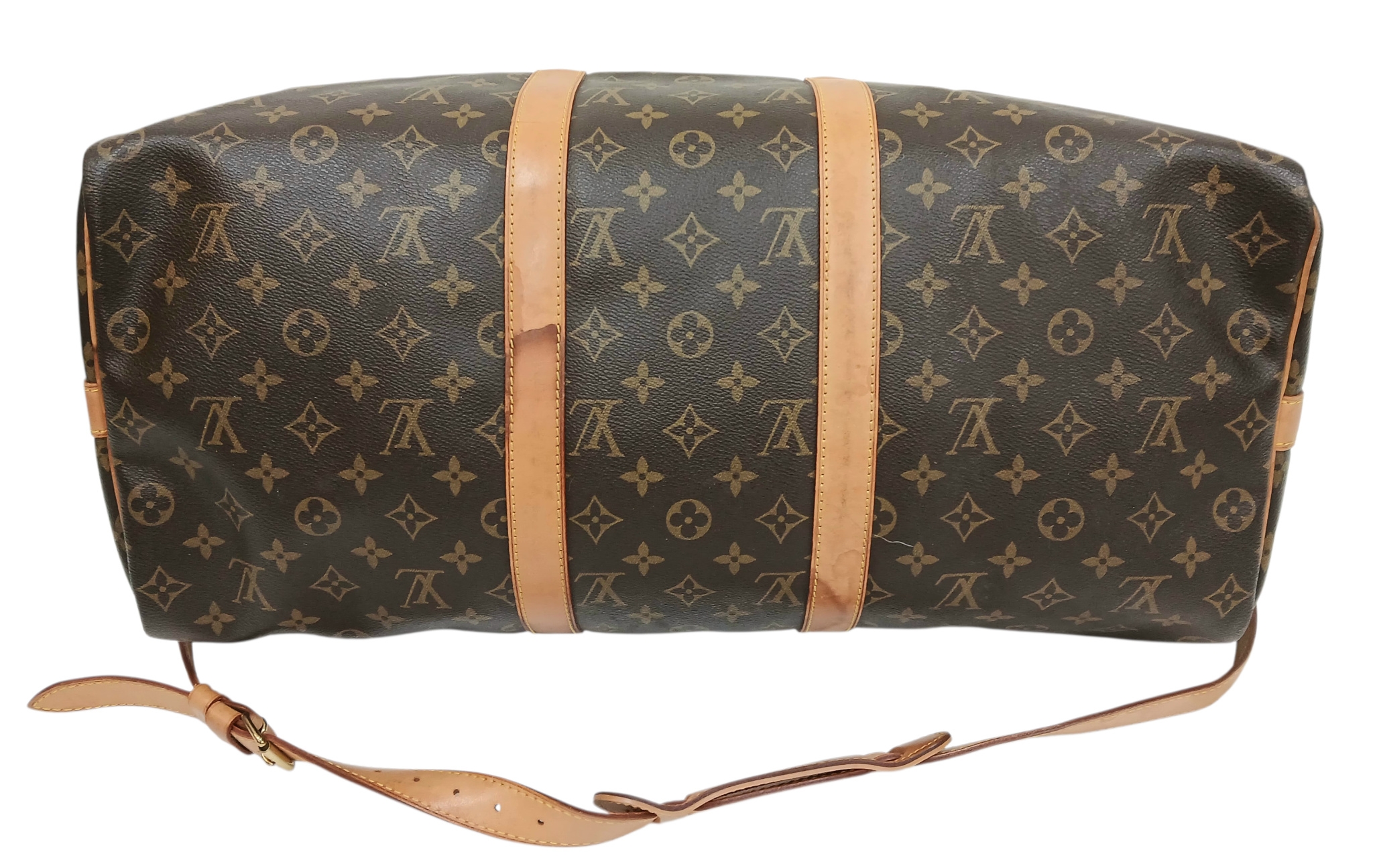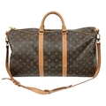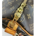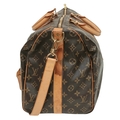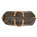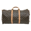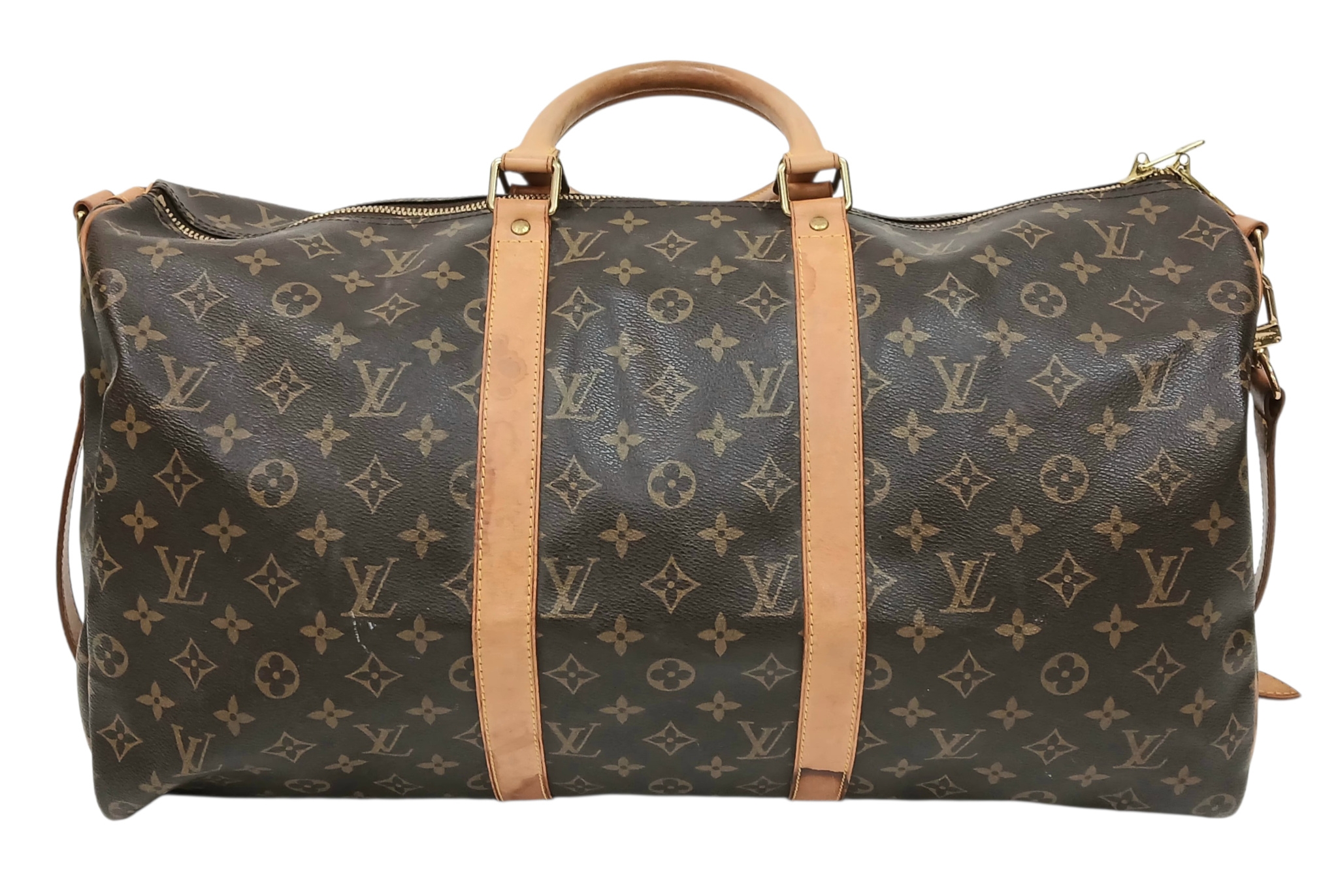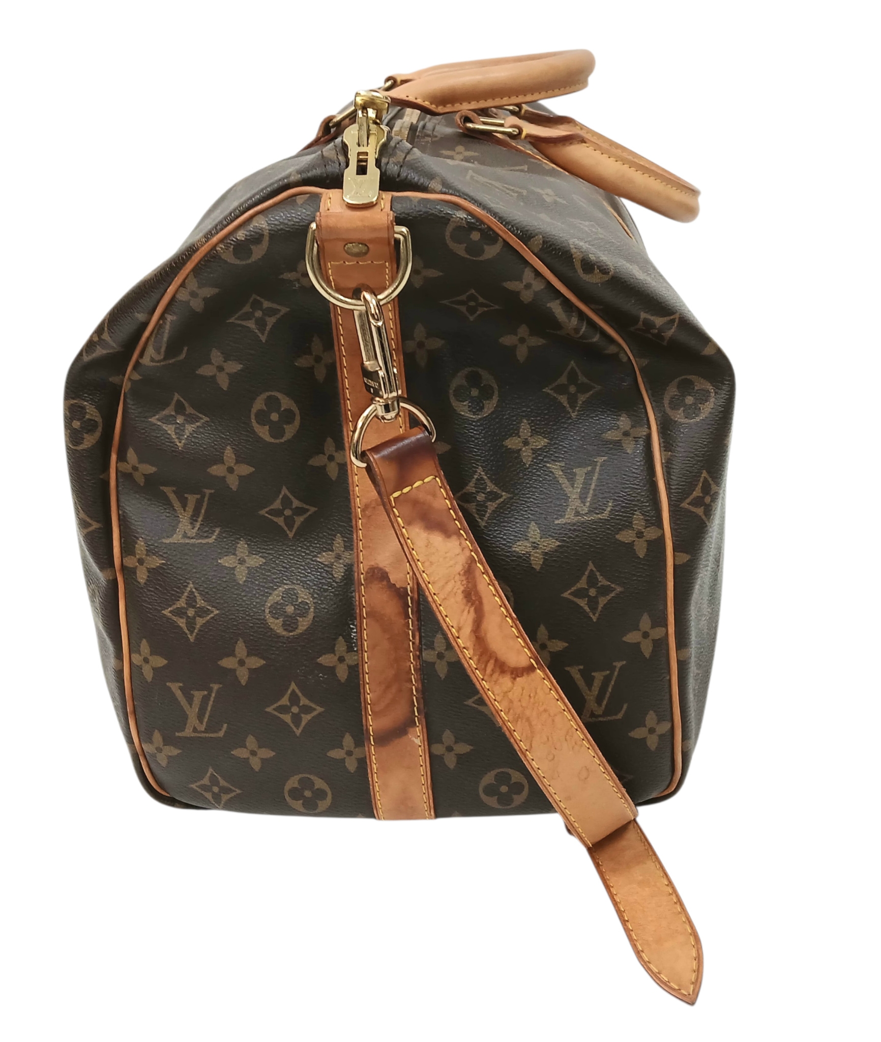 A Brown Louis Vuitton Monogram Keepall 50 Travel Bag. Brown monogram coated canvas exterior with gold-toned hardware, vachetta leather handles, detachable shoulder strap and zipped top closure. Brown textile-lined interior with a single main compartment. Visible wear to leather trim, patina, creasing, stains and marks. Approx 51cm length x 26cm height x 22cm depth. Please see photos or request a condition report. Ref: 27098.