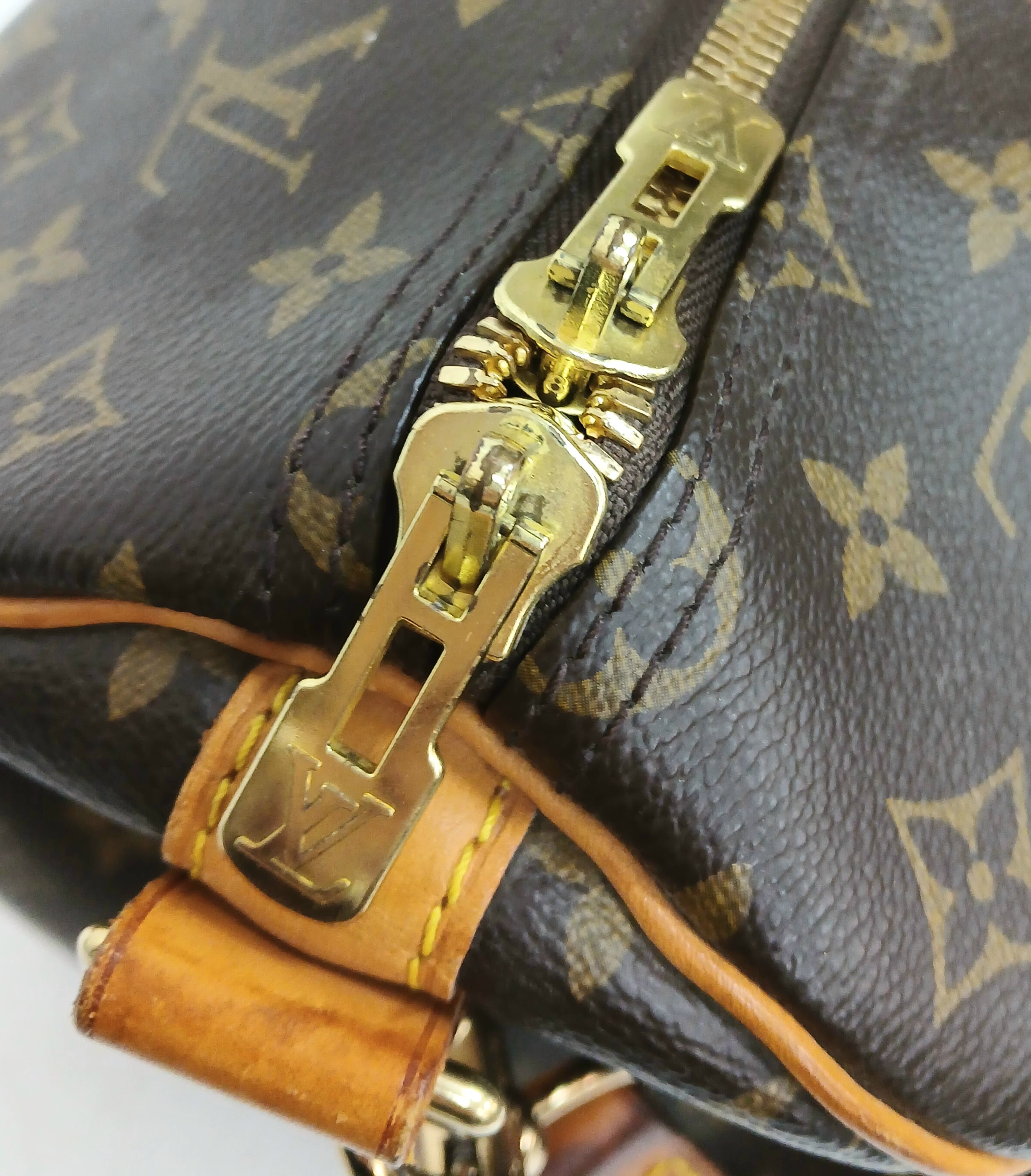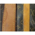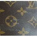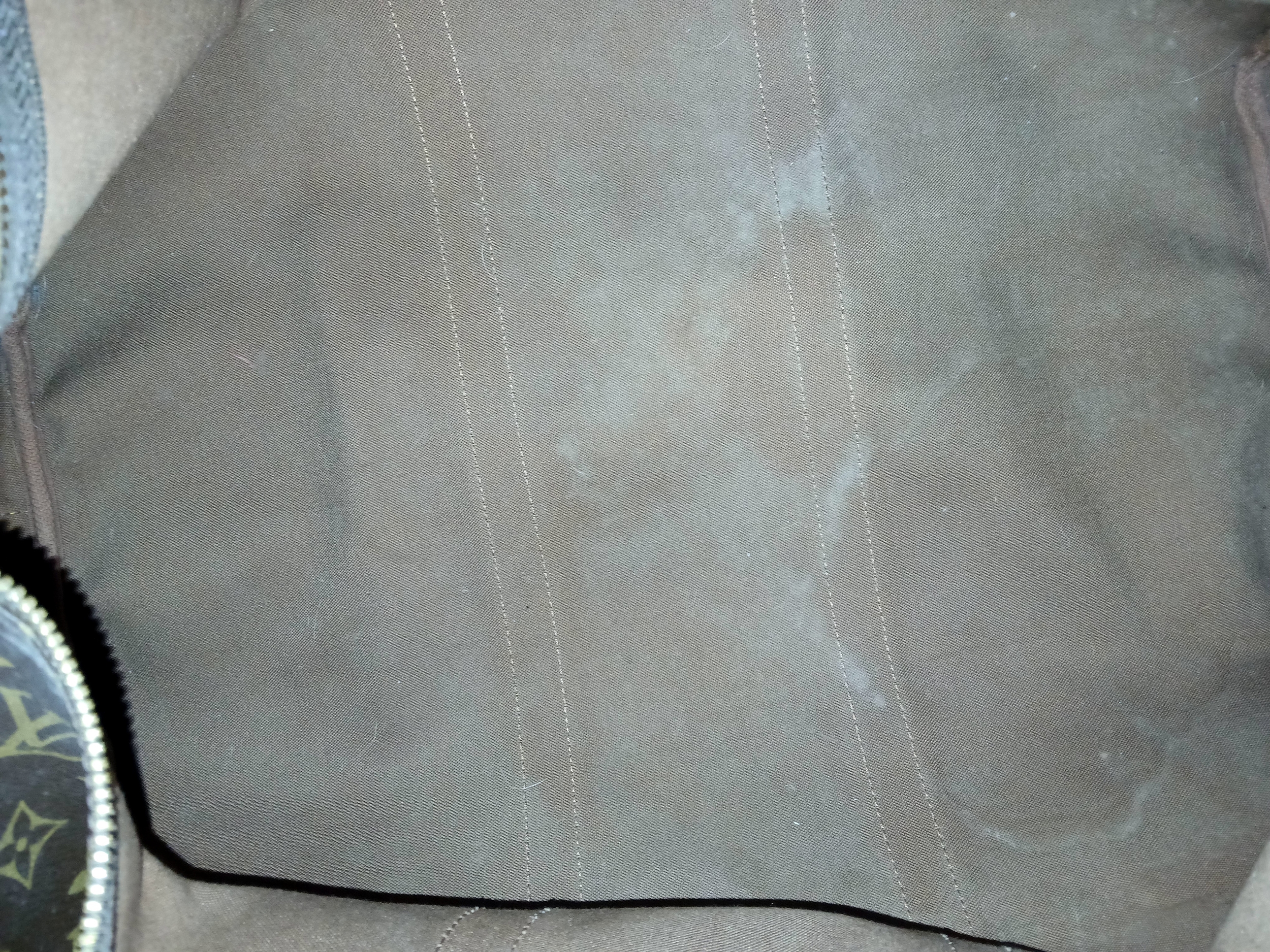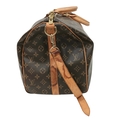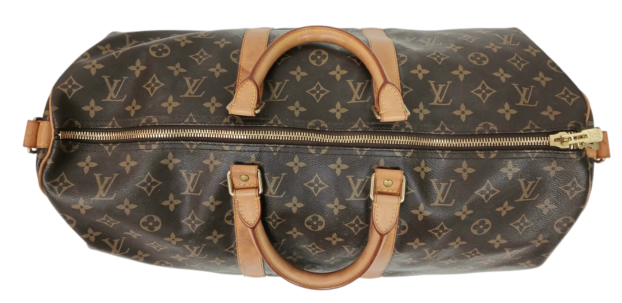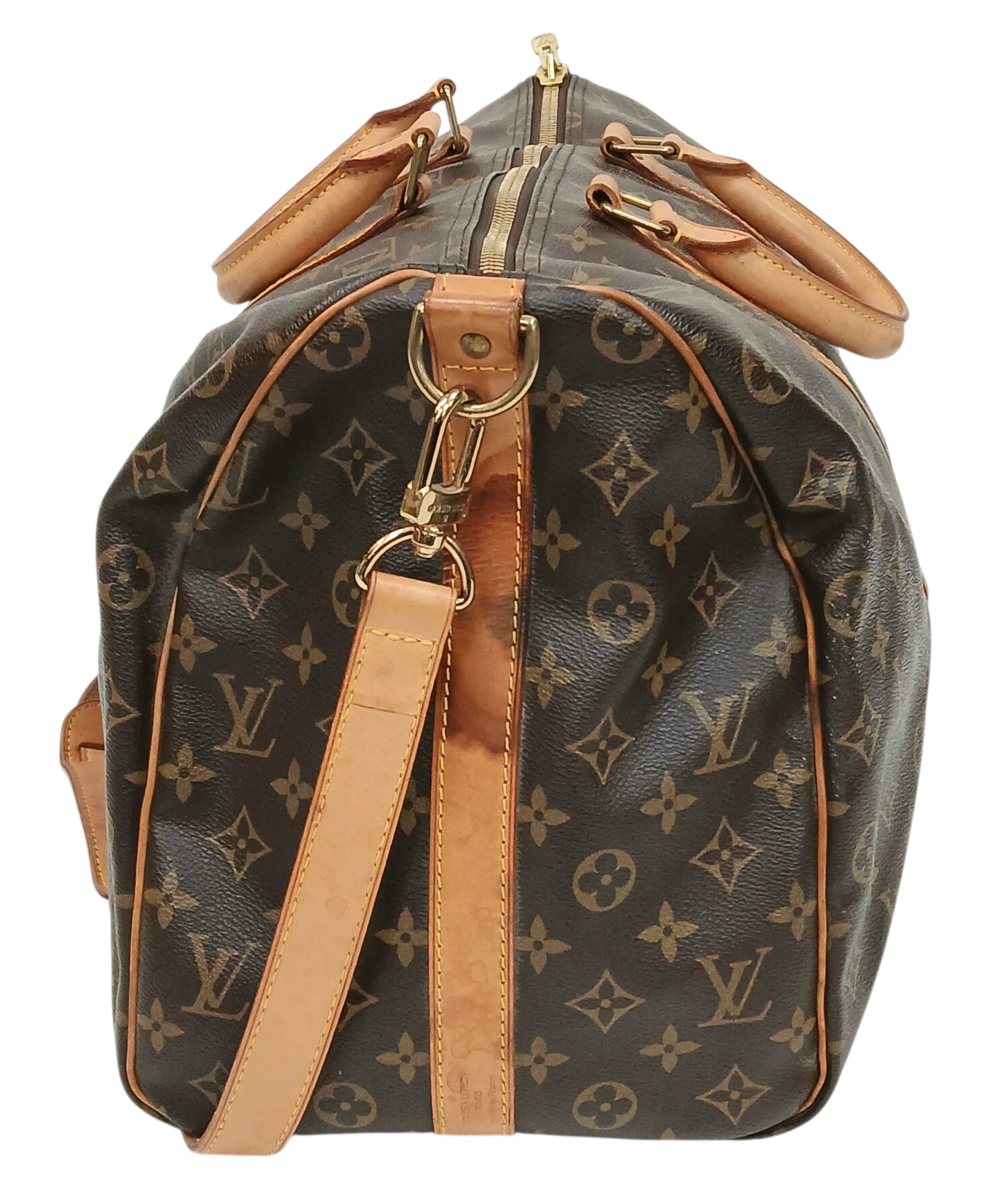 A Brown Louis Vuitton Monogram Keepall 50 Travel Bag. Brown monogram coated canvas exterior with gold-toned hardware, vachetta leather handles, detachable shoulder strap and zipped top closure. Brown textile-lined interior with a single main compartment. Visible wear to leather trim, patina, creasing, stains and marks. Approx 51cm length x 26cm height x 22cm depth. Please see photos or request a condition report. Ref: 27098.