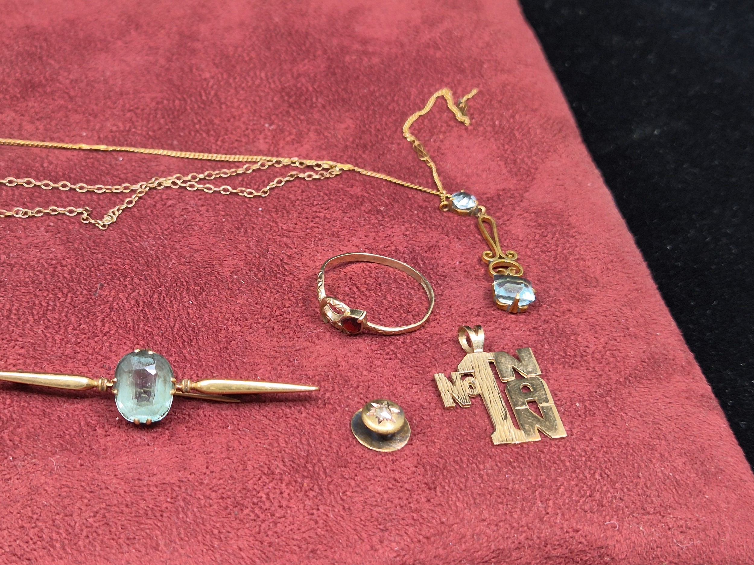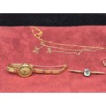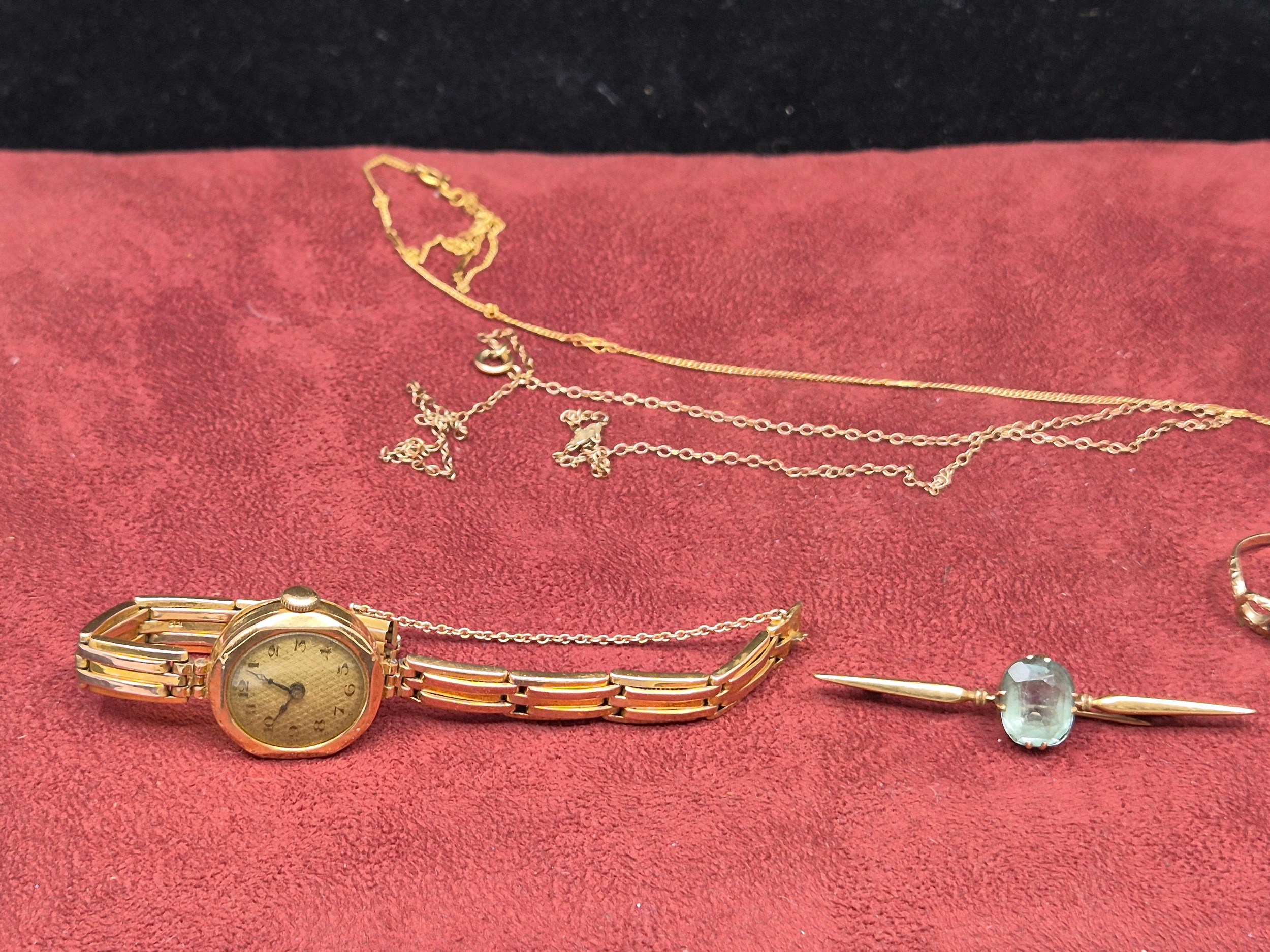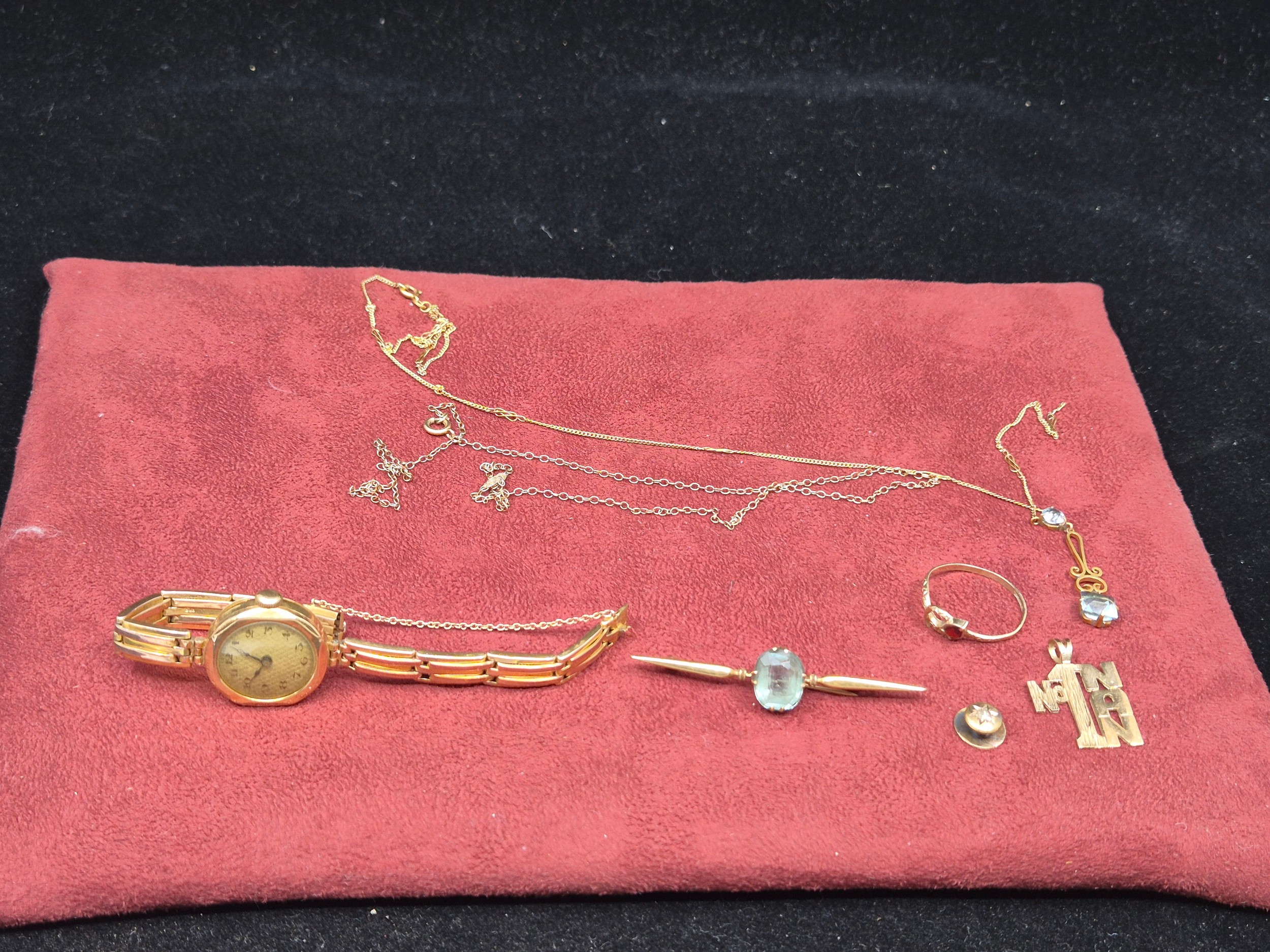 Mixed Lot of 9ct Gold Jewellery to include 9ct Cased and Strap Ladies Watch (14.4g) , Various other 9ct Jewellery (6.5g) and a 15ct Gold Brooch & Stud (4.6g)