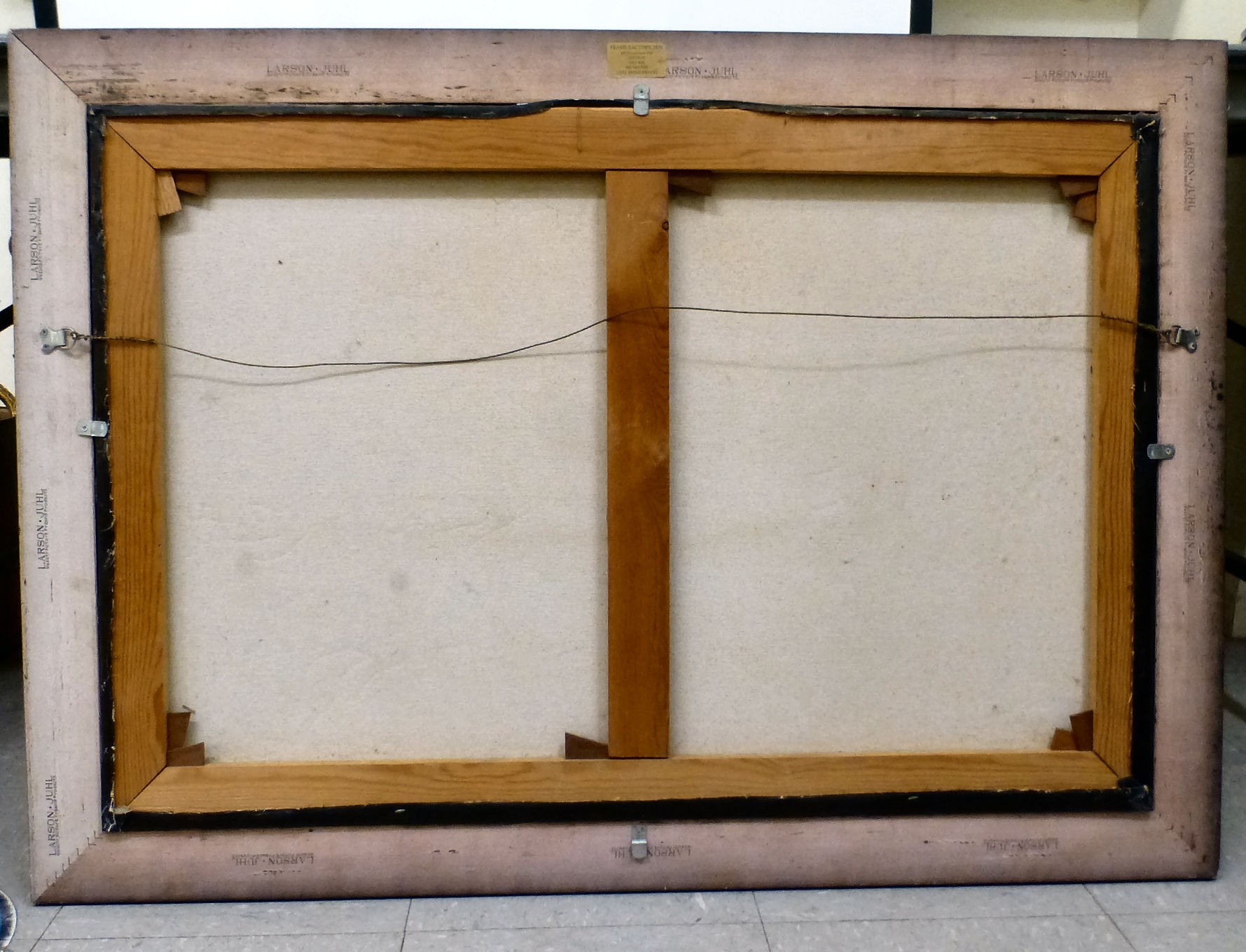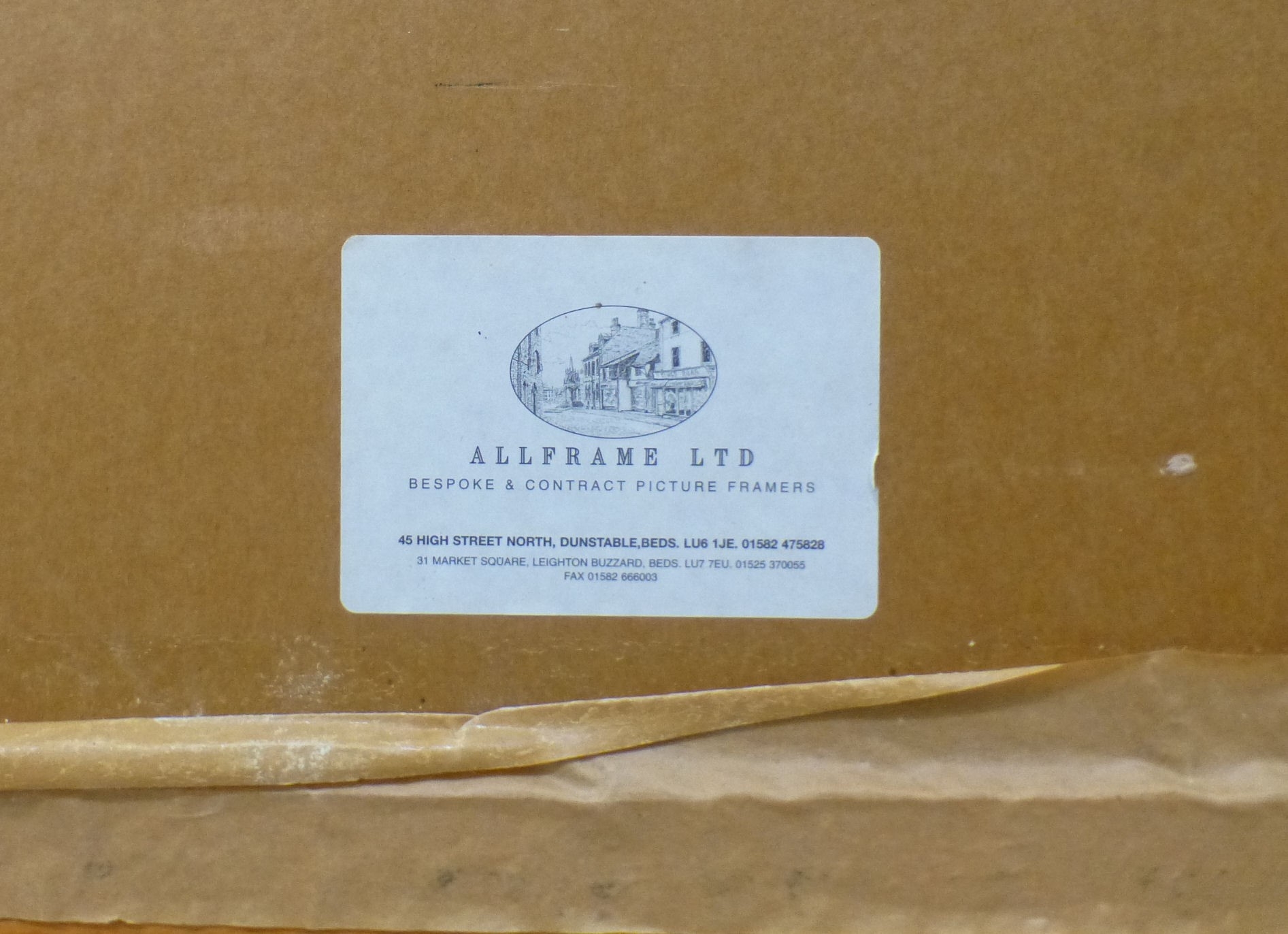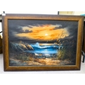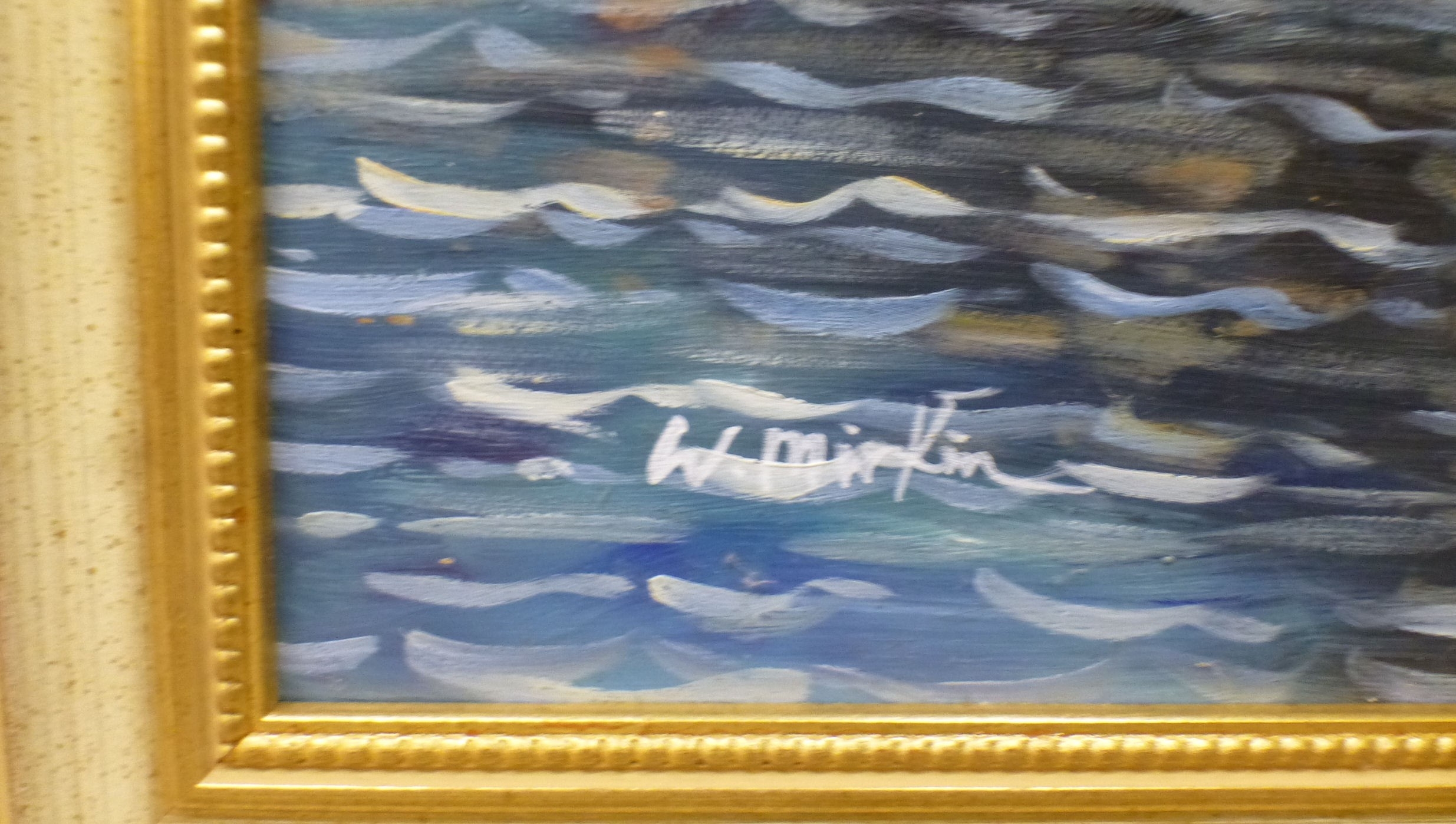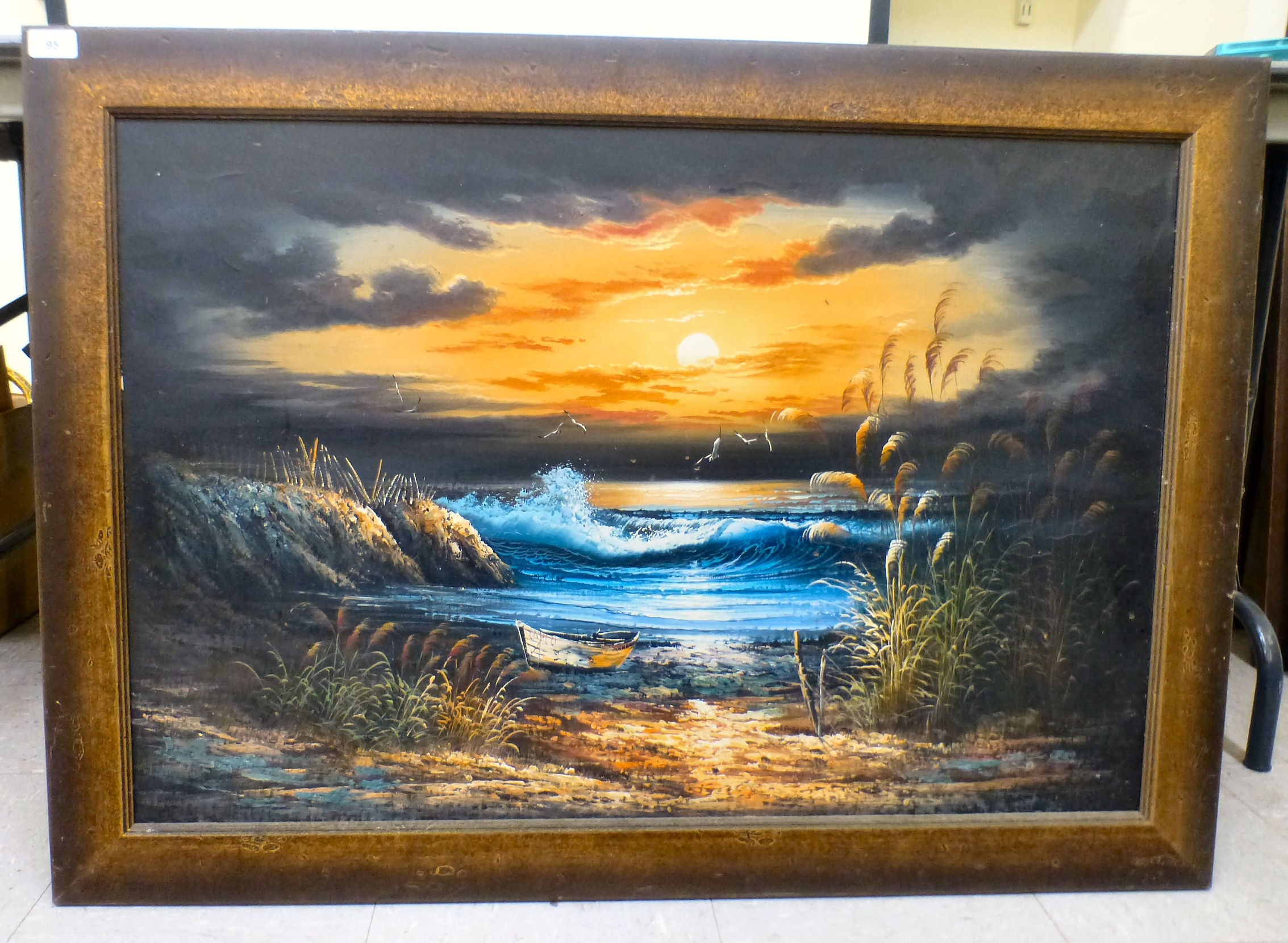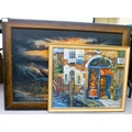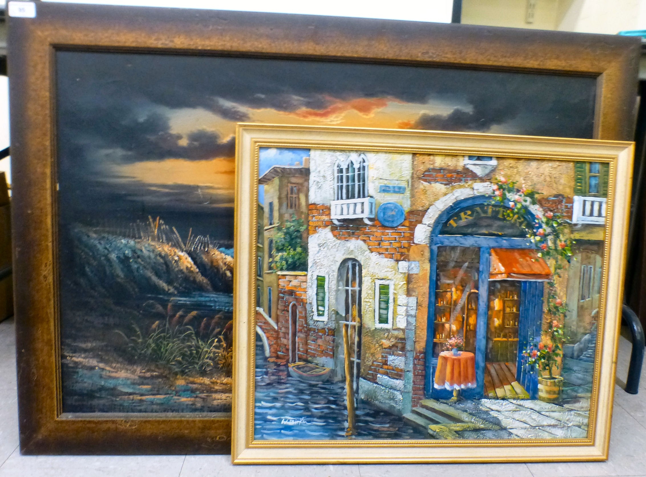 W Mirkin - a Venetian café scene oil on board bears a signature 18" x 23" framed; and modern School - a sunset shoreline scene oil on canvas 23" x 28" famed
