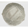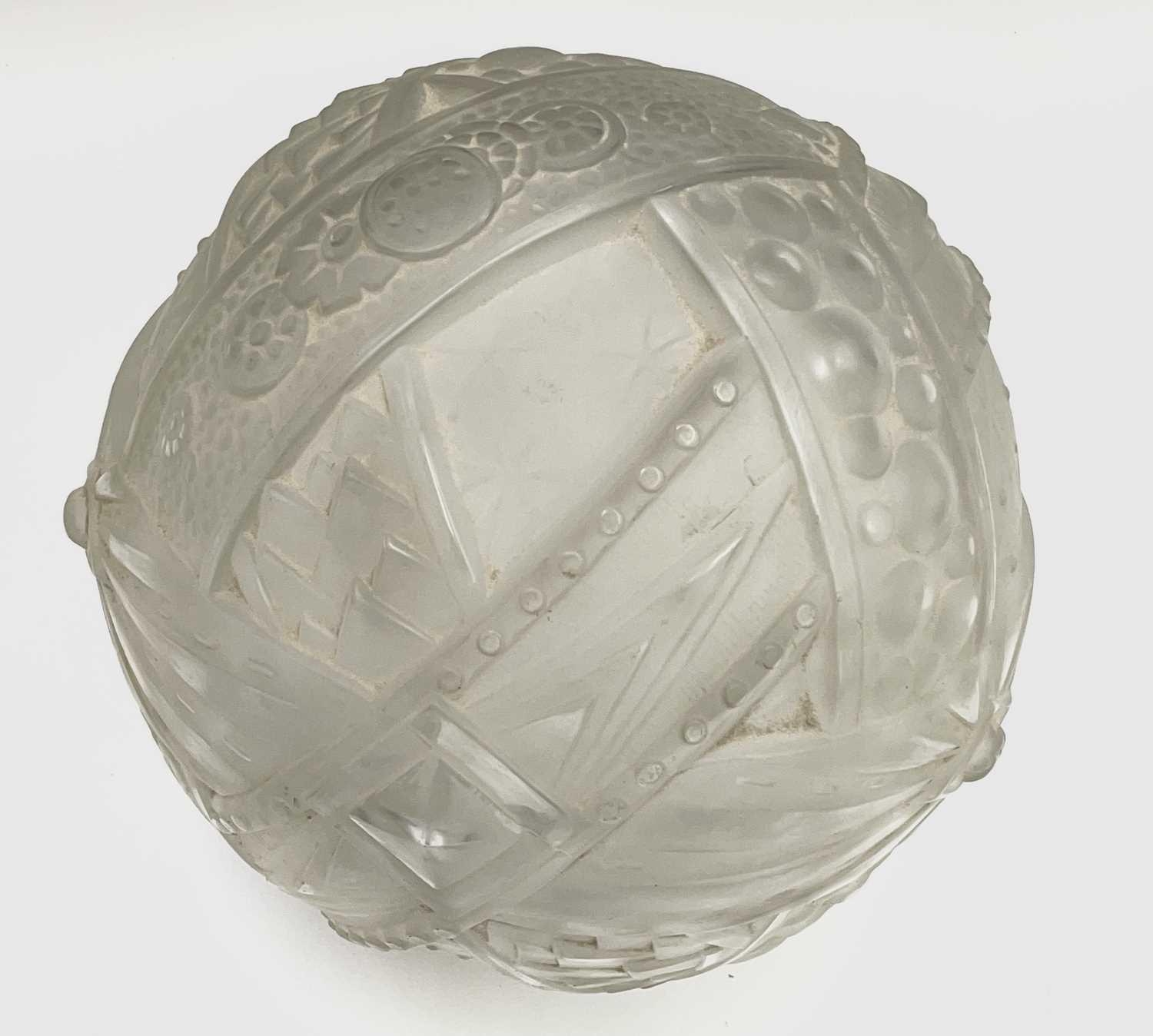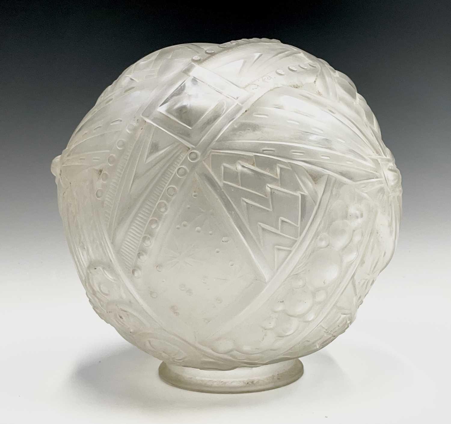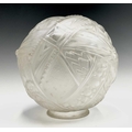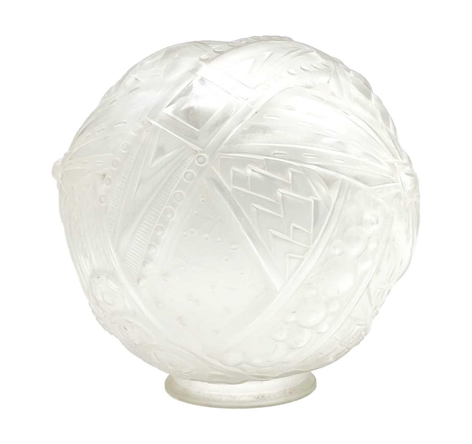A Muller Freres Luneville frosted glass globe. Moulded with flowerheads, stars and geometric motifs, moulded mark, diameter approximately 28cm.