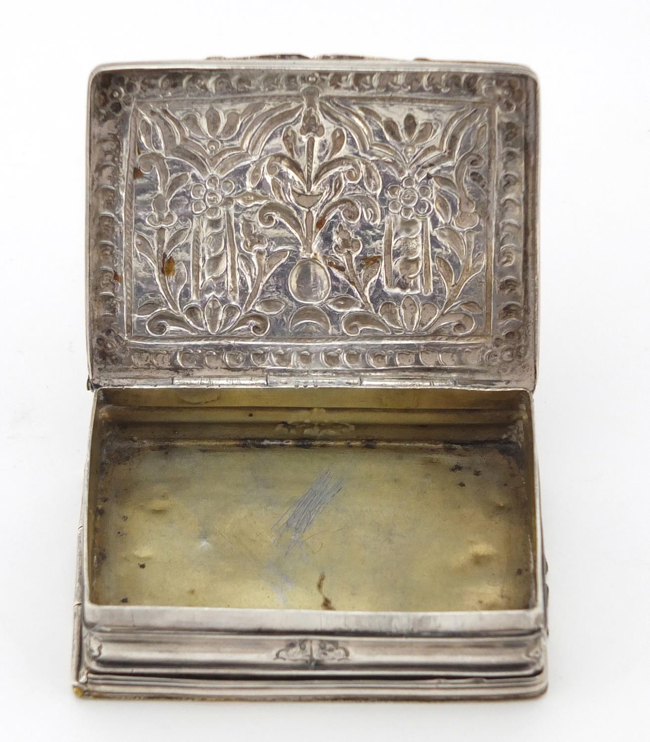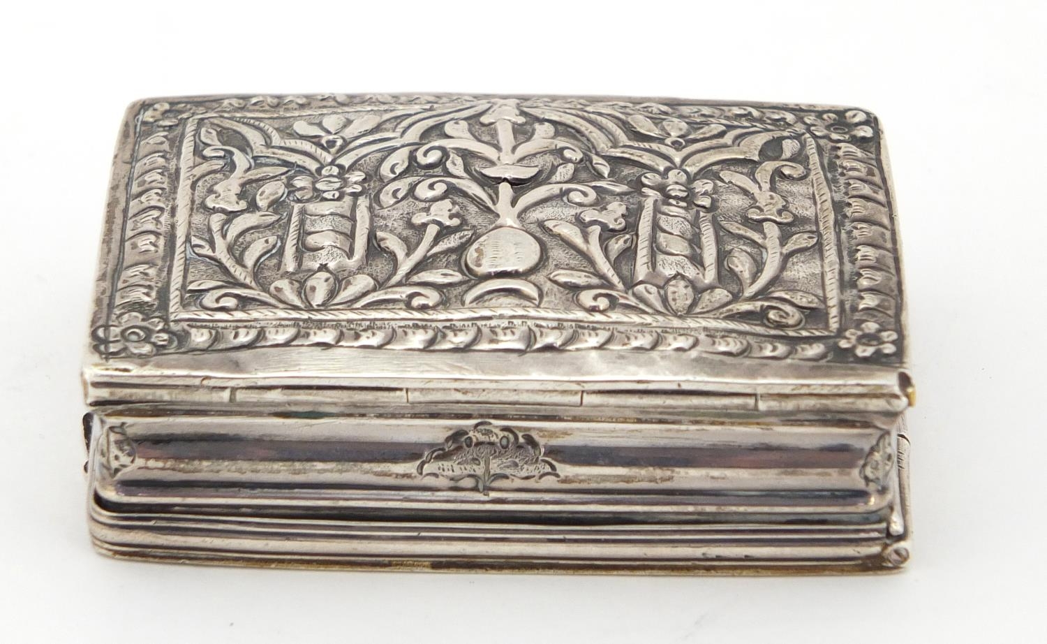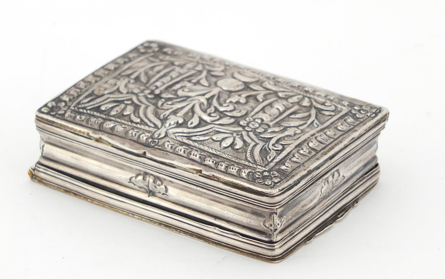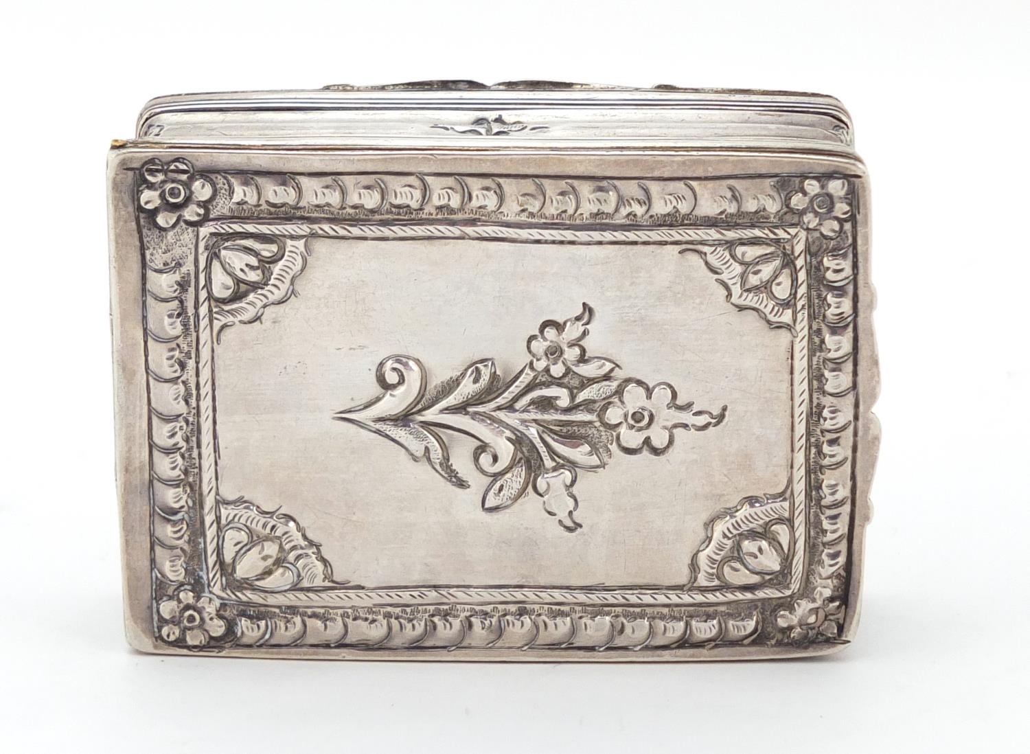 Continental unmarked silver snuff box with hinged compartment to the base, the hinged lid embossed with flowers and foliage, 7.2cm in length, 76.0g