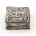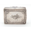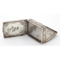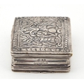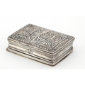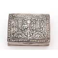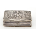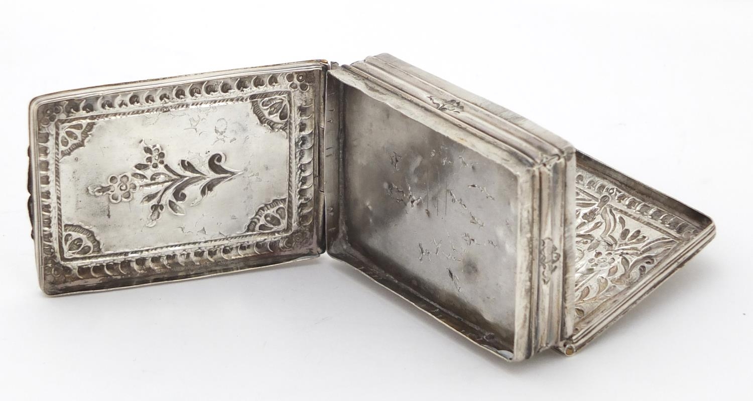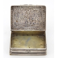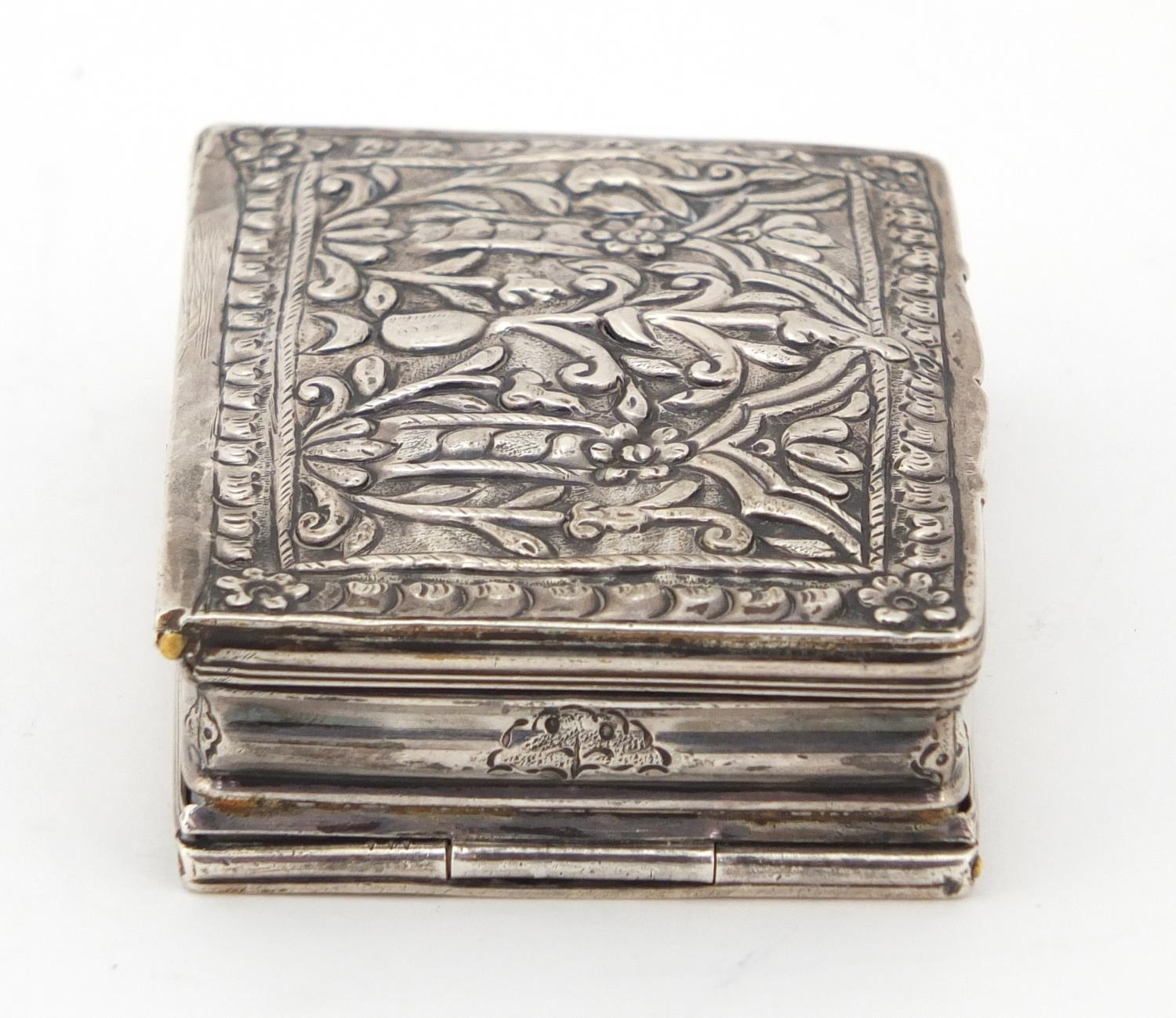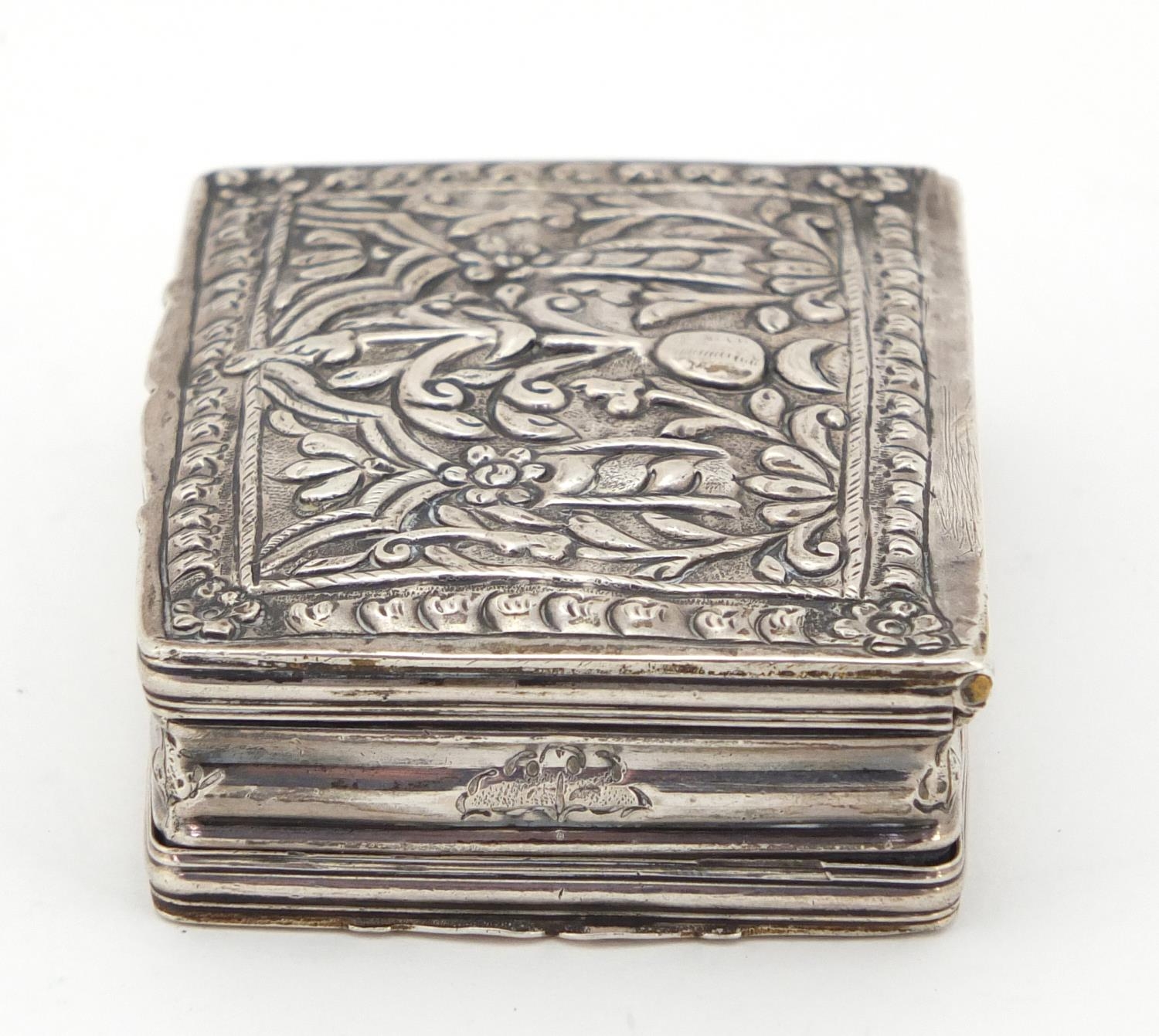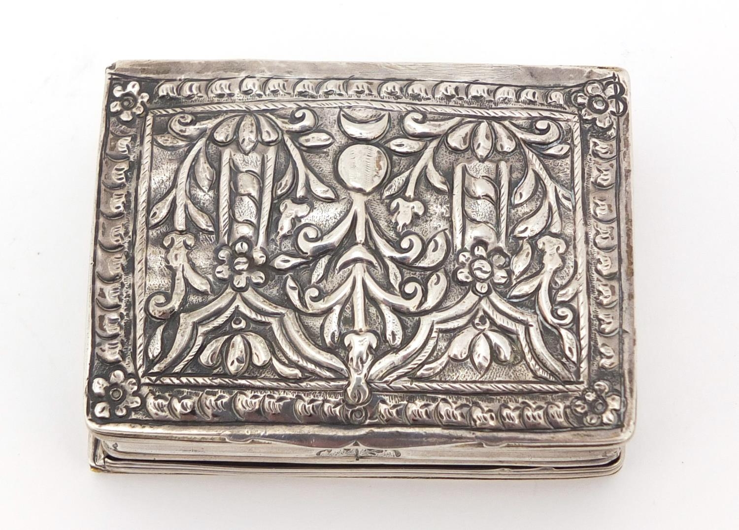 Continental unmarked silver snuff box with hinged compartment to the base, the hinged lid embossed with flowers and foliage, 7.2cm in length, 76.0g