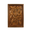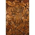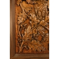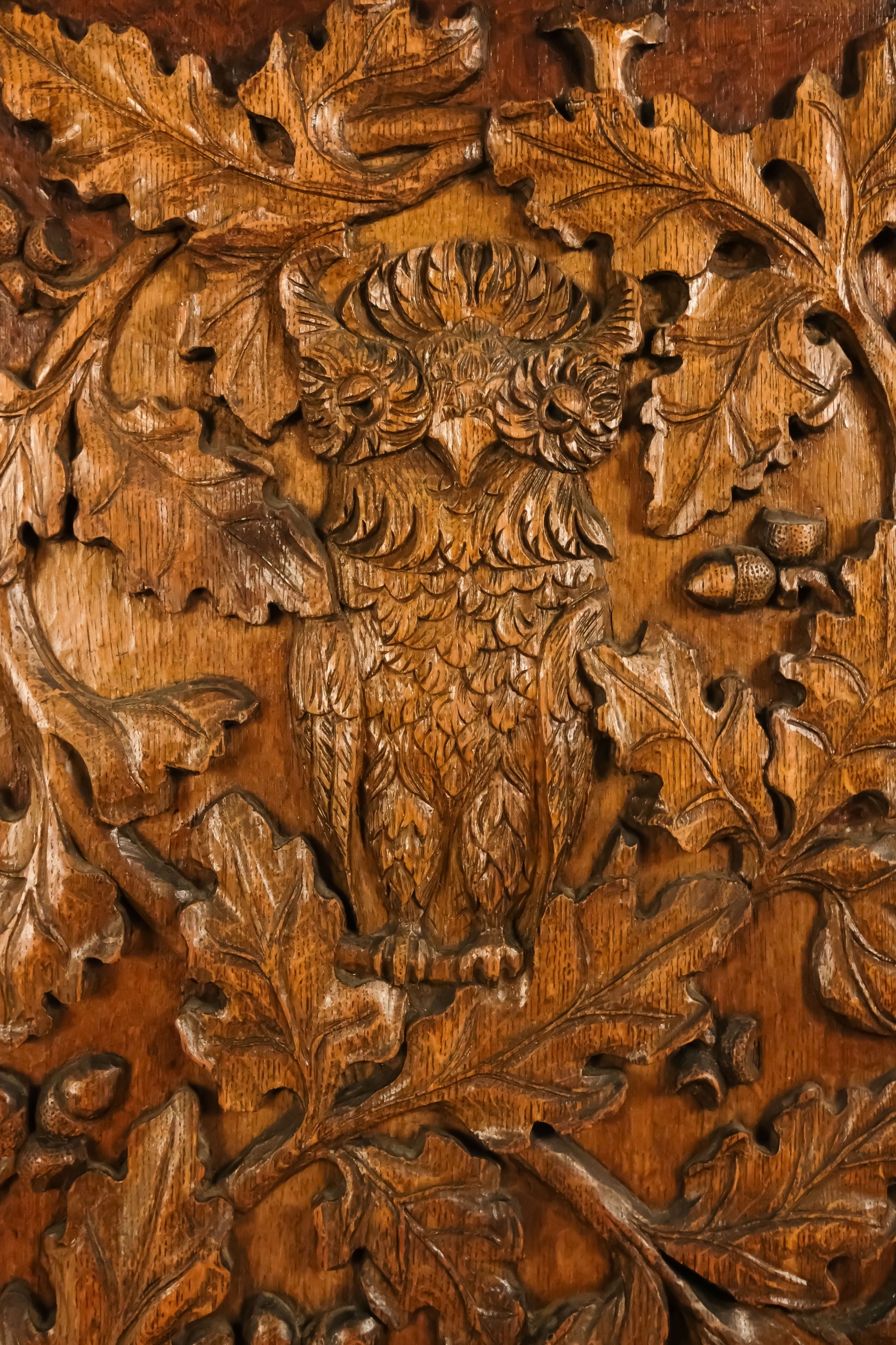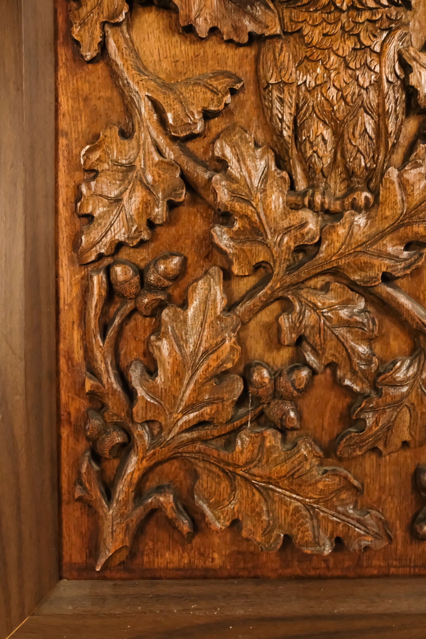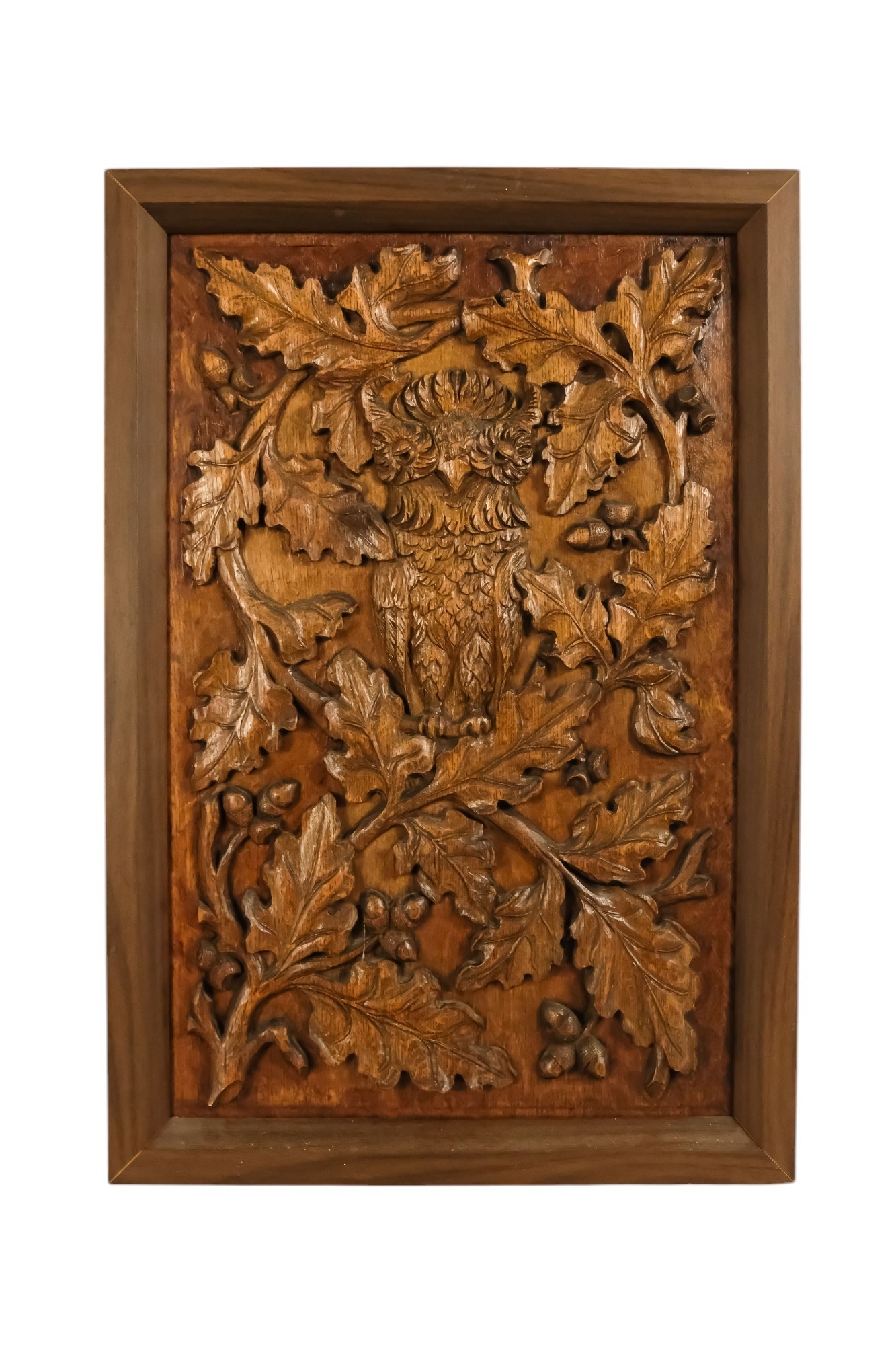 A 20th century carved oak panel - showing a owl in an oak tree, 66 x 45cm.