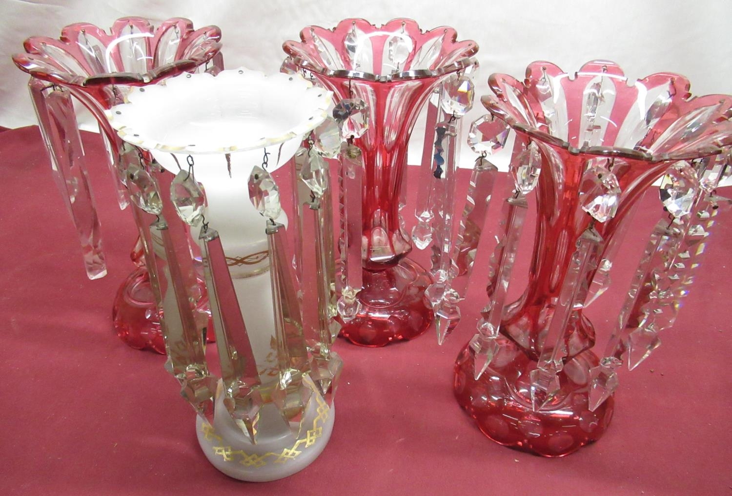 Three C19th Bohemian ruby overlaid lusters with faceted prismatic drops H29cm, late C19th opaque glass lustres with faceted prismatic drops H30cm (4)