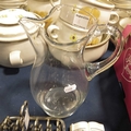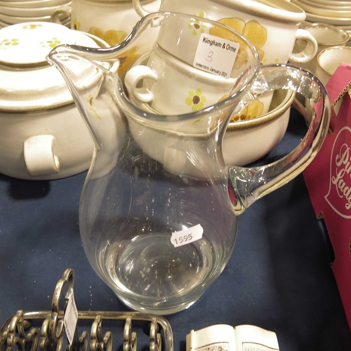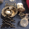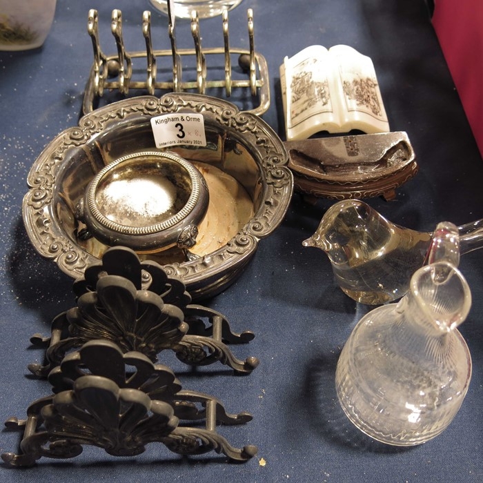 A silver plated wine coaster, menu holder, toast rack and salt; glass water jug and other sundry items.