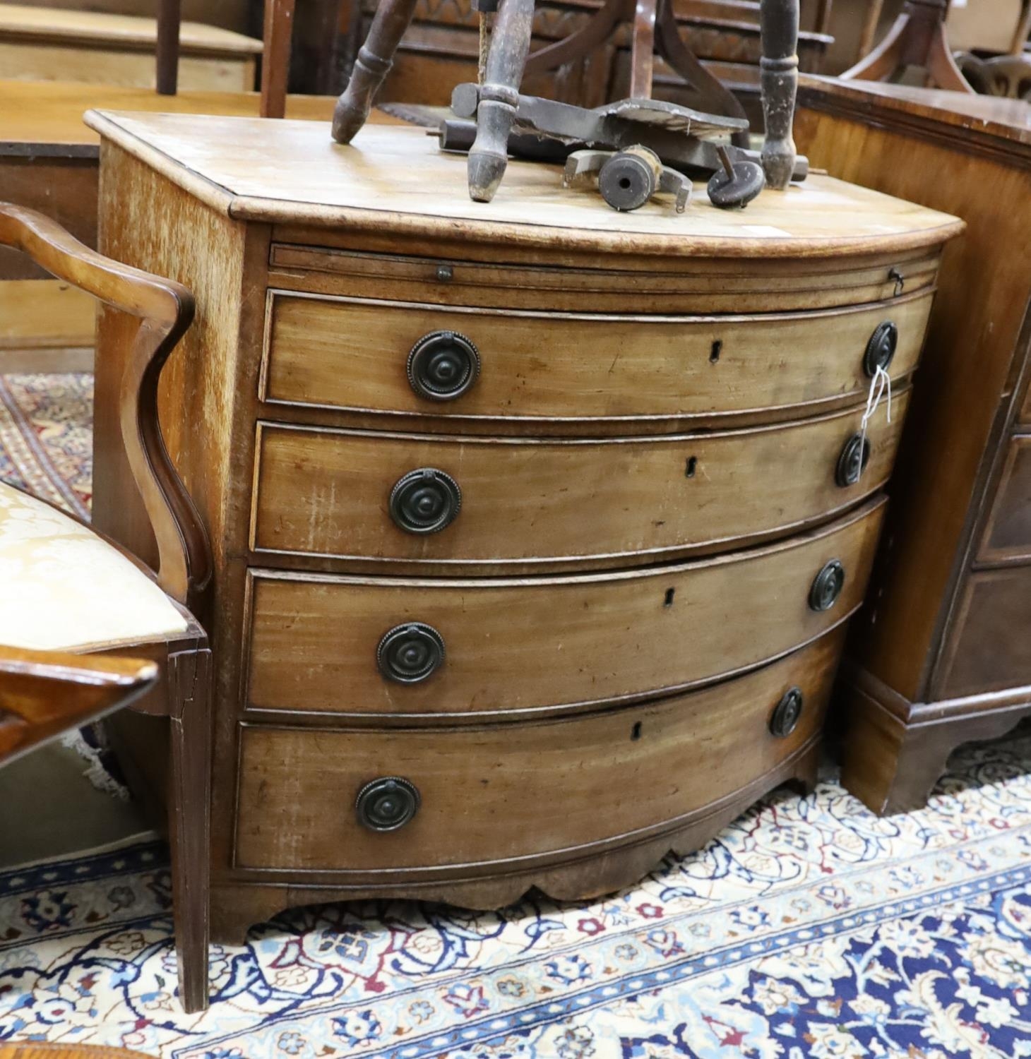 A Regency mahogany bow front chest of drawers with brushing slide, width 92cm, depth 56cm, height 80cm