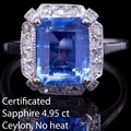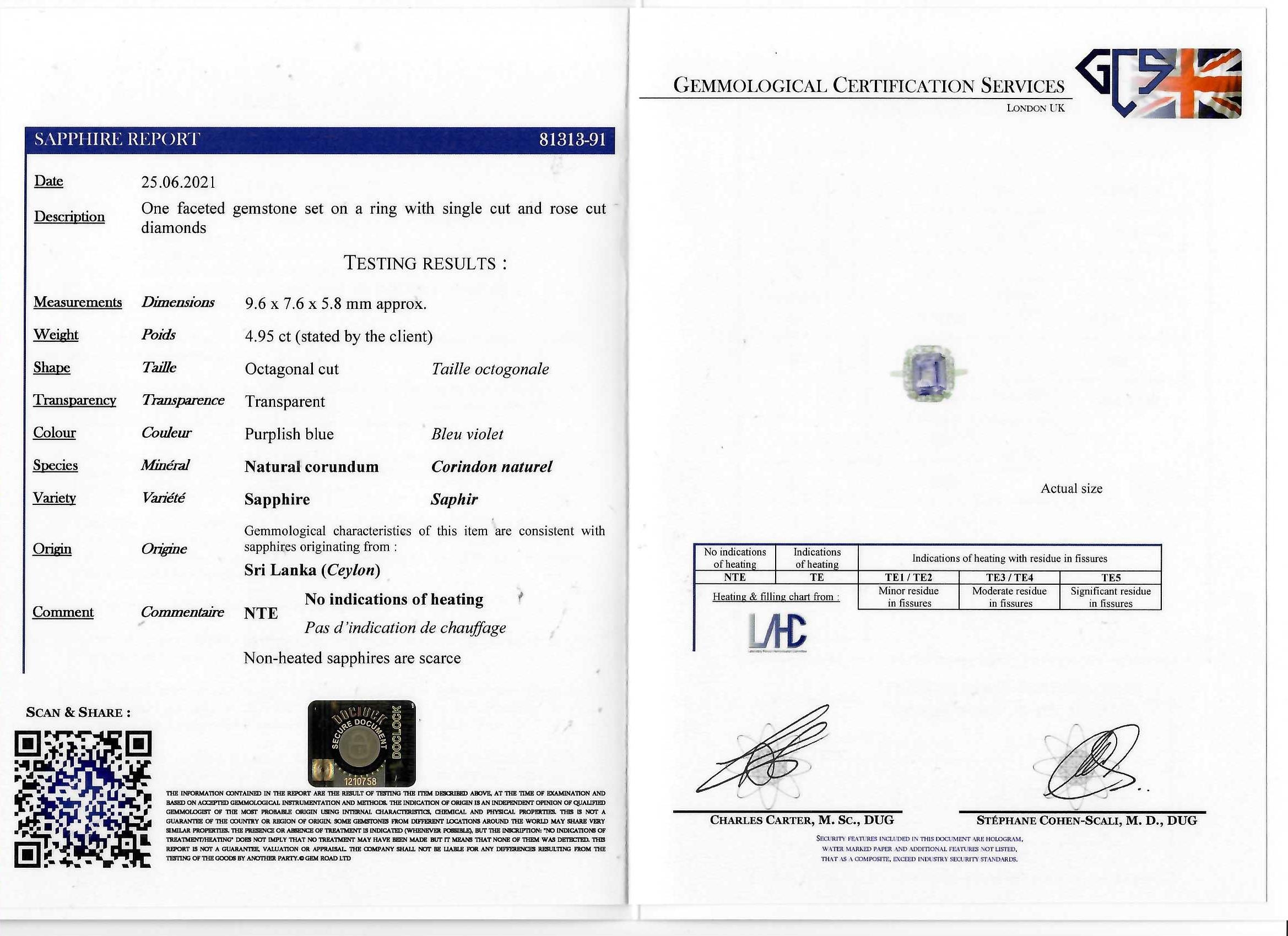 CERTIFICATED 4.95 SAPPHIRE AND DIAMOND CLUSTER RING, set with a central rectangular blue sapphire of approx. 4.95 ct. Surrounded by 14 rose cut diamonds. Size M 1/2. 3.9 grams. Accompanied by GCS London rport no. 81313-91 stating that the 4.95 ct. blue sapphire is natural, Ceylon origin, No indications of heating.