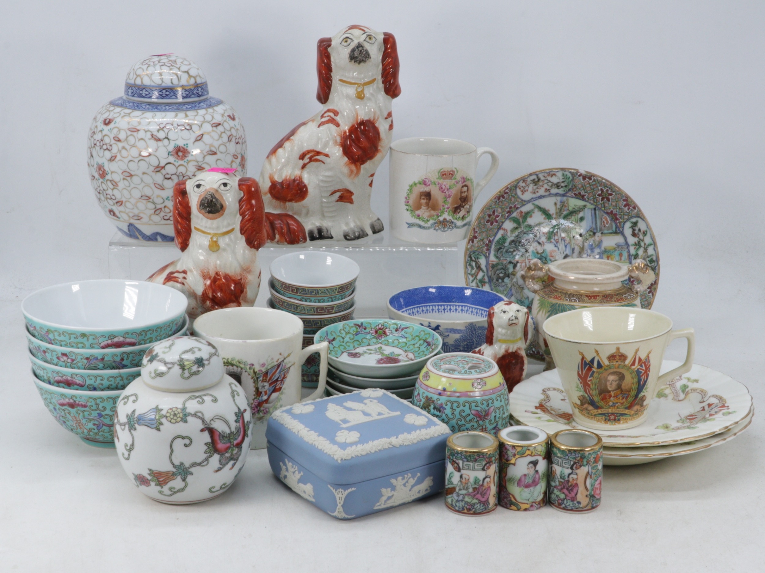 Two Staffordshire spaniels, together with a small similar, commemorative china, oriental tea ware, ginger jars etc
