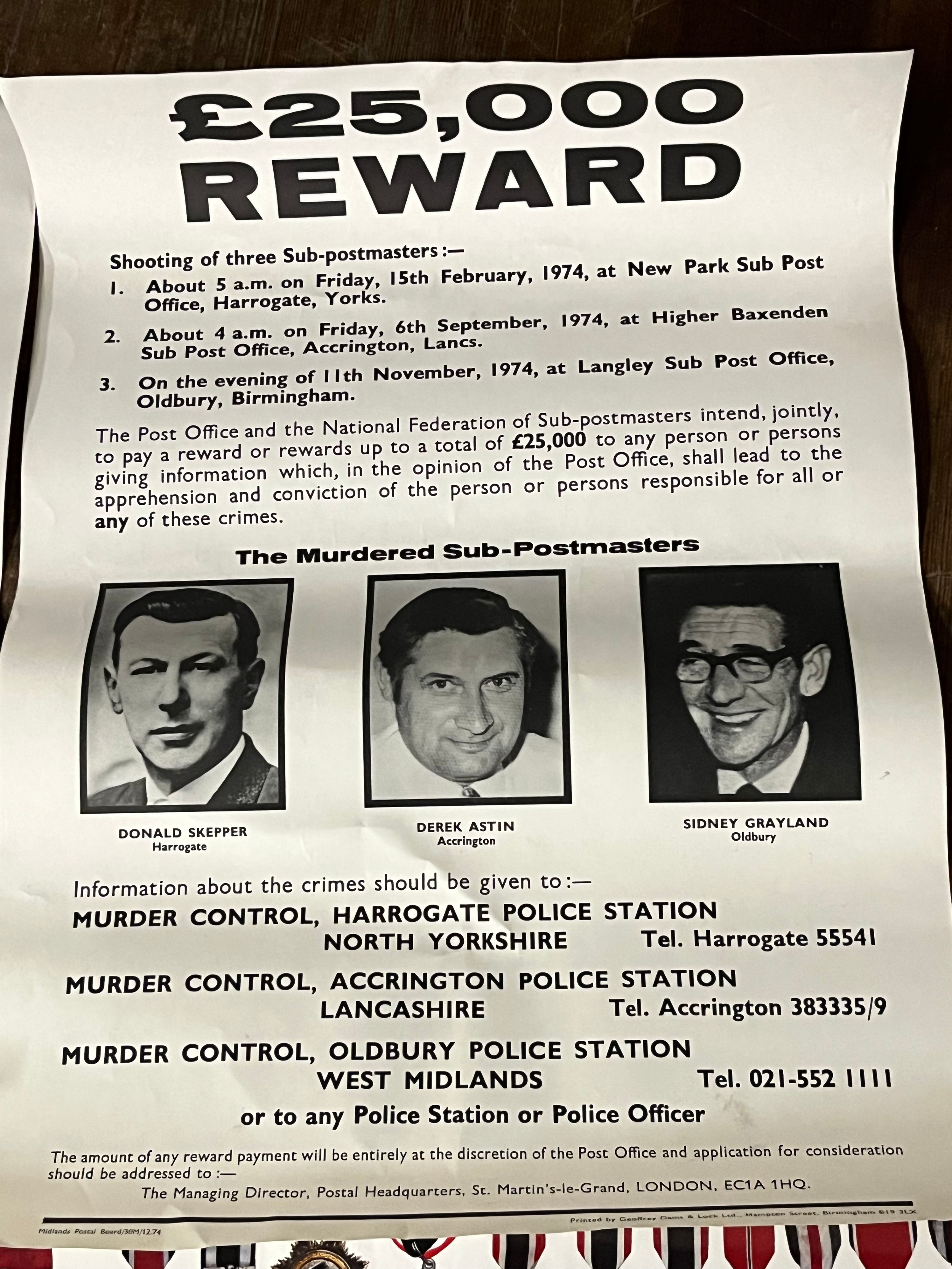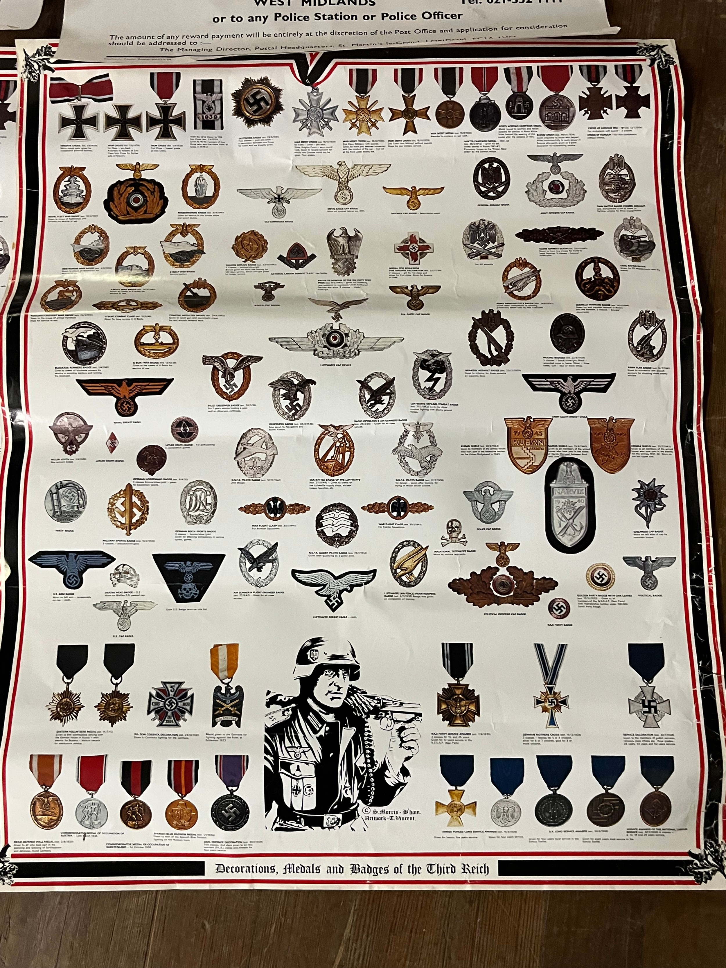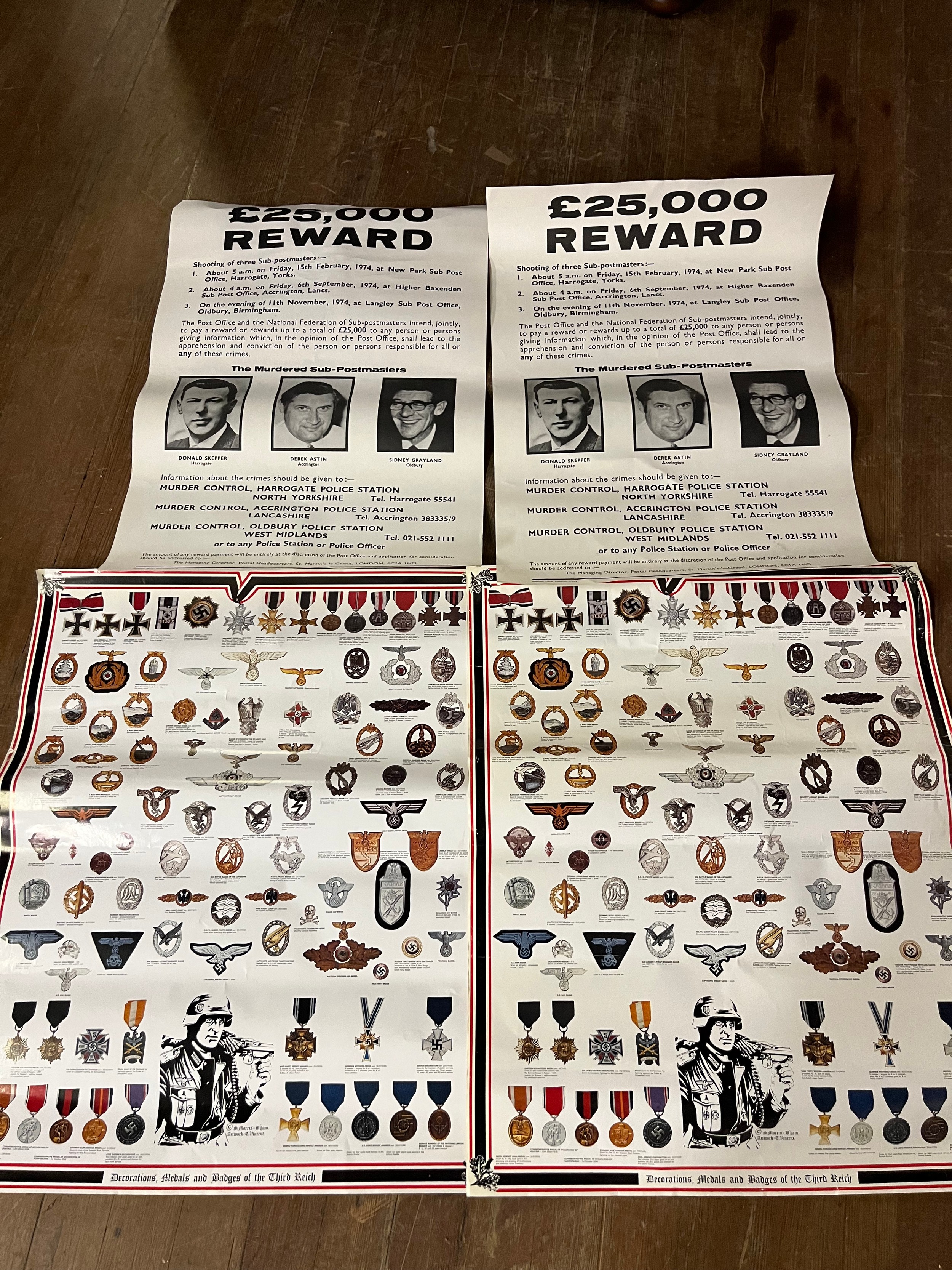 2 posters of the decorations, medals & badges of the Third Reich & 2 Reward posters from the postmasters shootings of 15th February 1974.