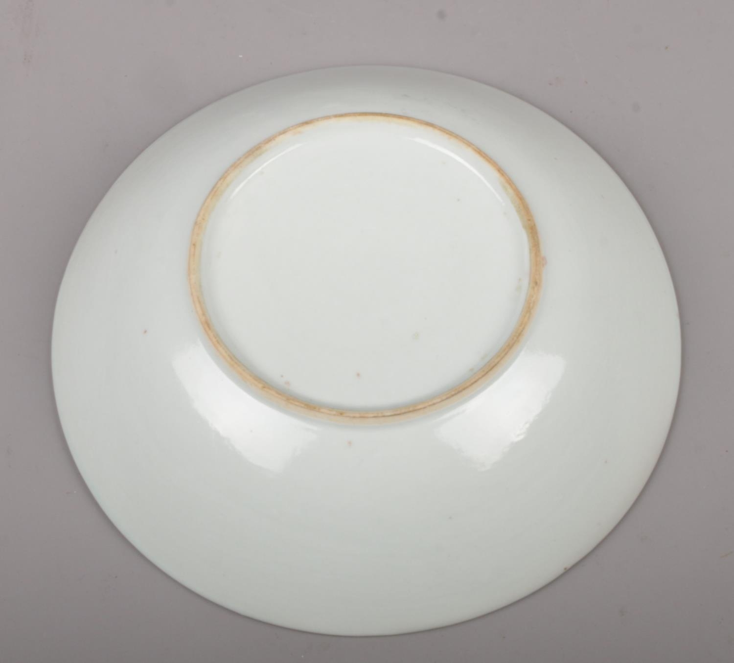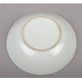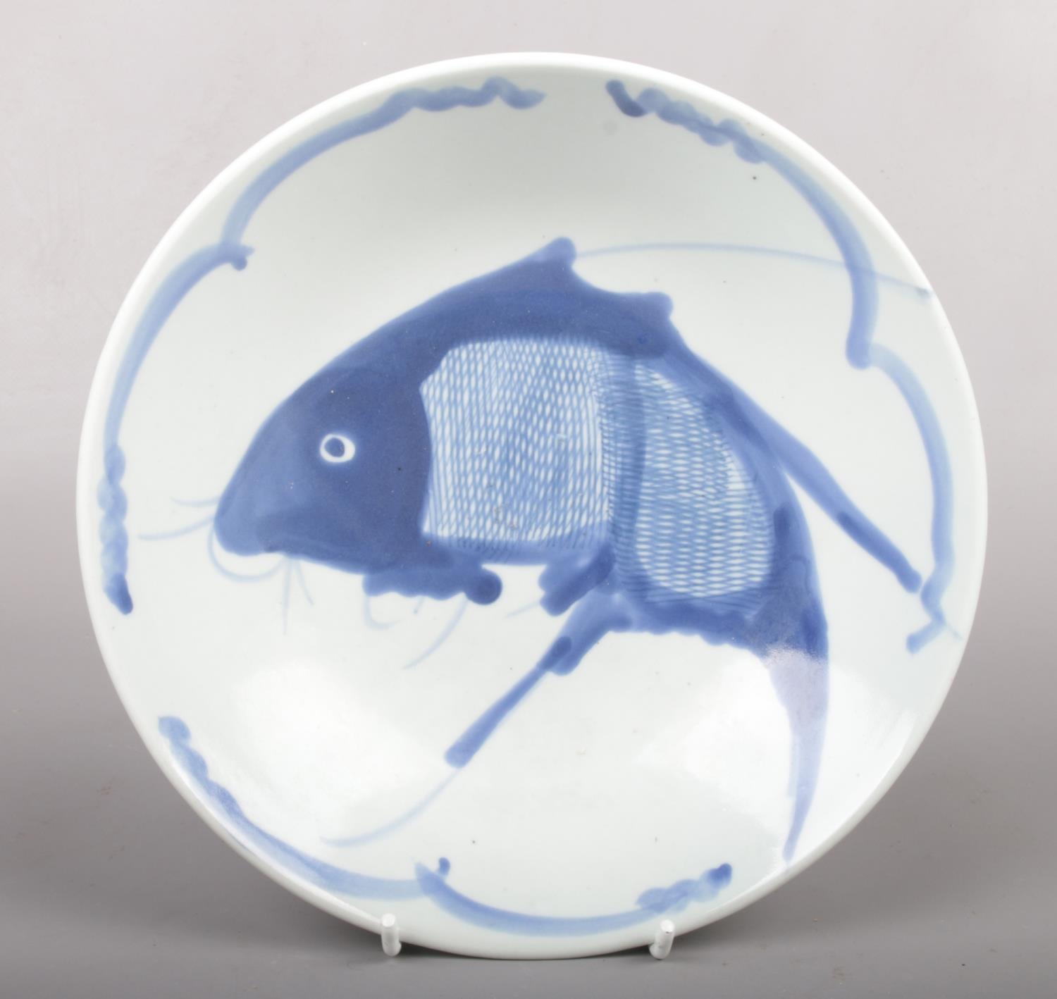 A Chinese Kangxi style blue and white dish. Painted with wide strokes of underglaze blue with a carp under a simple line border, 20.5cm diameter.