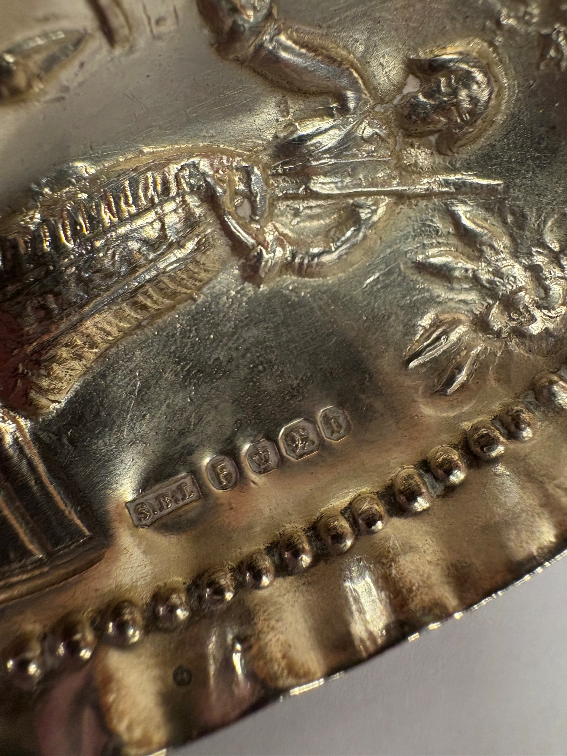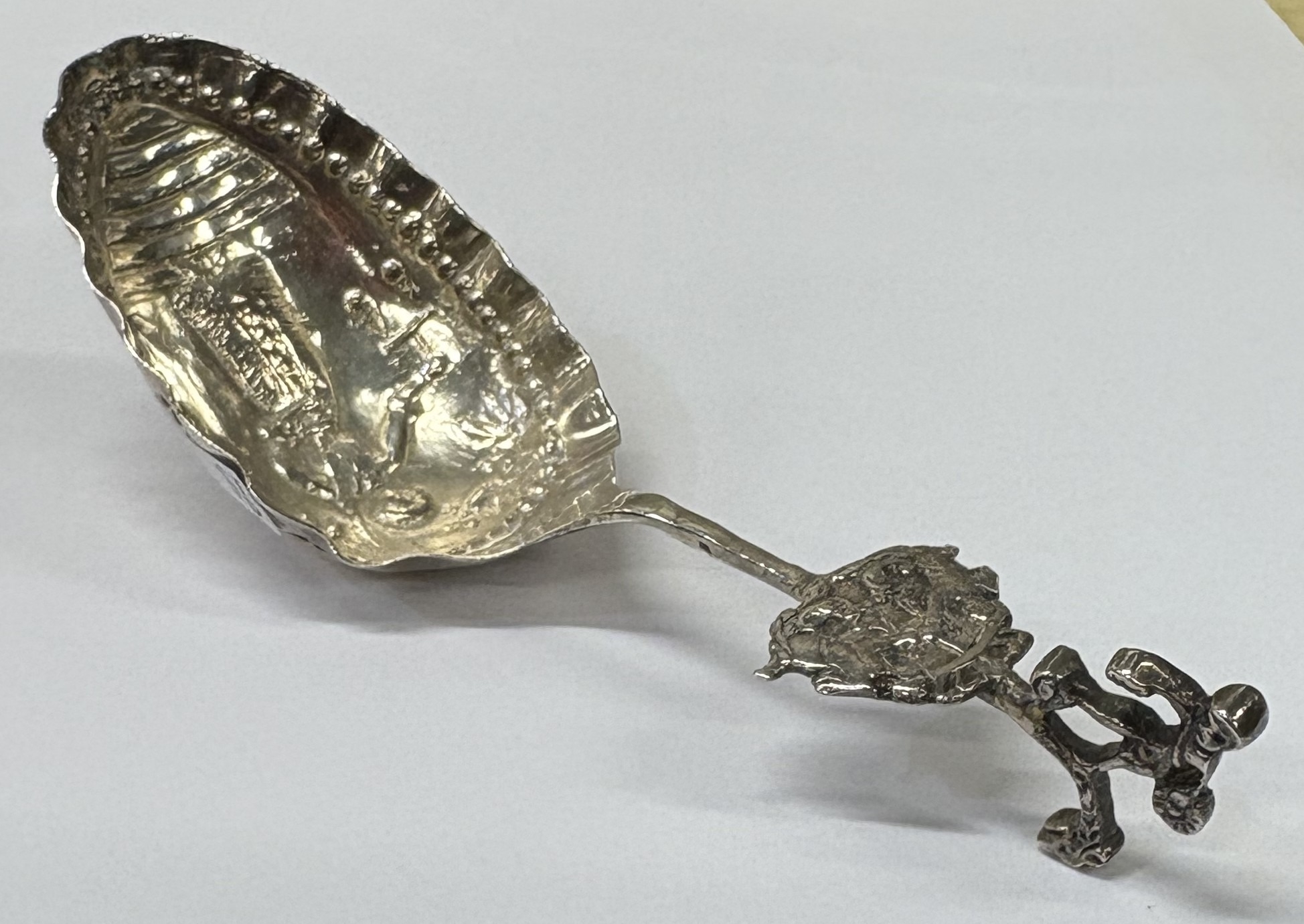 An Antique Continental novelty silver caddy spoon with embossed scene to bowl of woman and grouse. Approx. 28 grams. Est. £30 - £40.