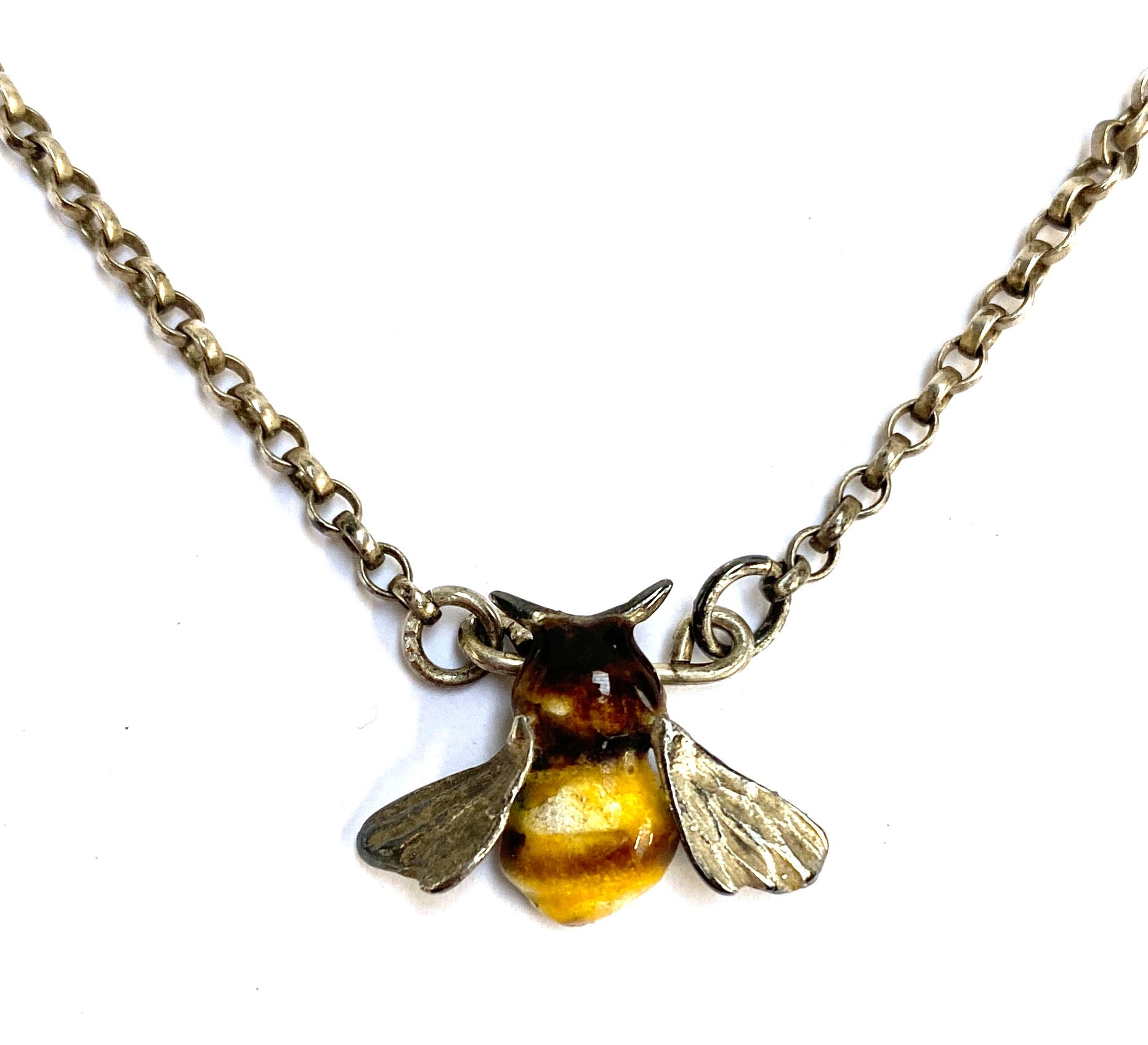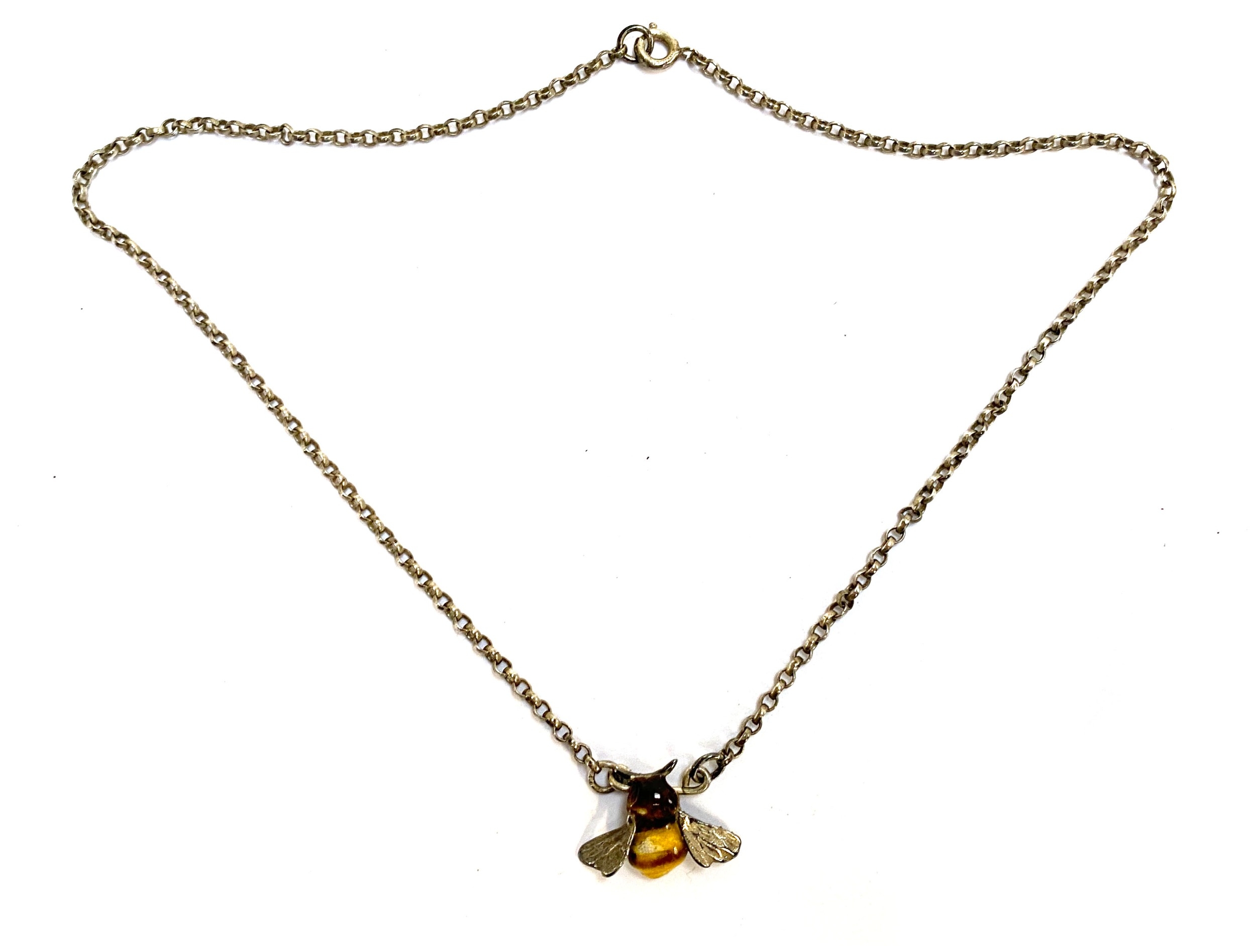 A short silver and enamel bee necklace, the chain 37.5cmL unclasped, 6.7g