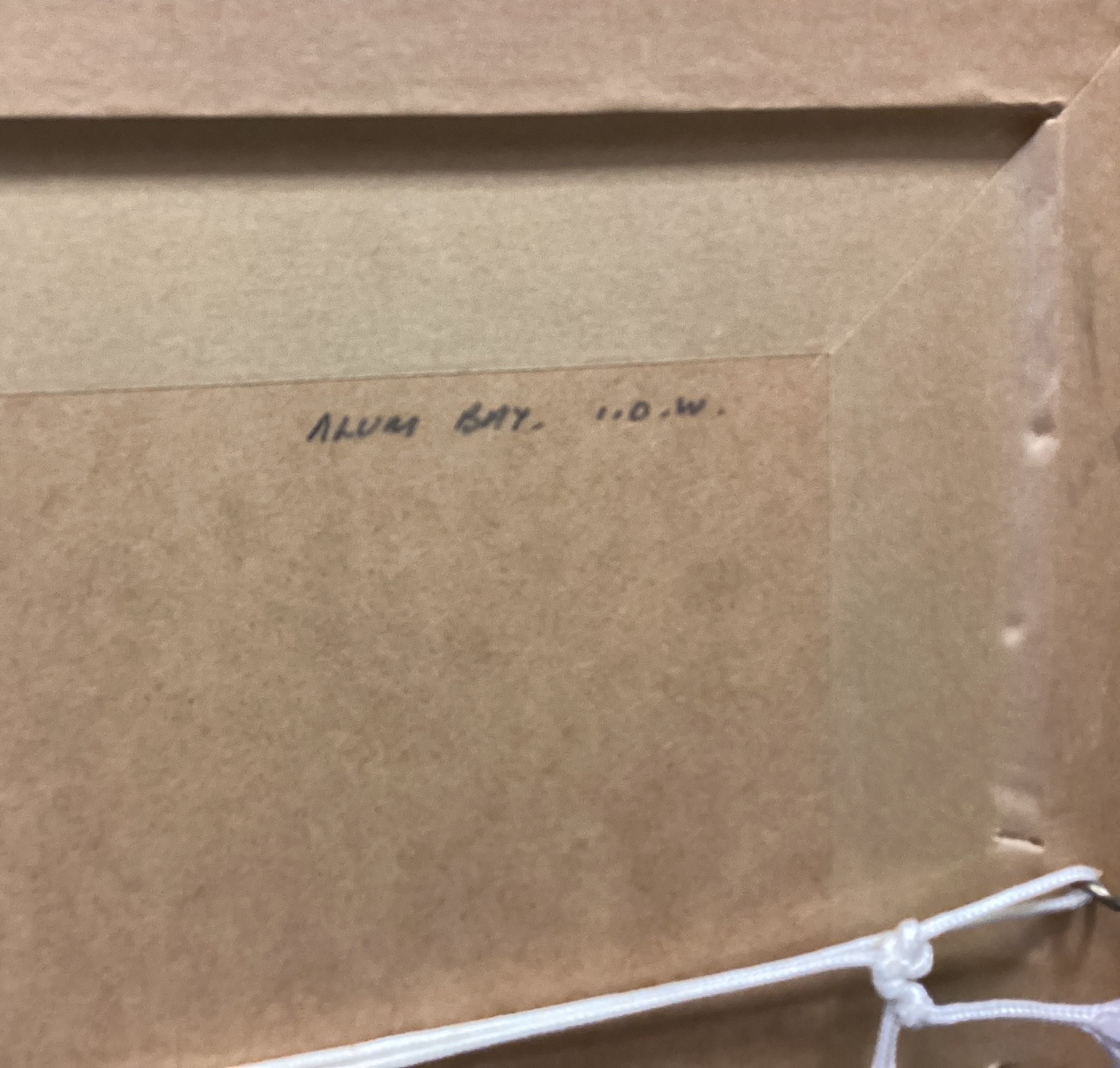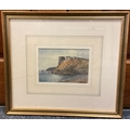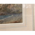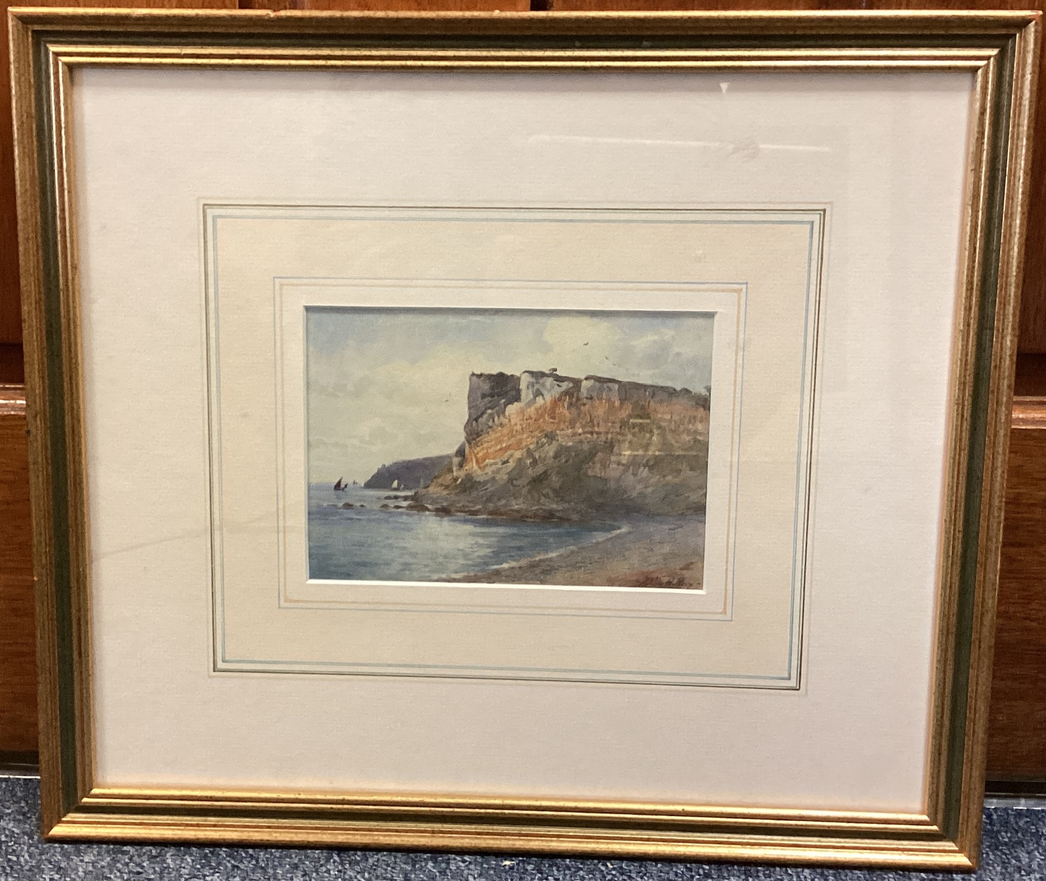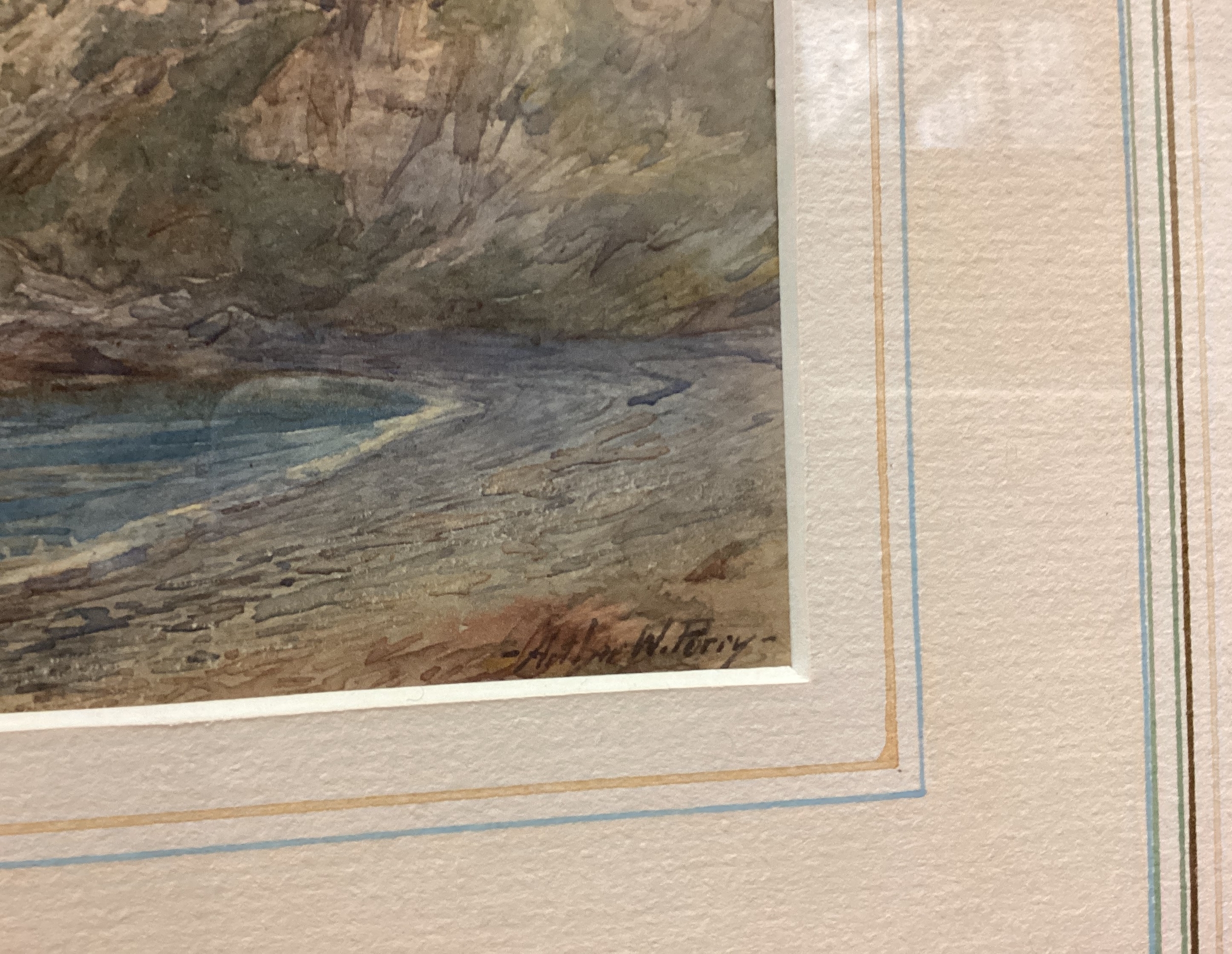 ARTHUR W. PERRY: (British, 1908 - 1938): A framed and glazed watercolour depicting a coastal cliff scene. Signed to bottom right. Inscribed 'ALUM BAY I. O. W. verso. Approx. 17 cm x 12 cm (ss). Est. £60 - £80.