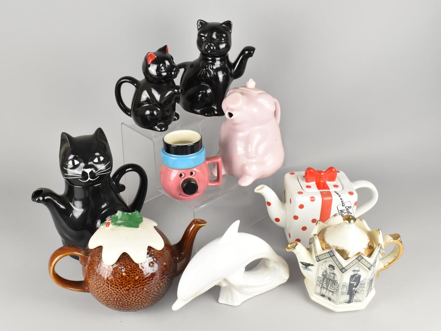 A Collection of Late 20th Century Ceramics to Comprise Novelty Black Cat Teapots, Christmas Pudding Teapot, Pig Teapot, Poole Dolphin etc