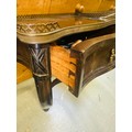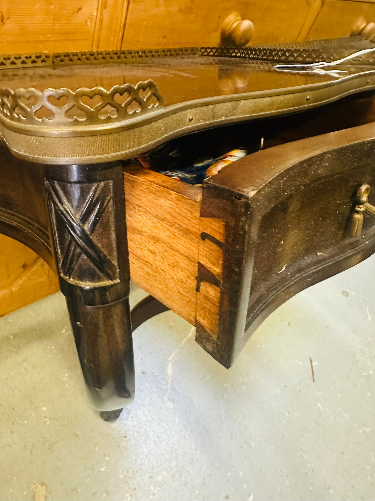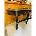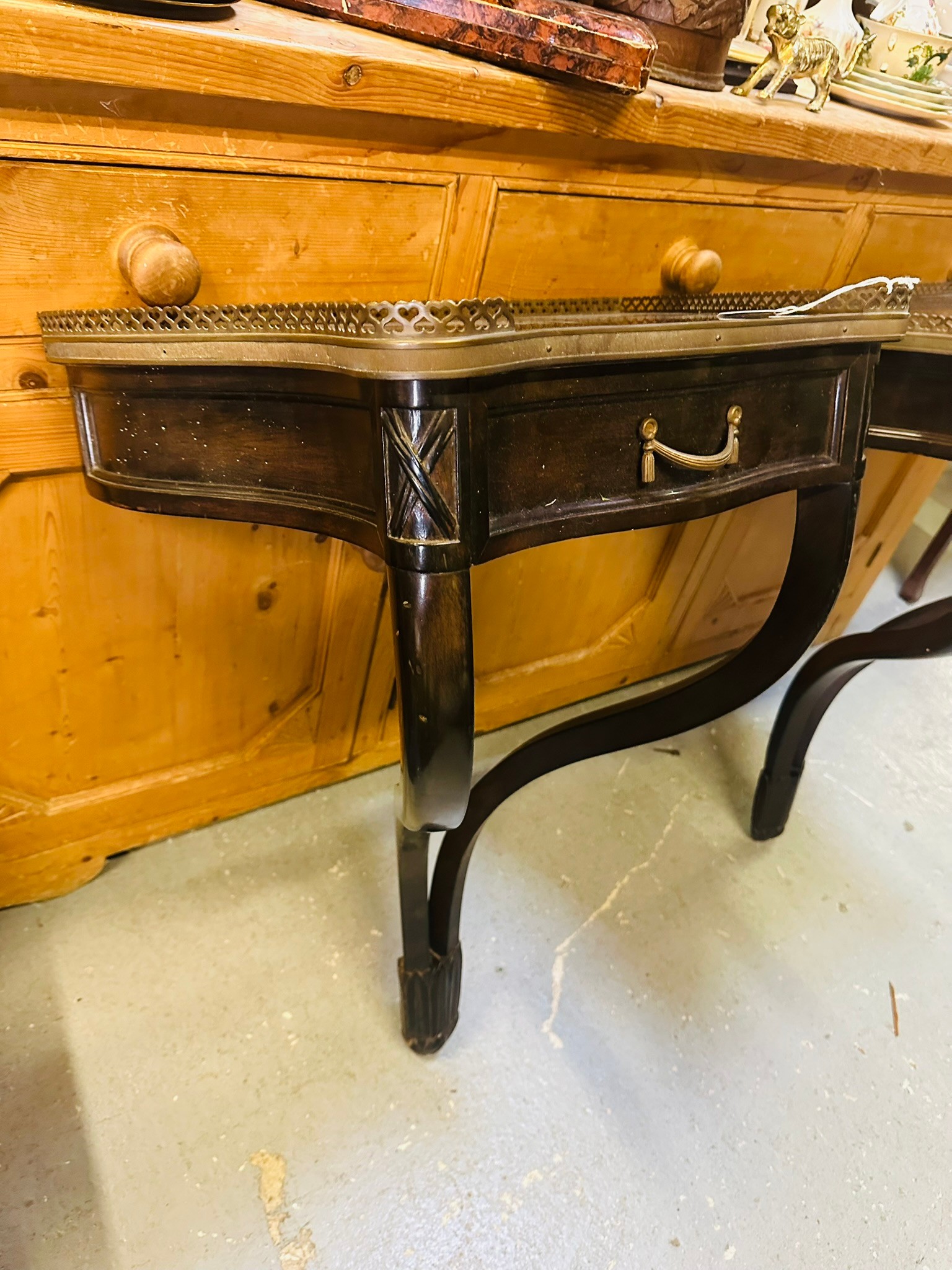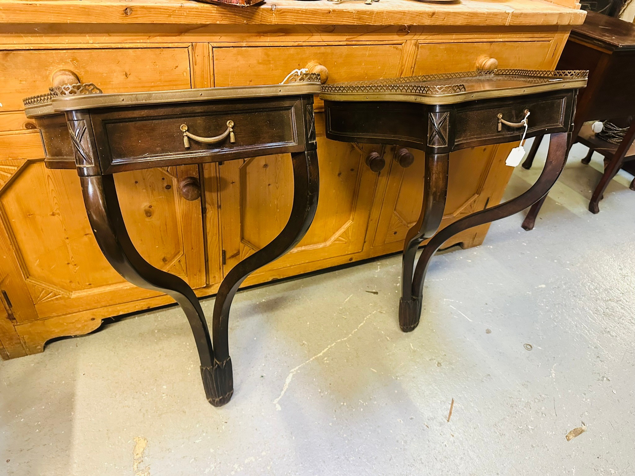 A pair of decoraitve hanging console tables with a brass surround and a single drawer, 99''h x 21''w