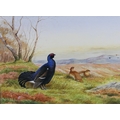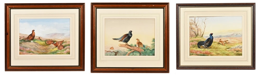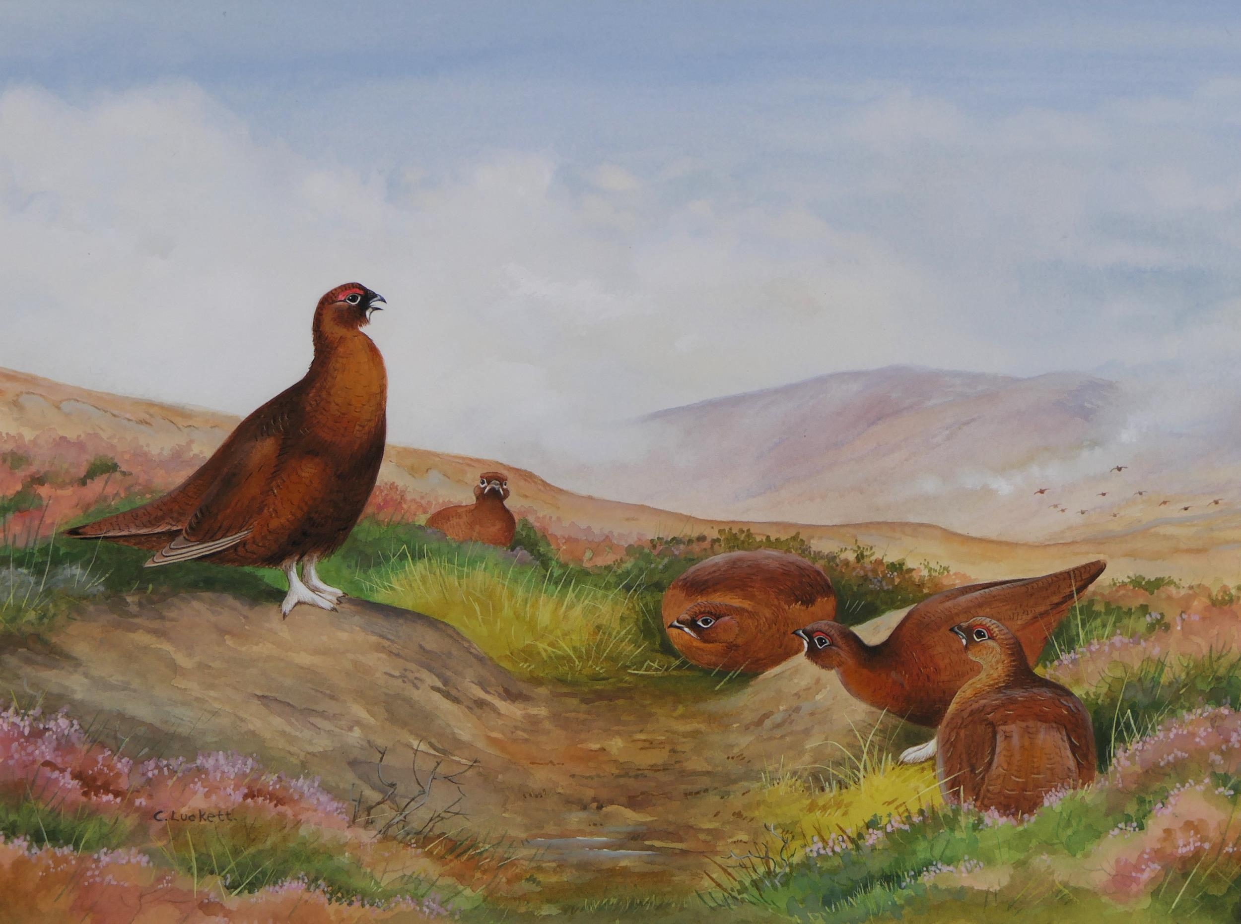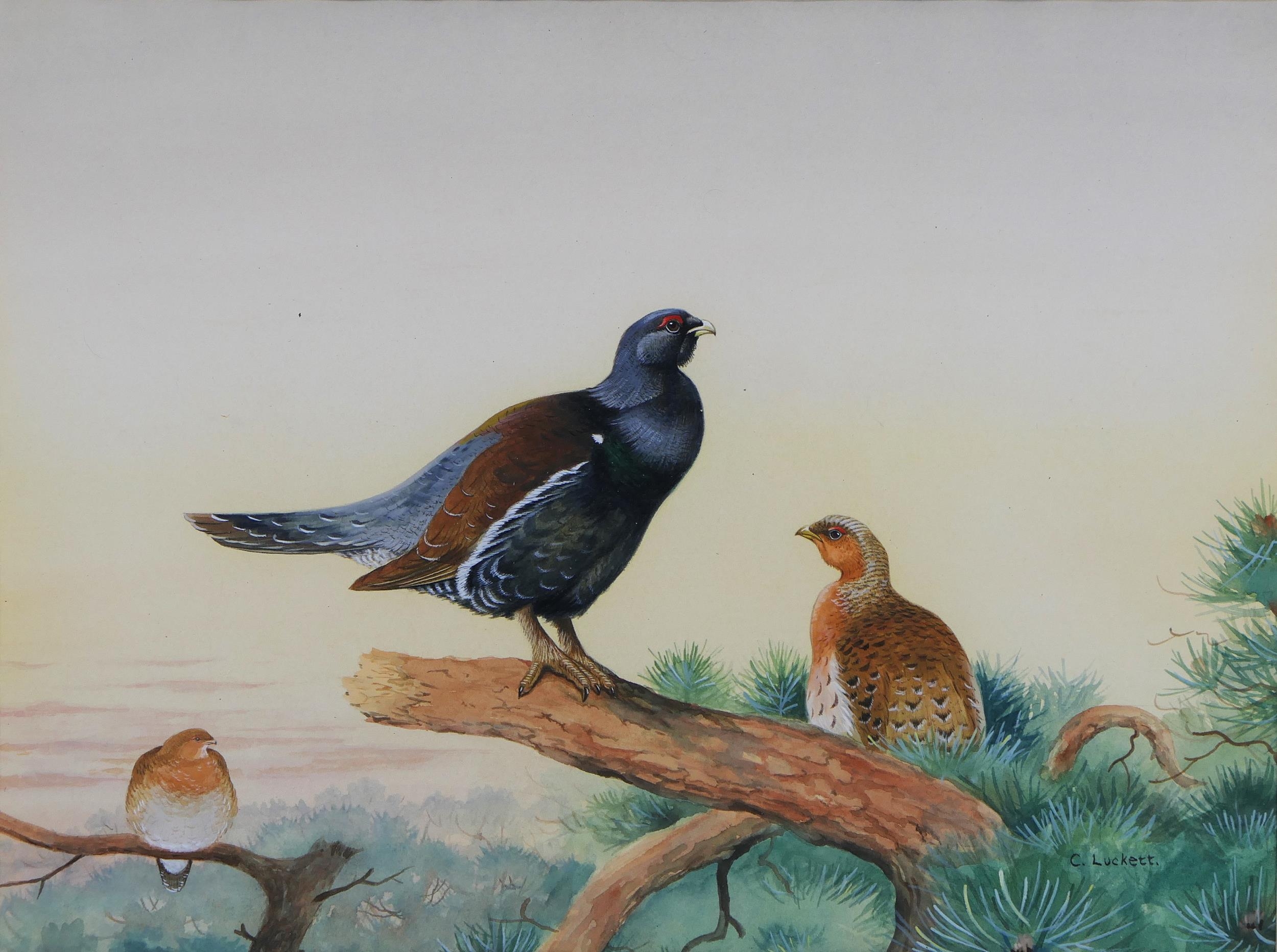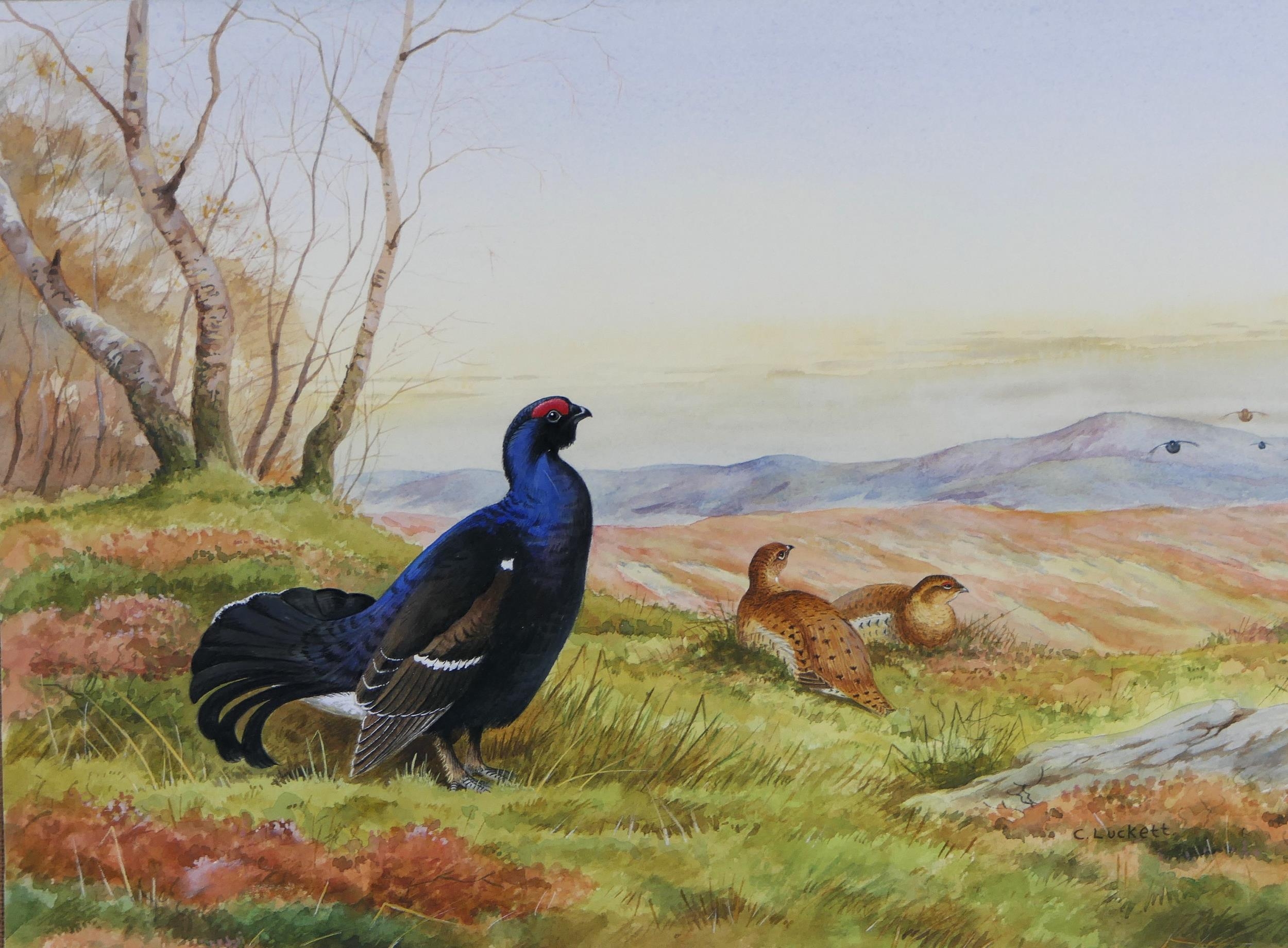 Colin Luckett three watercolours, one of Red Grouse, 30 x 40 cm, framed and mounted. The second of Black Grouse, 30 x 40 cm, framed and mounted. The third of a Capercaille, 30 x 40 cm, framed and mounted.