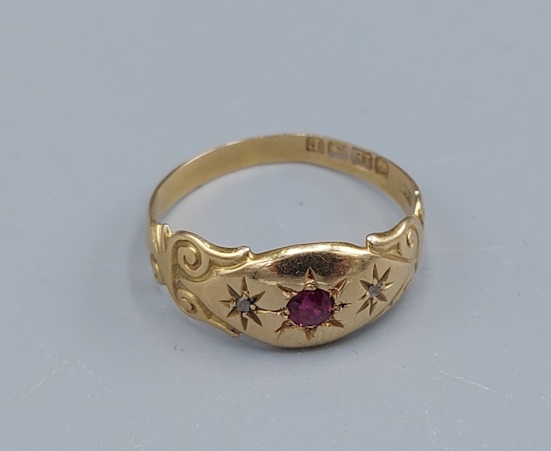 An 18ct gold Ruby and Diamond ring set with a central Ruby flanked by Diamonds, 2.1gms, ring size O