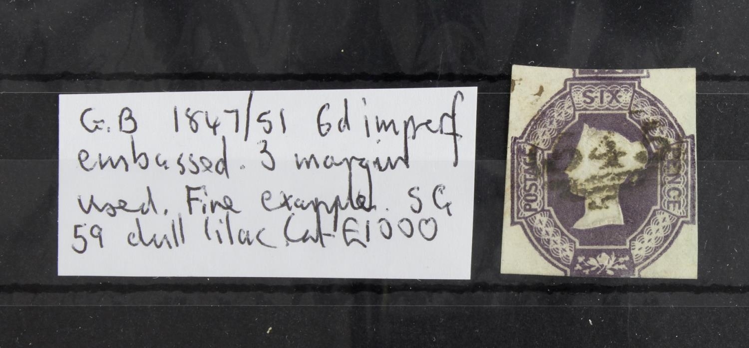 GB - QV 1847/51 6d imperf Embossed, 3 margins, used. Fine example of SG59 dull lilac, cat £1000