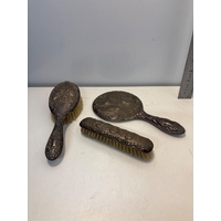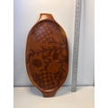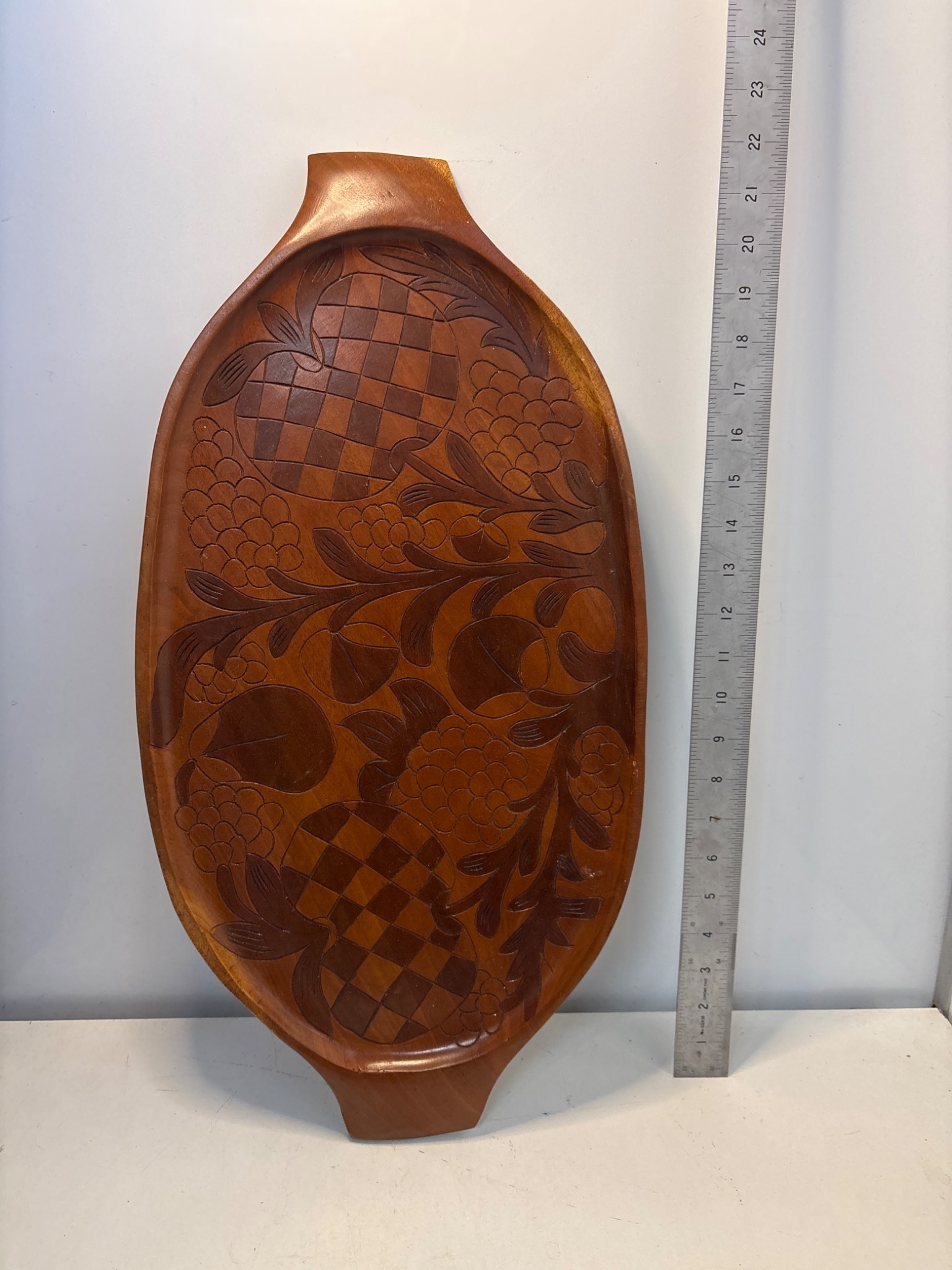 Hand-carved wooden tray with floral and checkered design. Approximately 12 inches long.