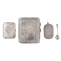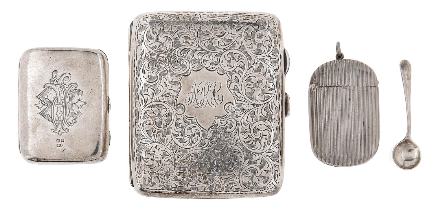A George V silver cigarette case, foliate engraved, 85mm, by J Gloster Ltd, Birmingham 1923, a smaller silver case and a silver salt spoon, 4ozs 2dwts and a plated vesta case (4)
