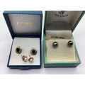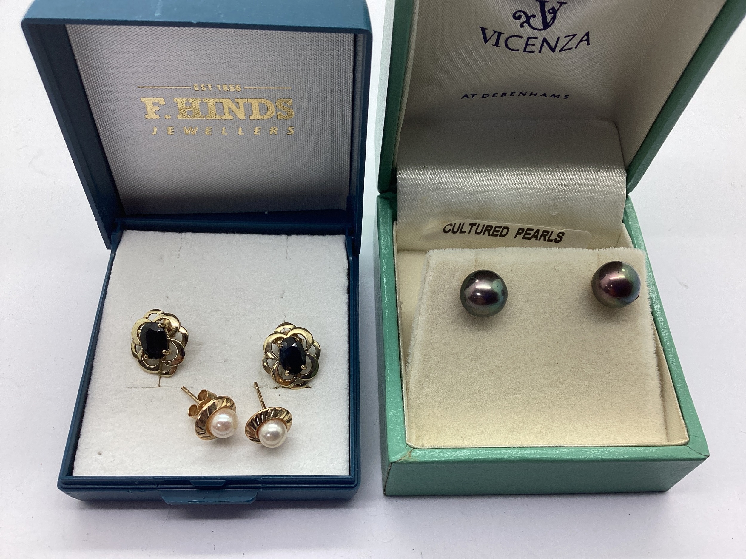 A Pair of Decorative Single Stone Earstuds, oval claw set to centre within pierced surround, together with a pair of freshwater peacock coloured pearl earstuds, another pair of freshwater pearl bead earstuds. (3)