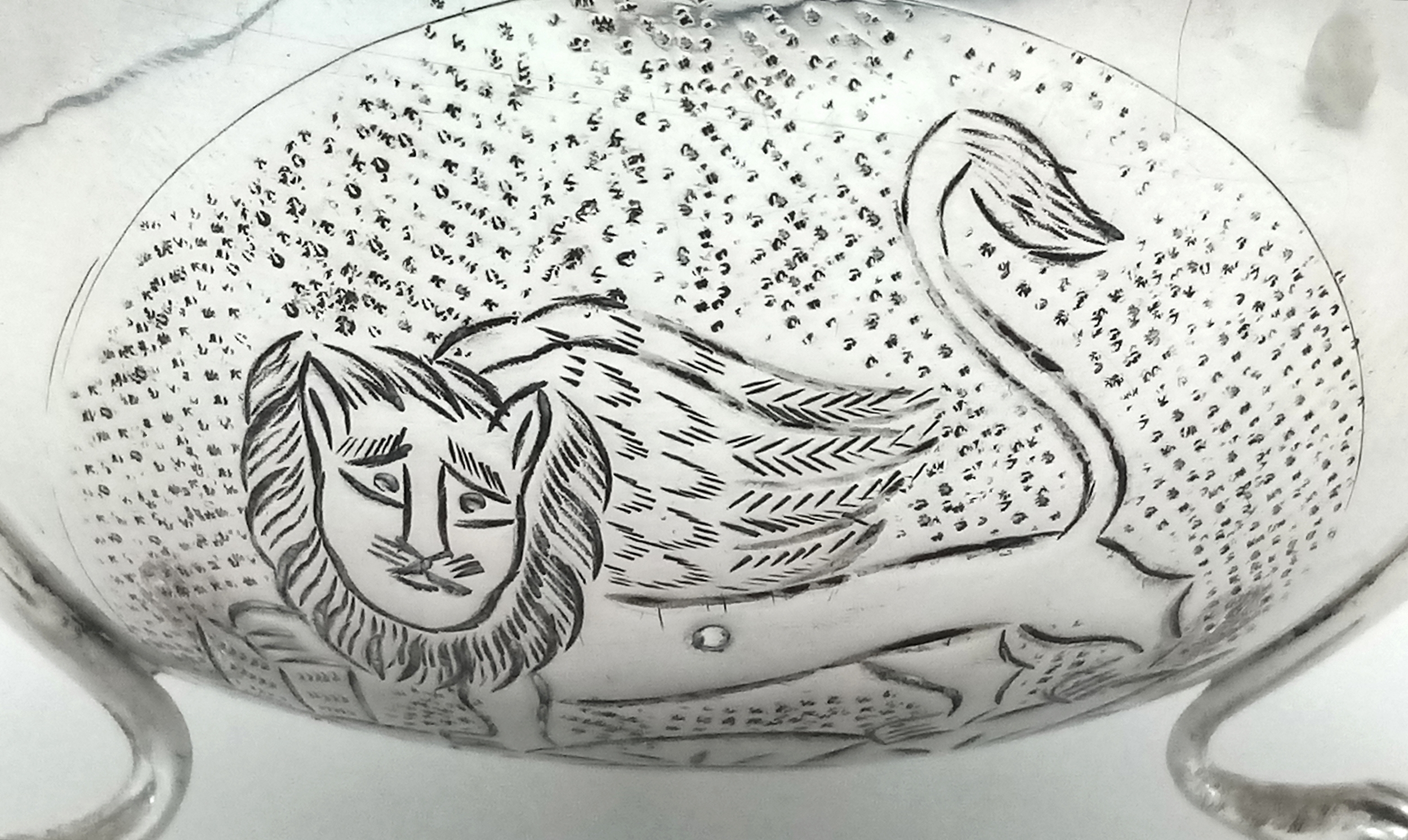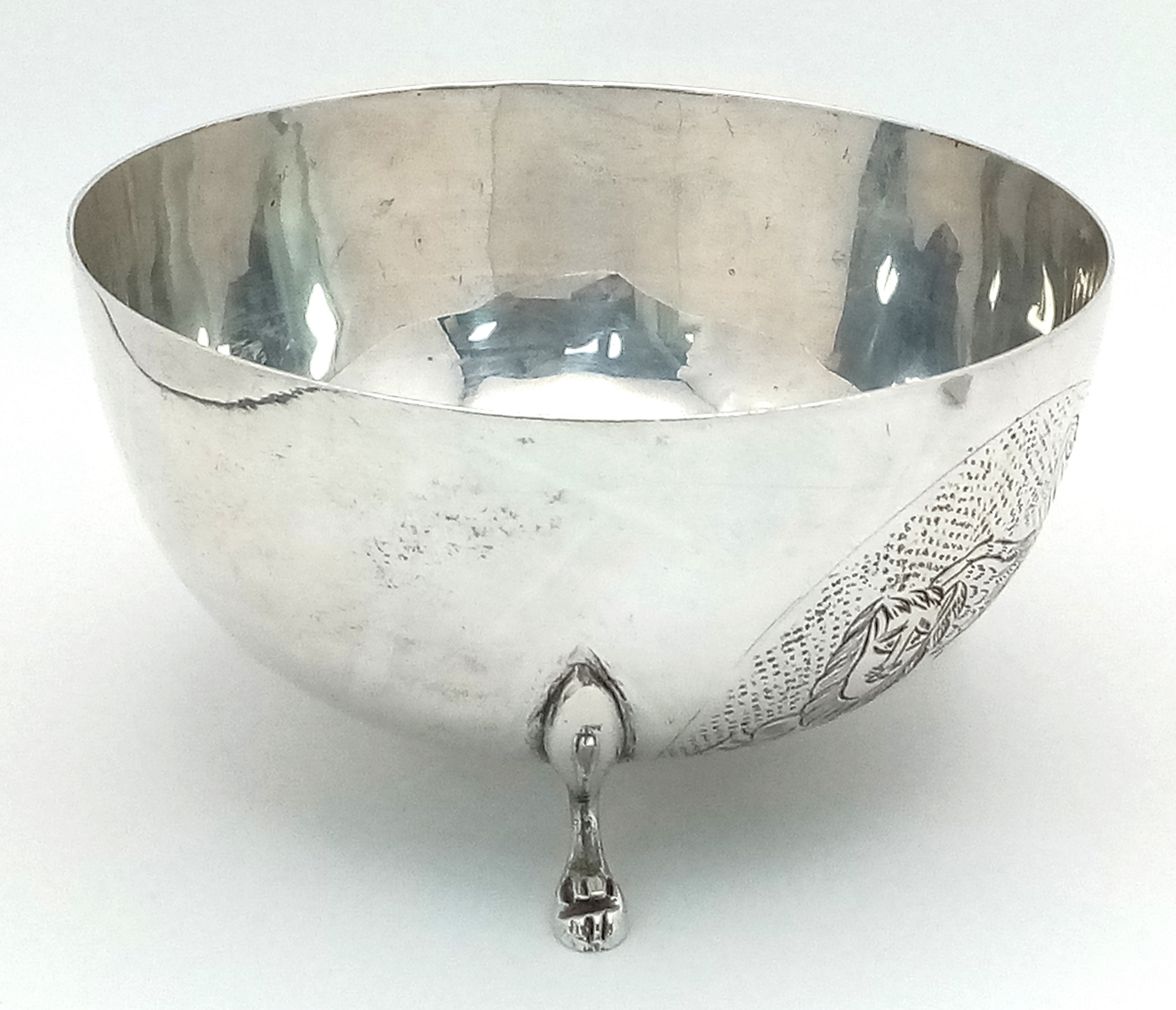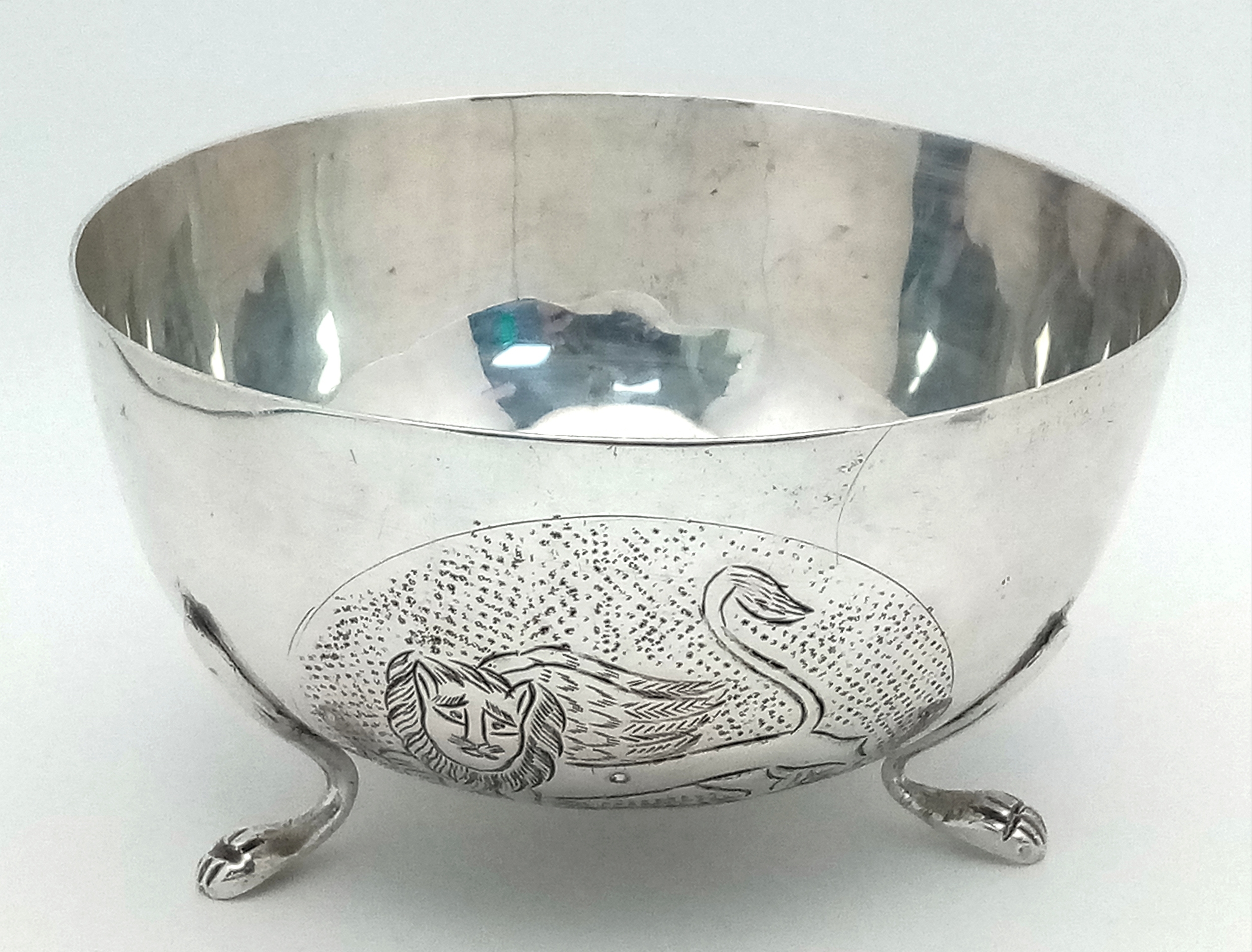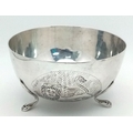 An Antique 800 Silver Bowl with Decorative Swan Pattern and Three Paw Feet. 10.5cm diameter at top. 6cm height. 91g.