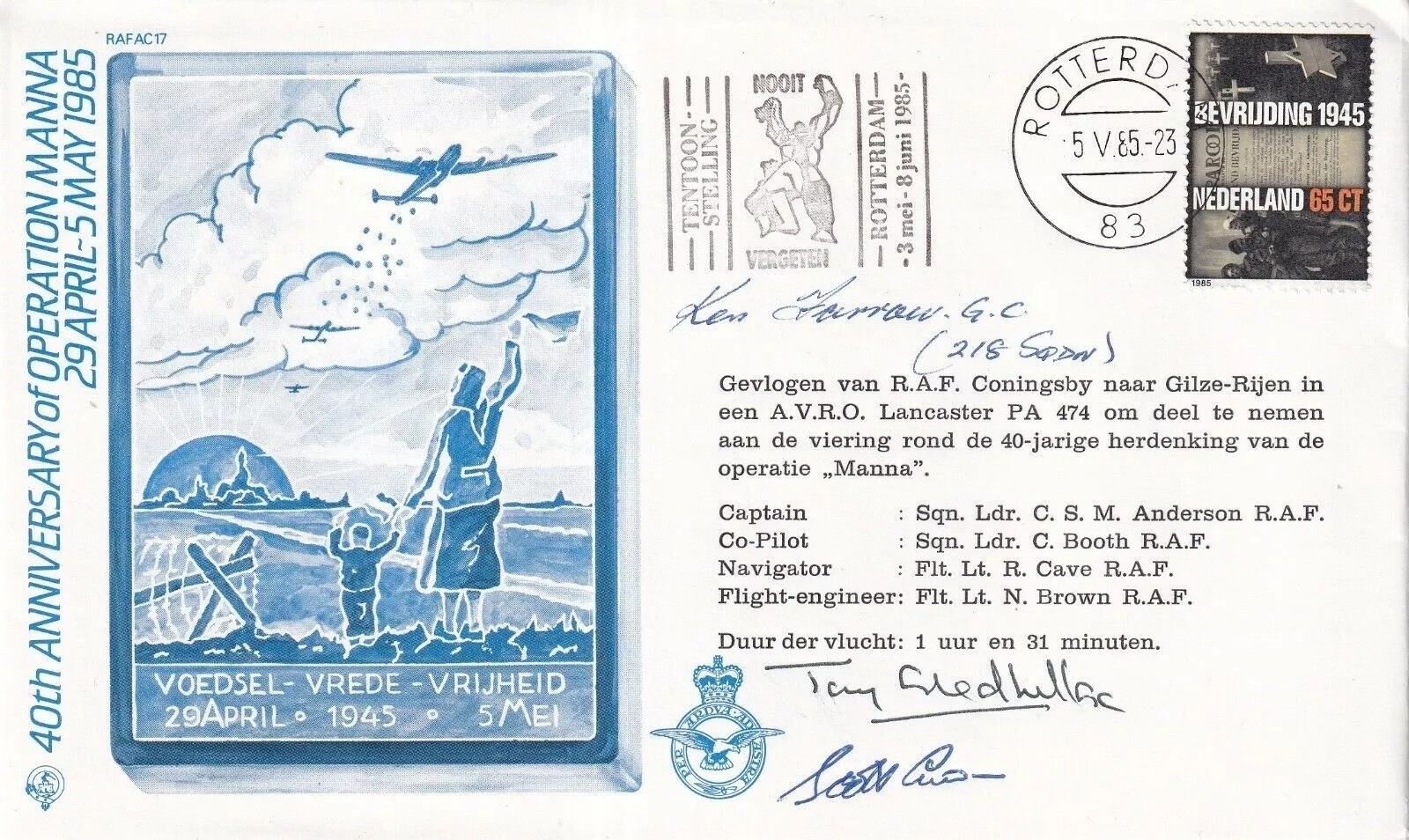 40th Anniversary of Operation Manna Signed K Farrow, T Gledhill GC Holders. 5 V 85 83 Rotterdam Postmark 40th Anniversary of Operation Manna Flown in Lancaster. Personally Signed by the Lancaster Pilot Sqn Ldr C S M Anderson also Signed by Kenneth Farrow GC, won George Cross 21 Jun 48 (Cardiff City Police Force). Ken Farrow GC ( Police Constable ) rescued a child who had fallen into the feeder, an aqueduct which supplies water from the river Taff to Cardiff, running under concrete slabs Served in the Second World War with 218 Sqn as a Sergeant Air Gunner. Anthony John Gledhill George Cross Holder, He was serving as a constable in the Metropolitan Police Force at the time. His partner, Constable Terry McFall, won the George Cross for the same action. They were on patrol when they were ordered to chase a car driving the wrong way down a one way street. Fifteen shots were fired at their police car during the ensuing chase. The criminals' car crashed into a lorry and they attacked the police officers, who were trying to arrest them. Both police officers were injured in the confrontation but managed to subdue the men until assistance arrived. Single Vendor RAF cover collection. Good condition. All autographs come with a Certificate of Authenticity. We combine postage on multiple winning lots and can ship worldwide. UK postage from £5.99, EU from £7.99, Rest of World from £9.99
