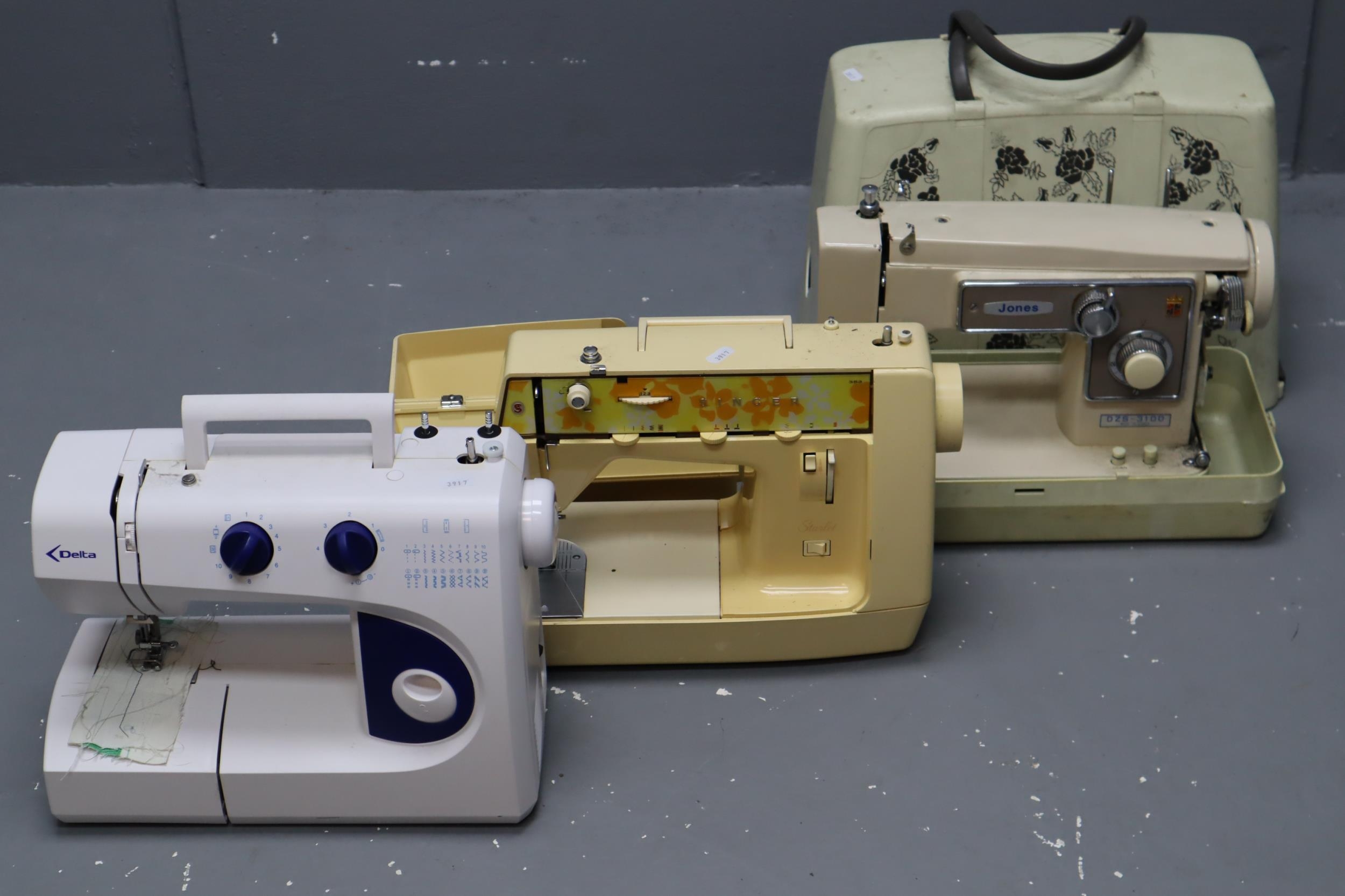 Three Sewing Machines all untested two with no power leads to include Delta, Jones and Singer (with power lead but smells when tested)