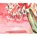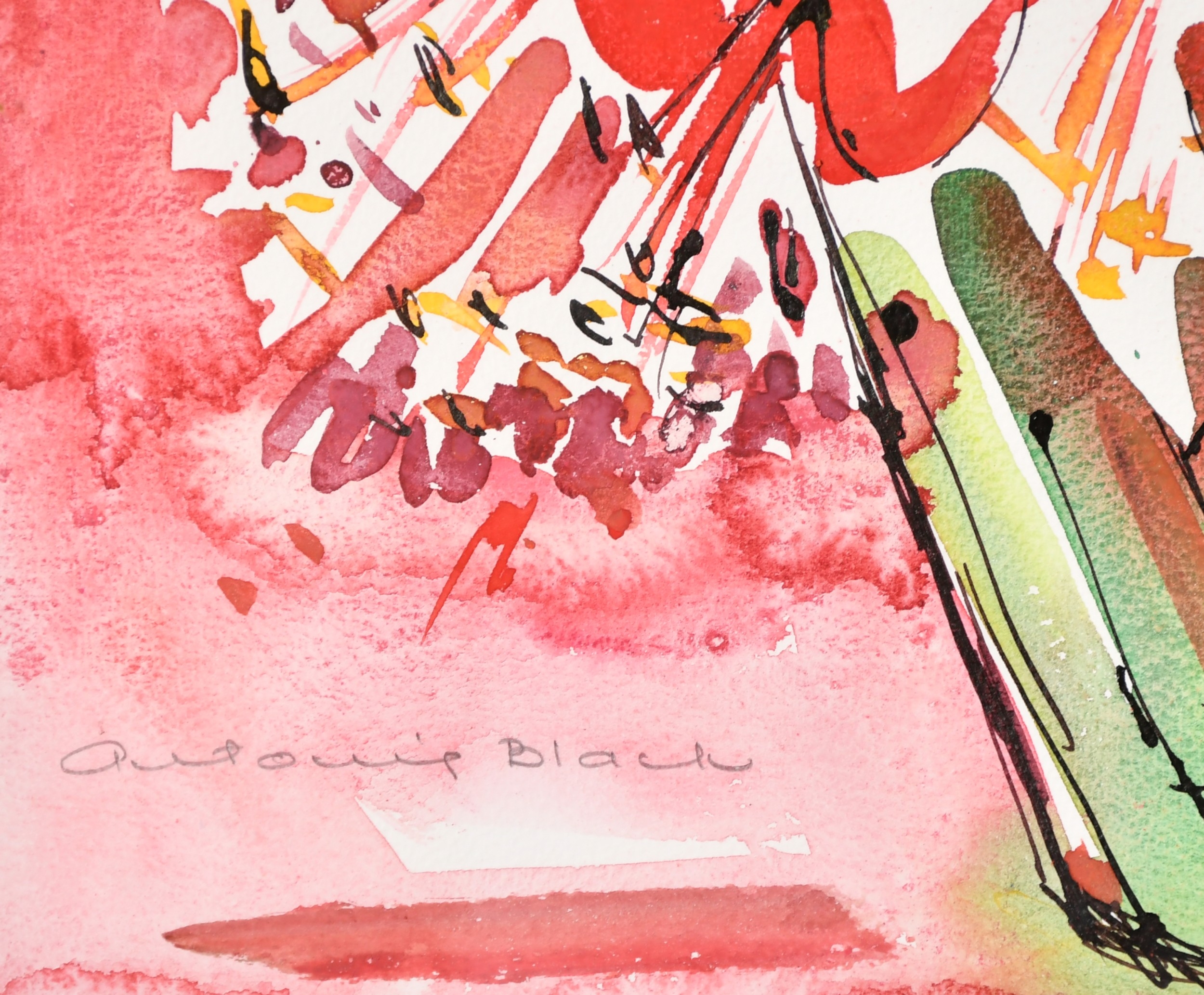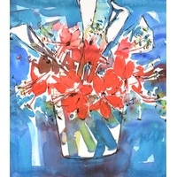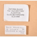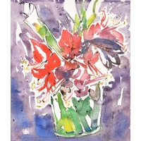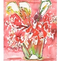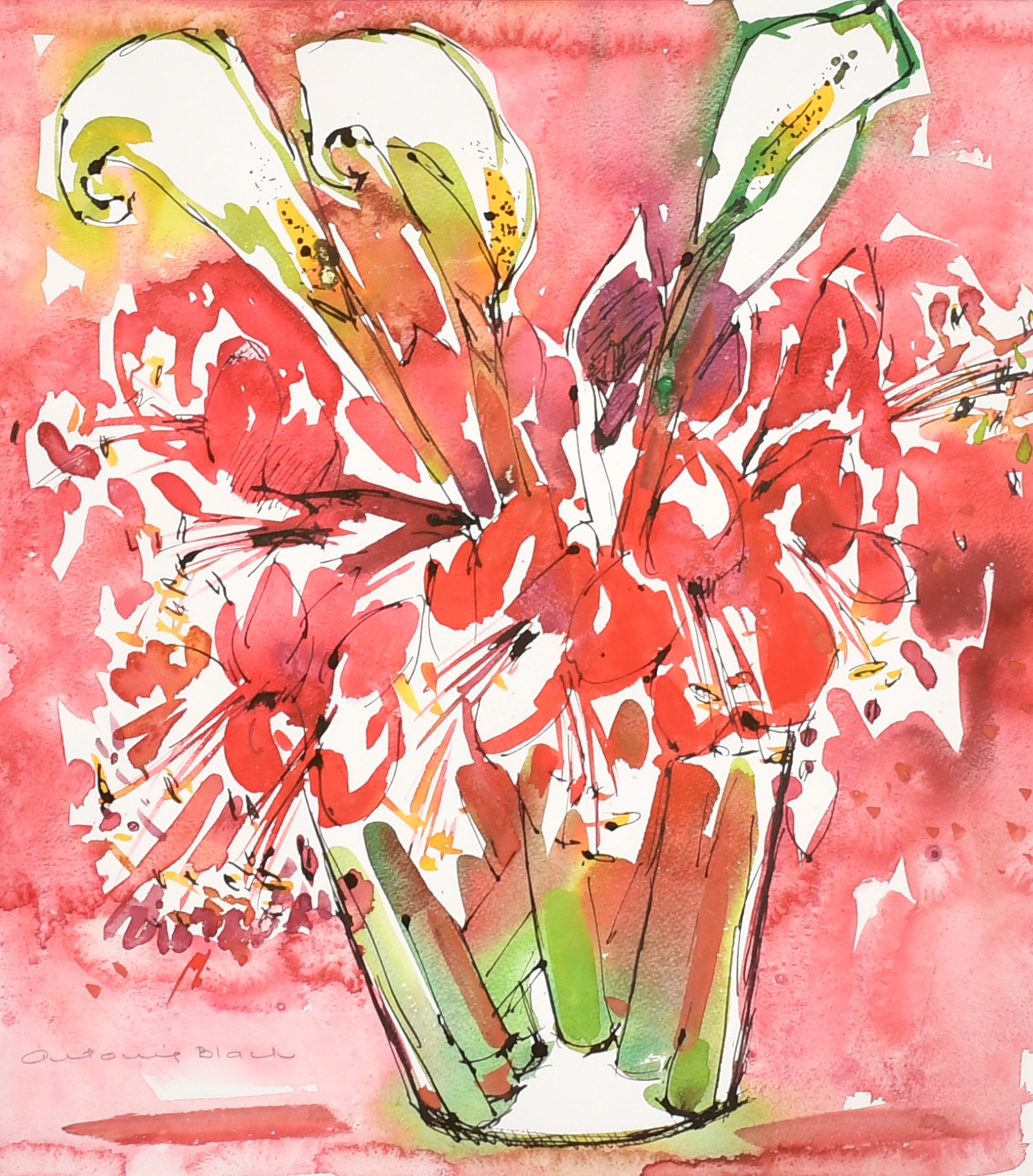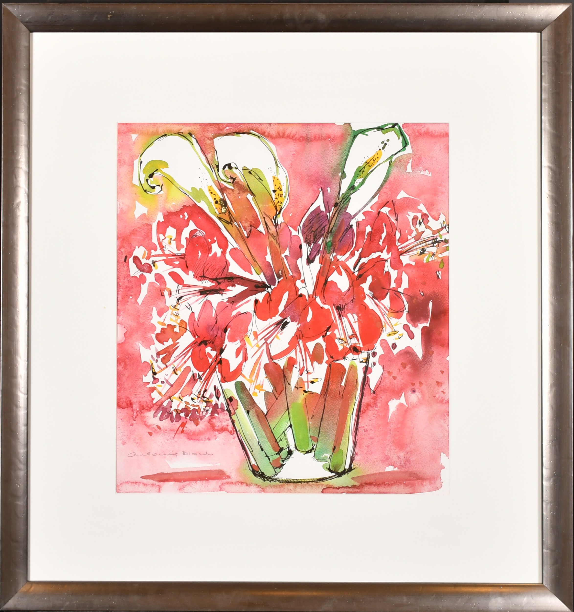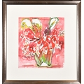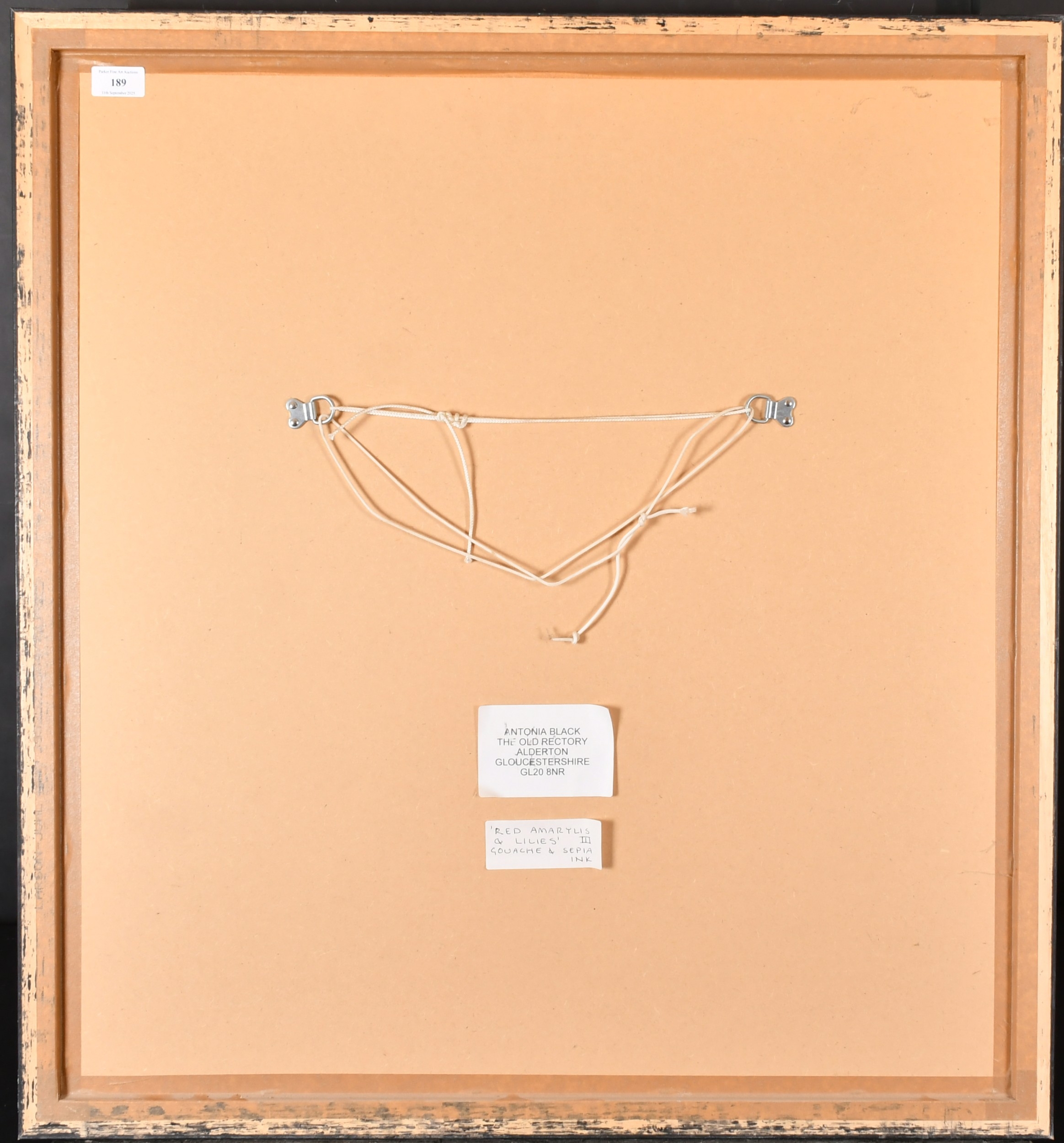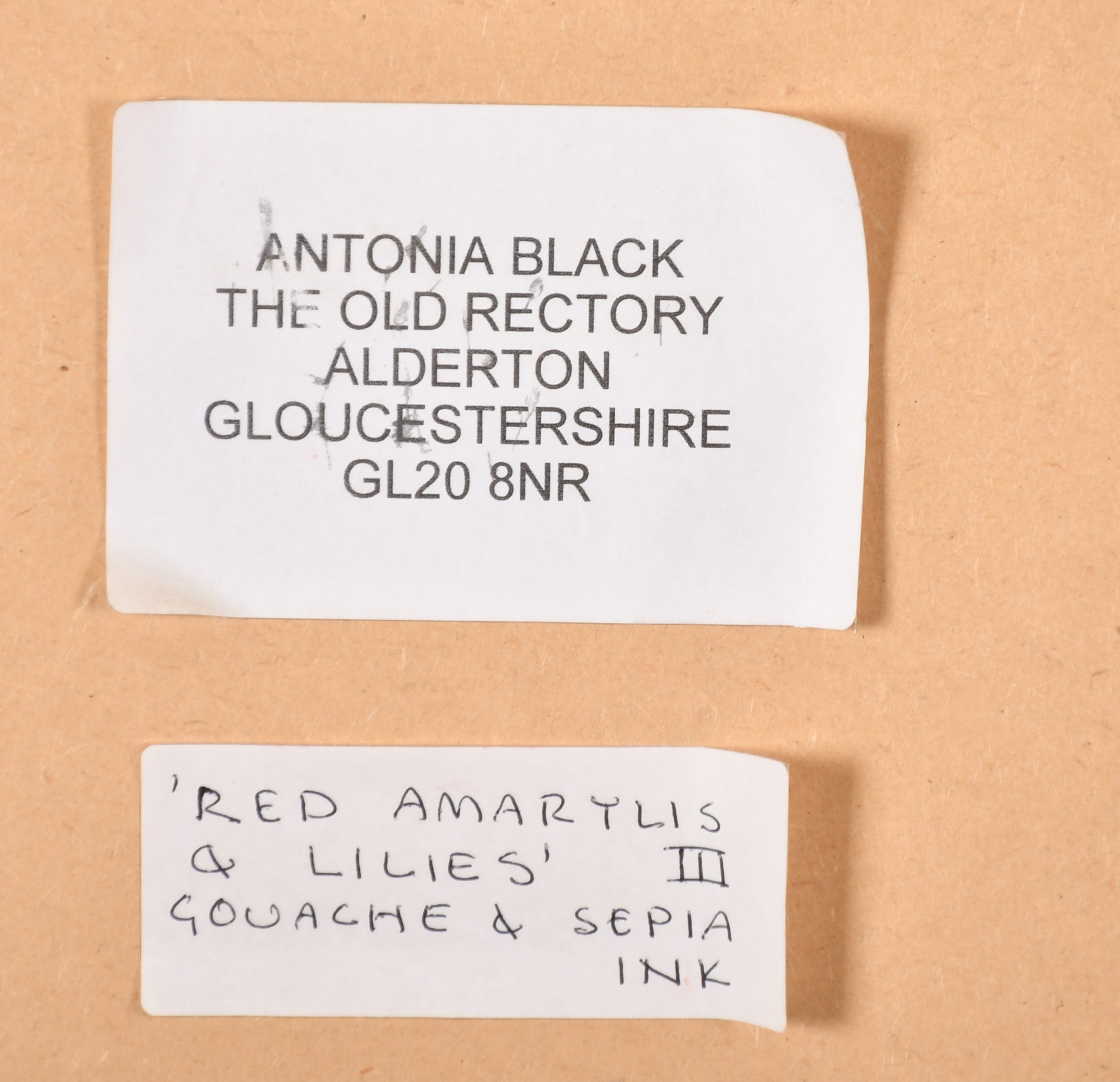 Antonia Black (1938- ) Australian/British. "Red Amaryllis & Lilies III", Gouache and sepia ink, Signed in pencil, and inscribed on labels verso, 20" x 17.5" (50.8 x 44.4cm)