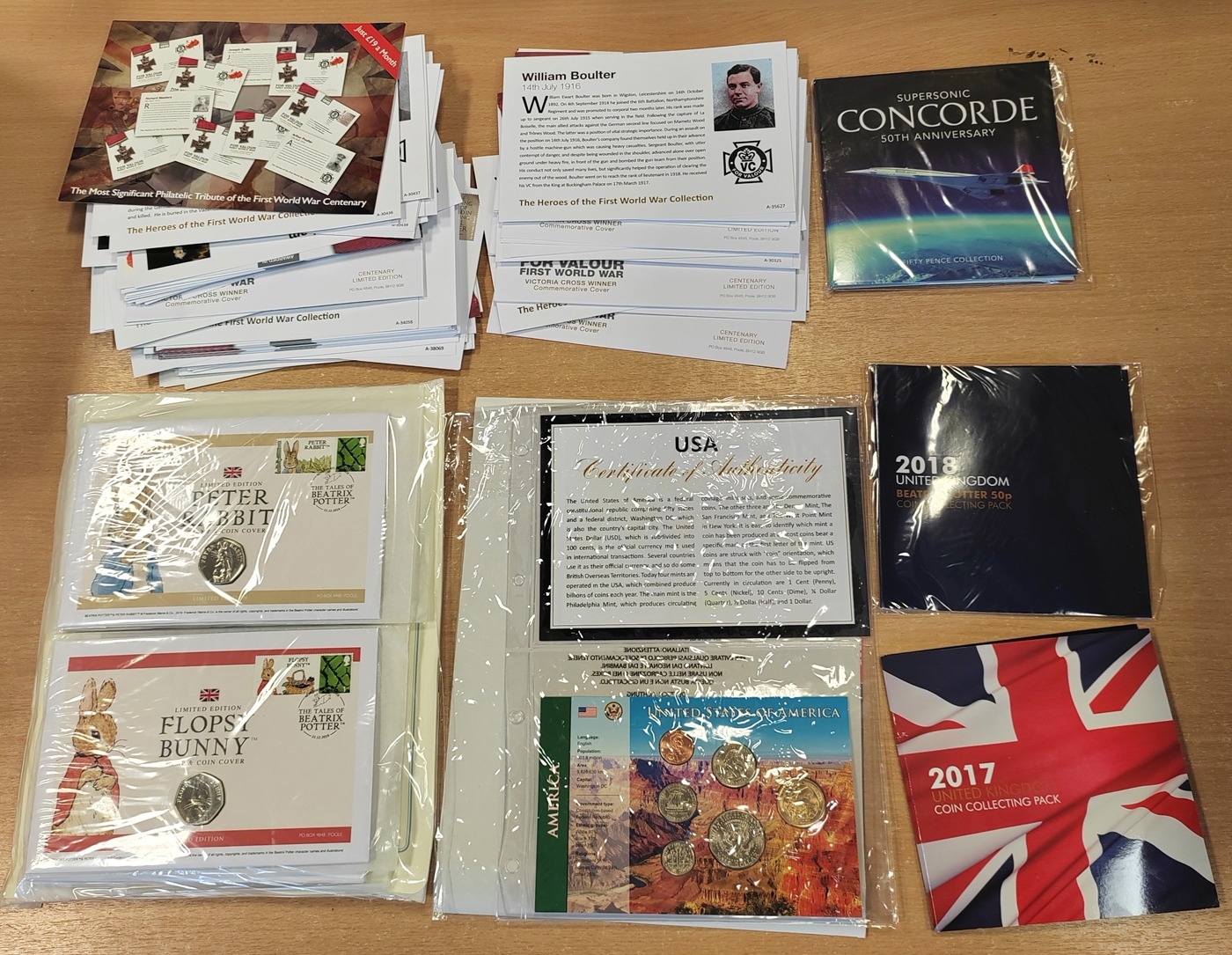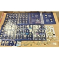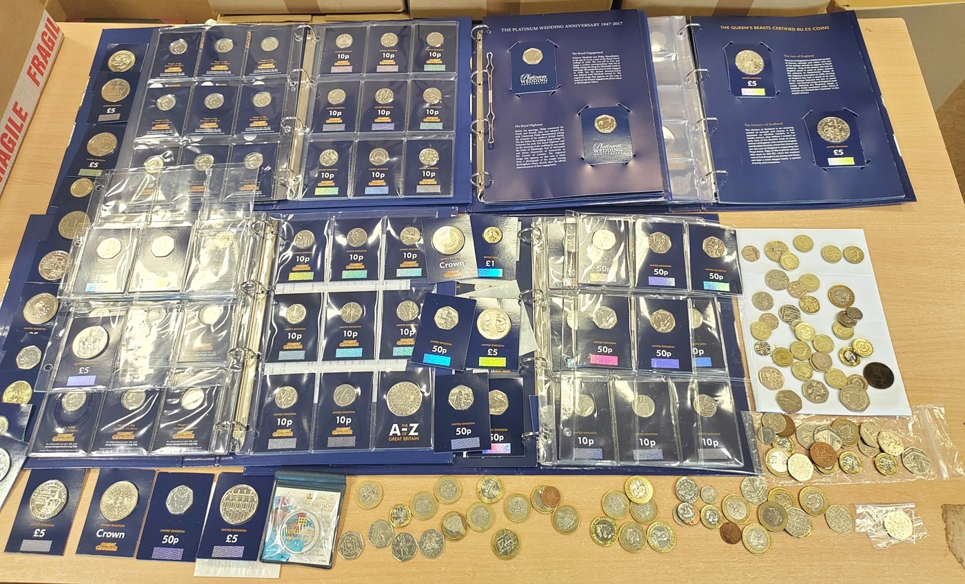 Change Checker collection in 4 folders with crowns, £5, £2, £1, 50p, 10p, plus similar loose, Beatrix Potter 50p coin covers etc. (B)