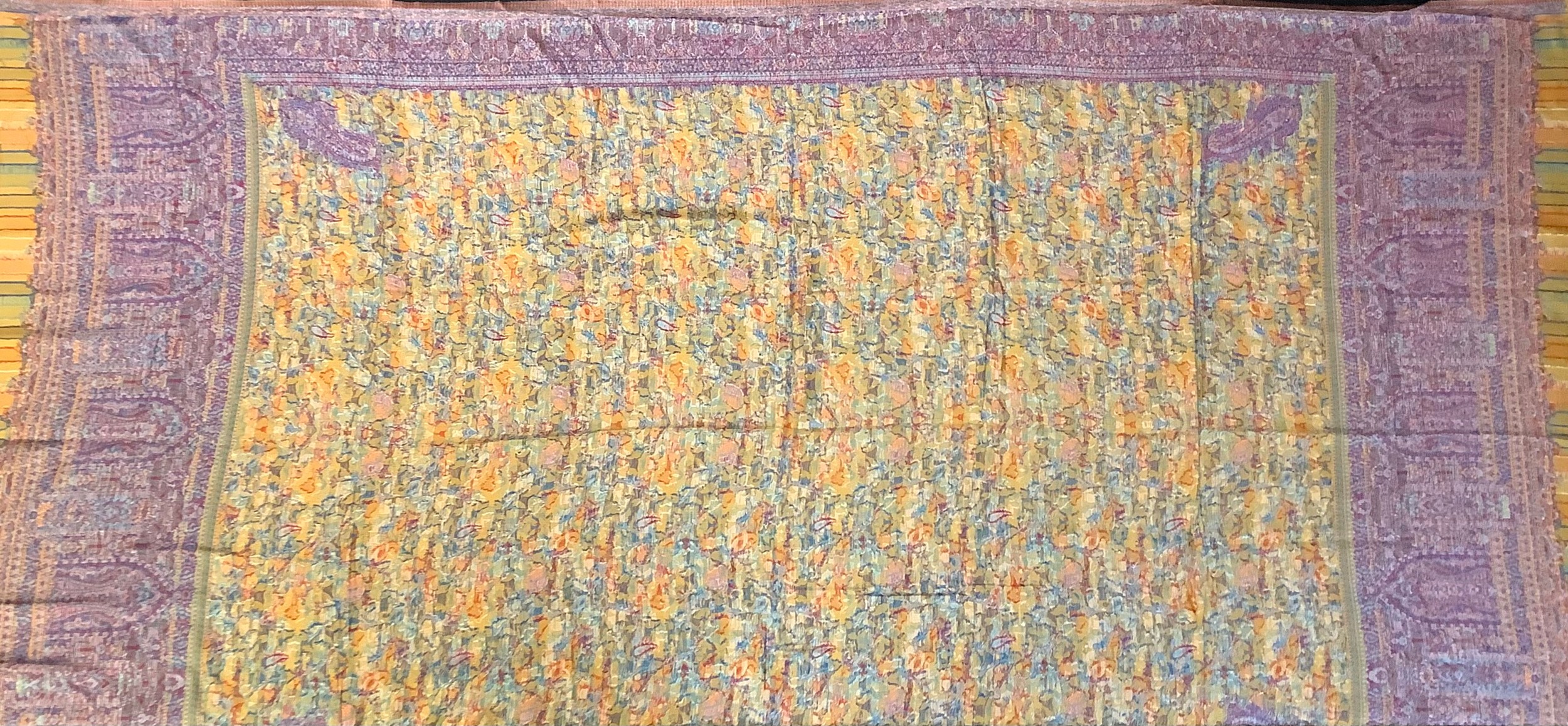 Textiles - a silk and wool Paisley shawl, in shades of red, green and blue on a yellow ground, 100cm x 200cm