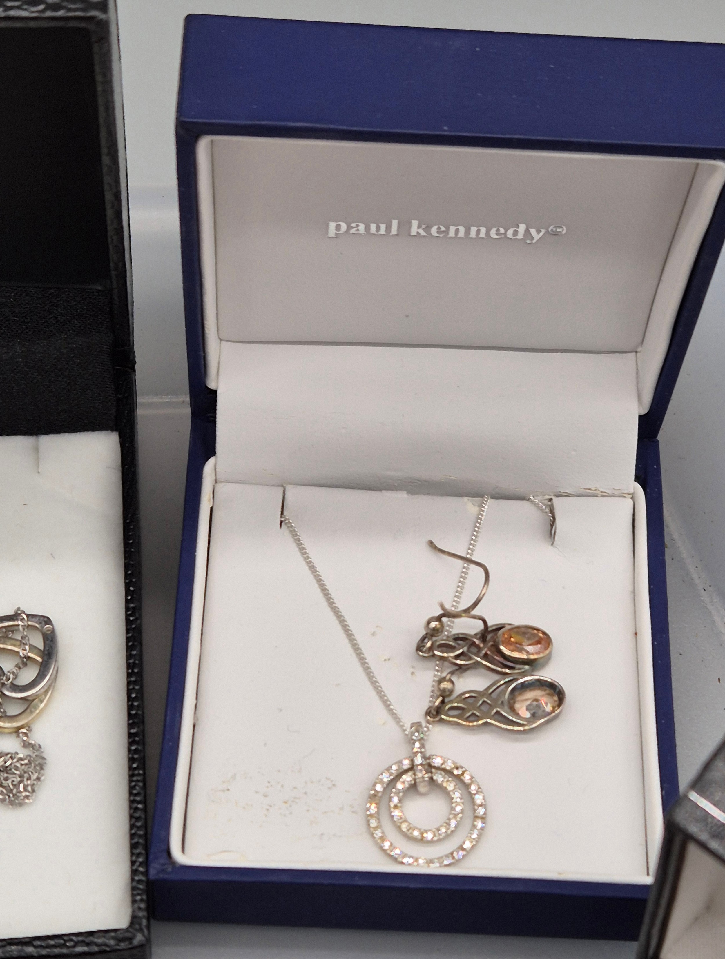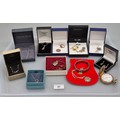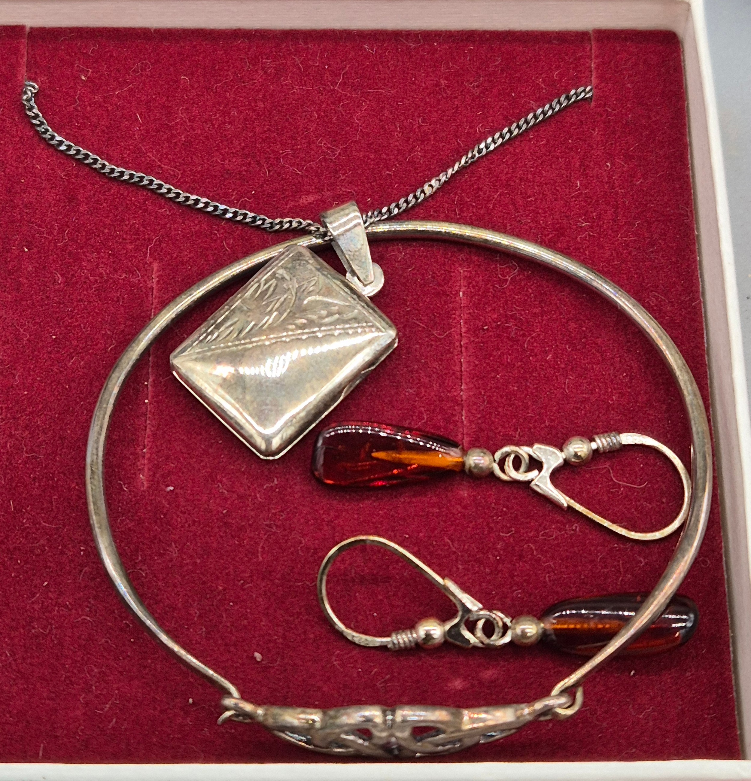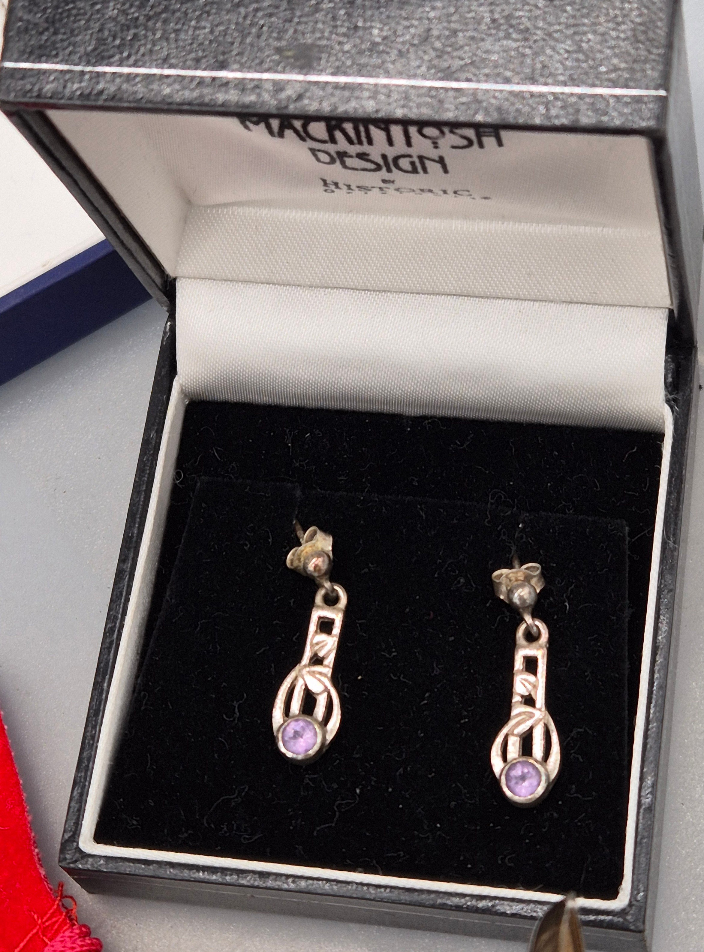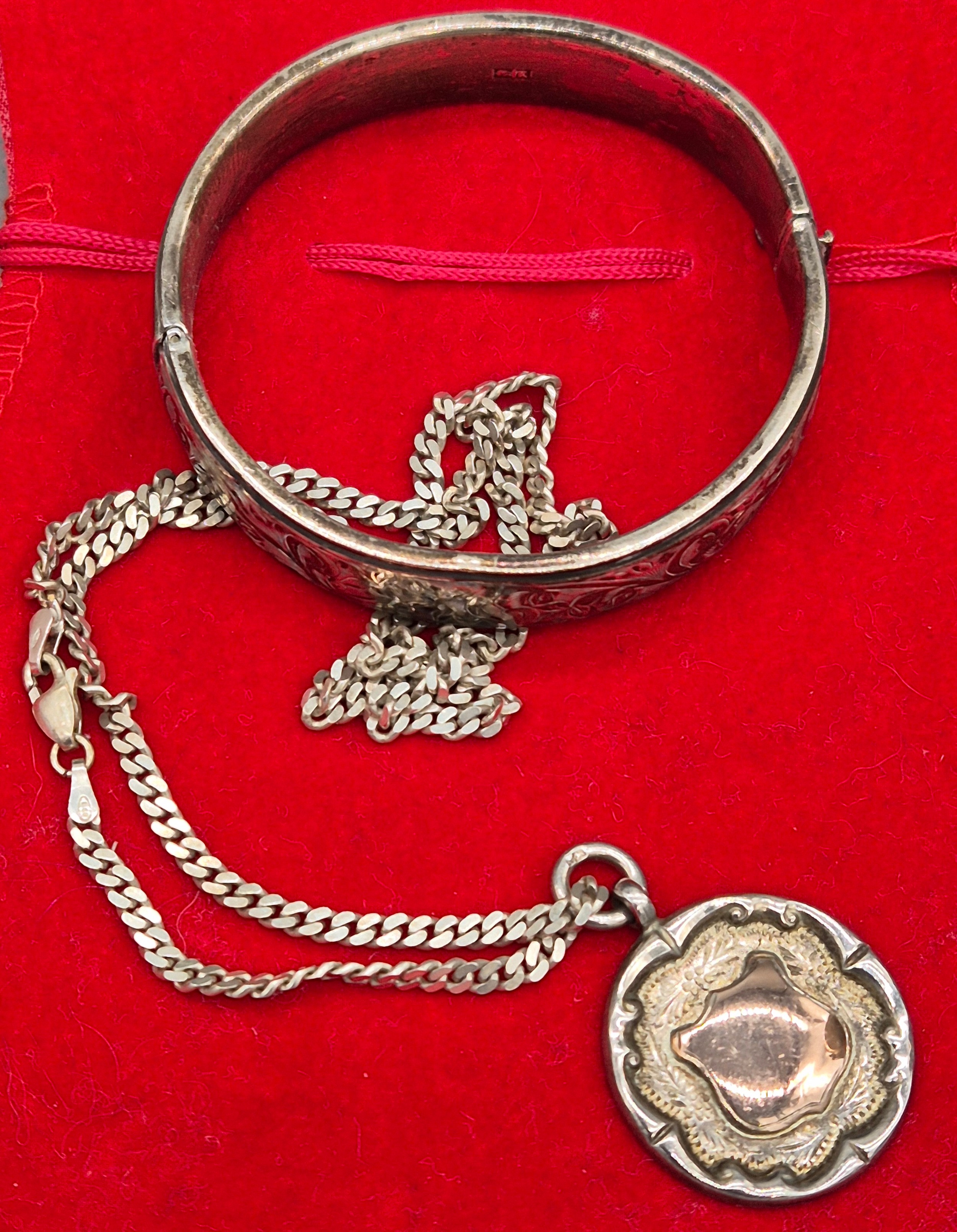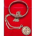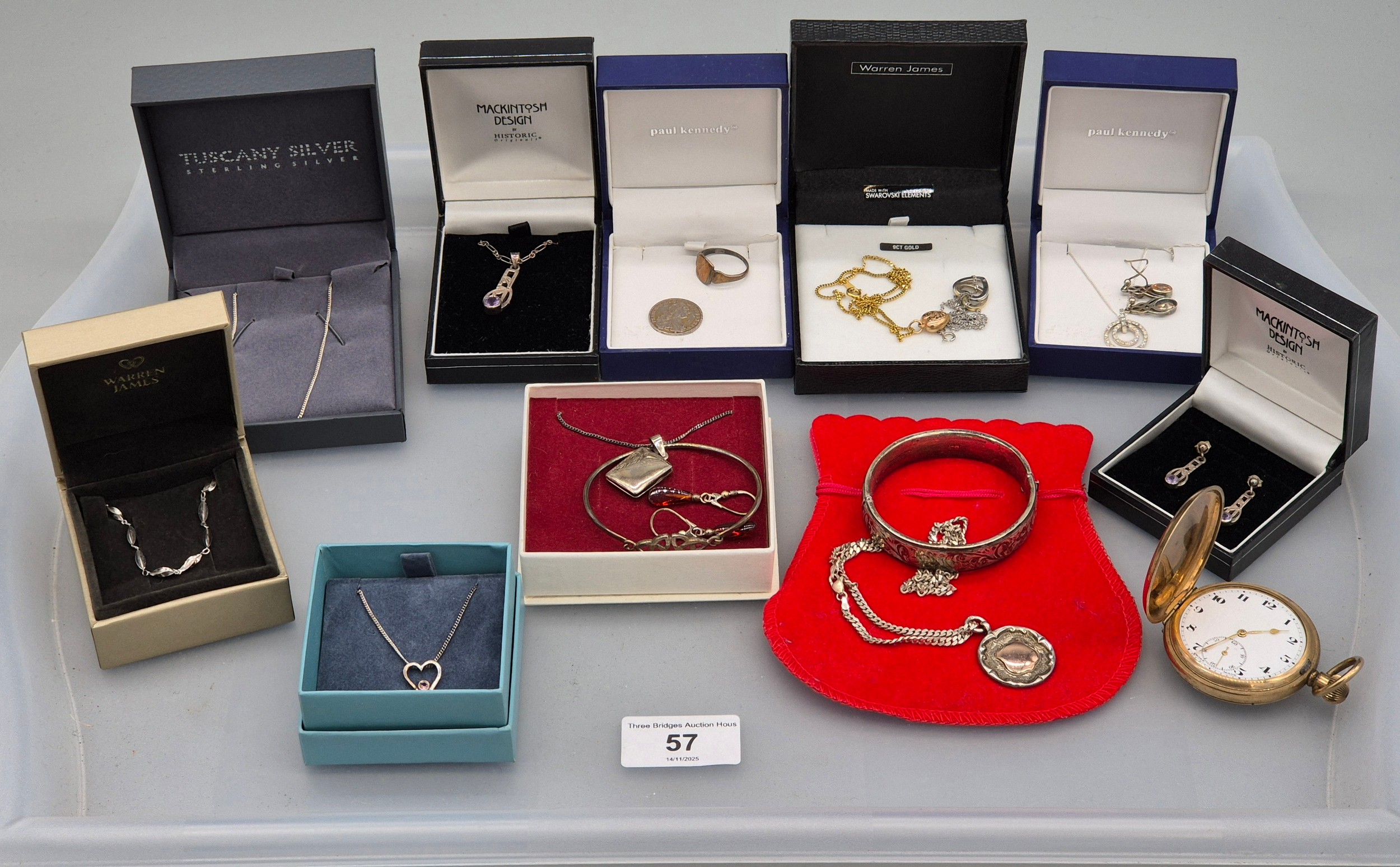 Tray of Silver Jewellery and Odds; Silver Bangle. Silver fob medal and silver Curb necklace. Various Mackintosh design silver jewellery. Gold plated pocket watch other items.