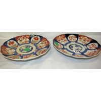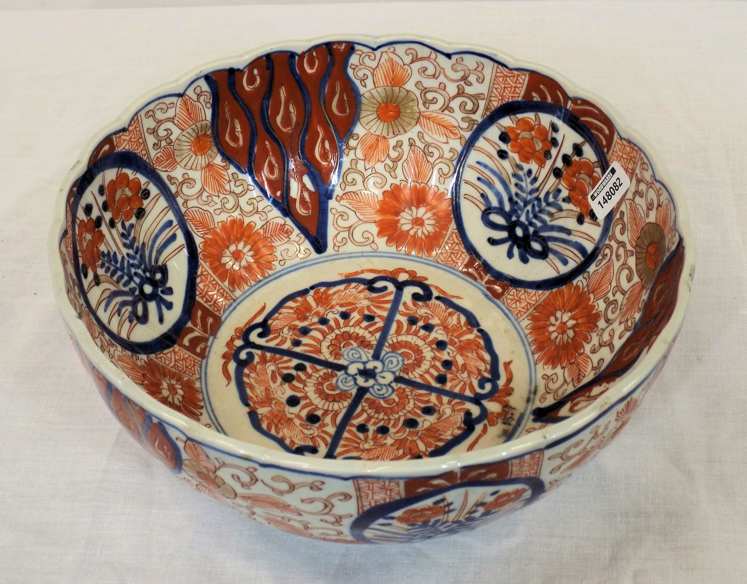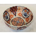 Imari style circular bowl with ornate deep blue and burnt ochre decoration and wavy rim