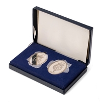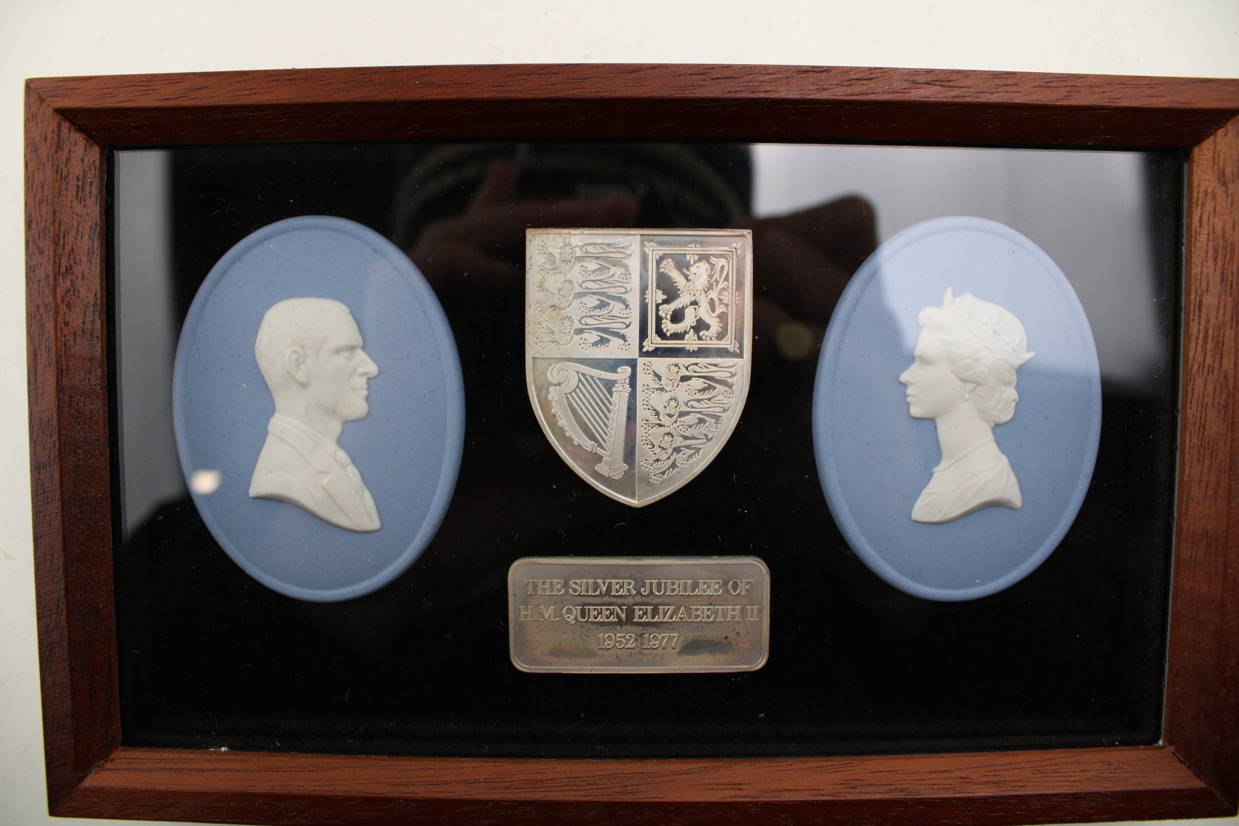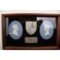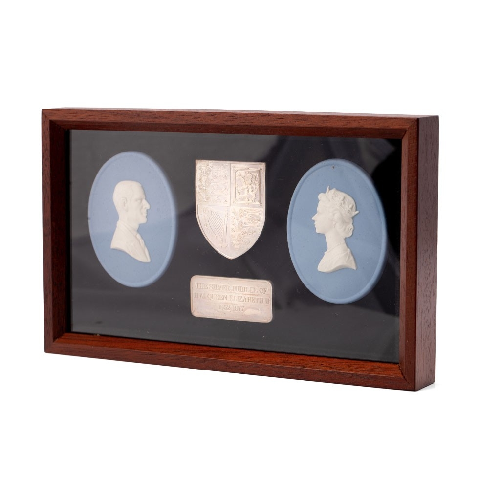 Pair of Wedgwood 1977 Jubilee QEII & Duke of Edinburgh plaques with heavy silver ingot, thought to be 1 oz appx, plus smaller ingot that is probably silver. Sealed frame so cannot confirm weights.