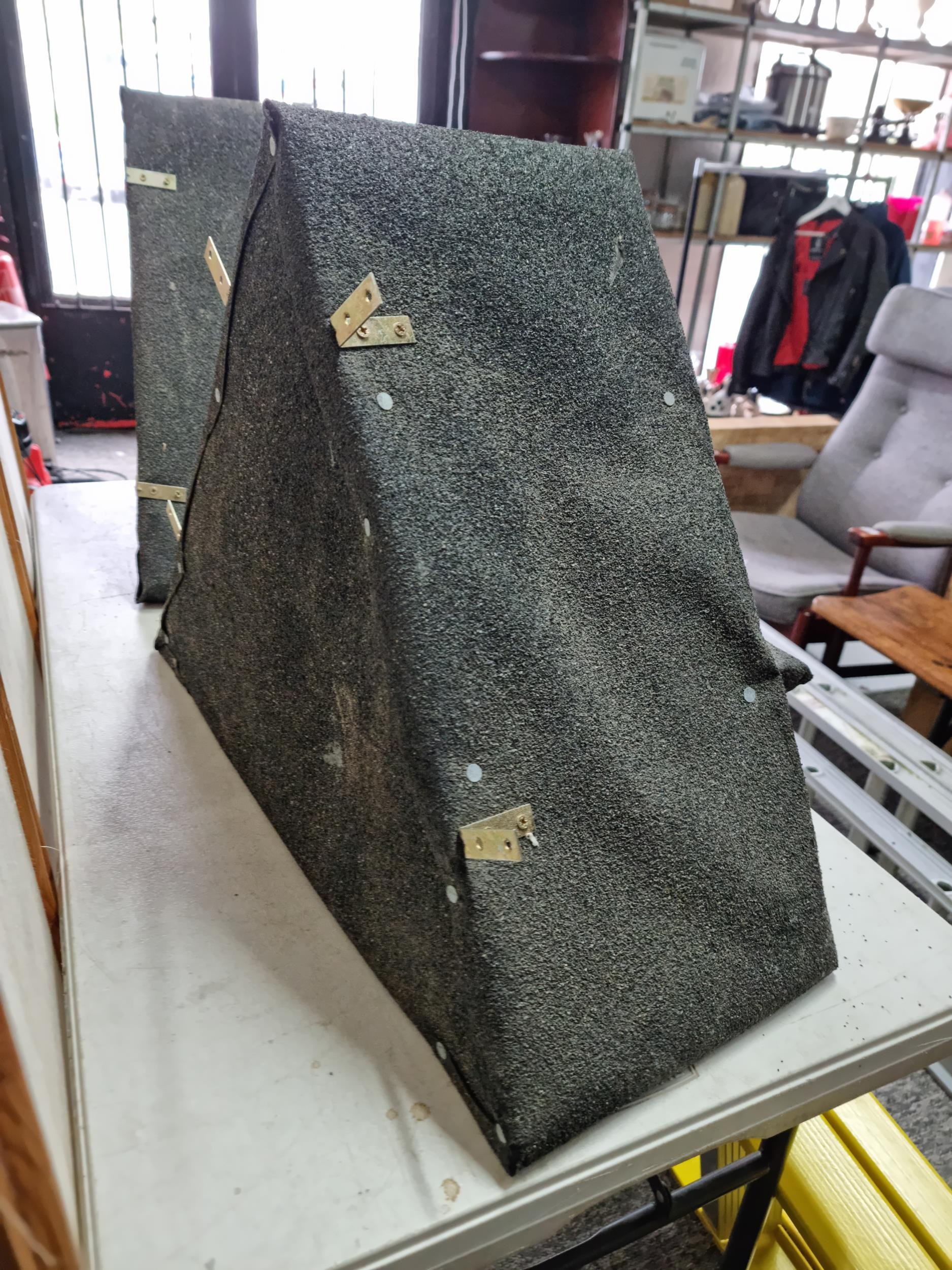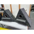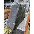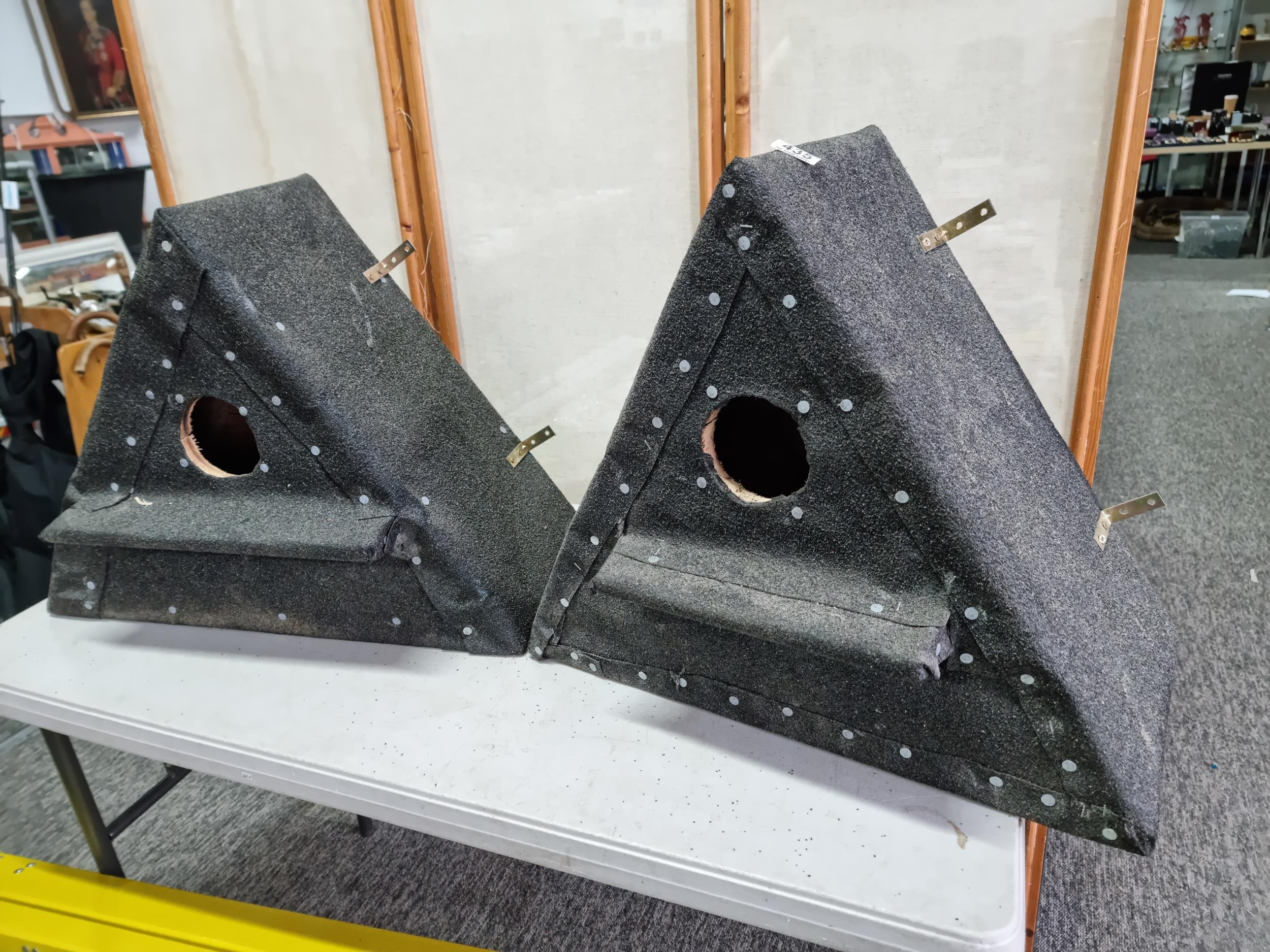 2x hand made triangular bird boxes all weather proofed in roof felt having a hole to the centre with a small shelf fitted with wall brackets, a height of 50cm high length 64cm depth 28cm